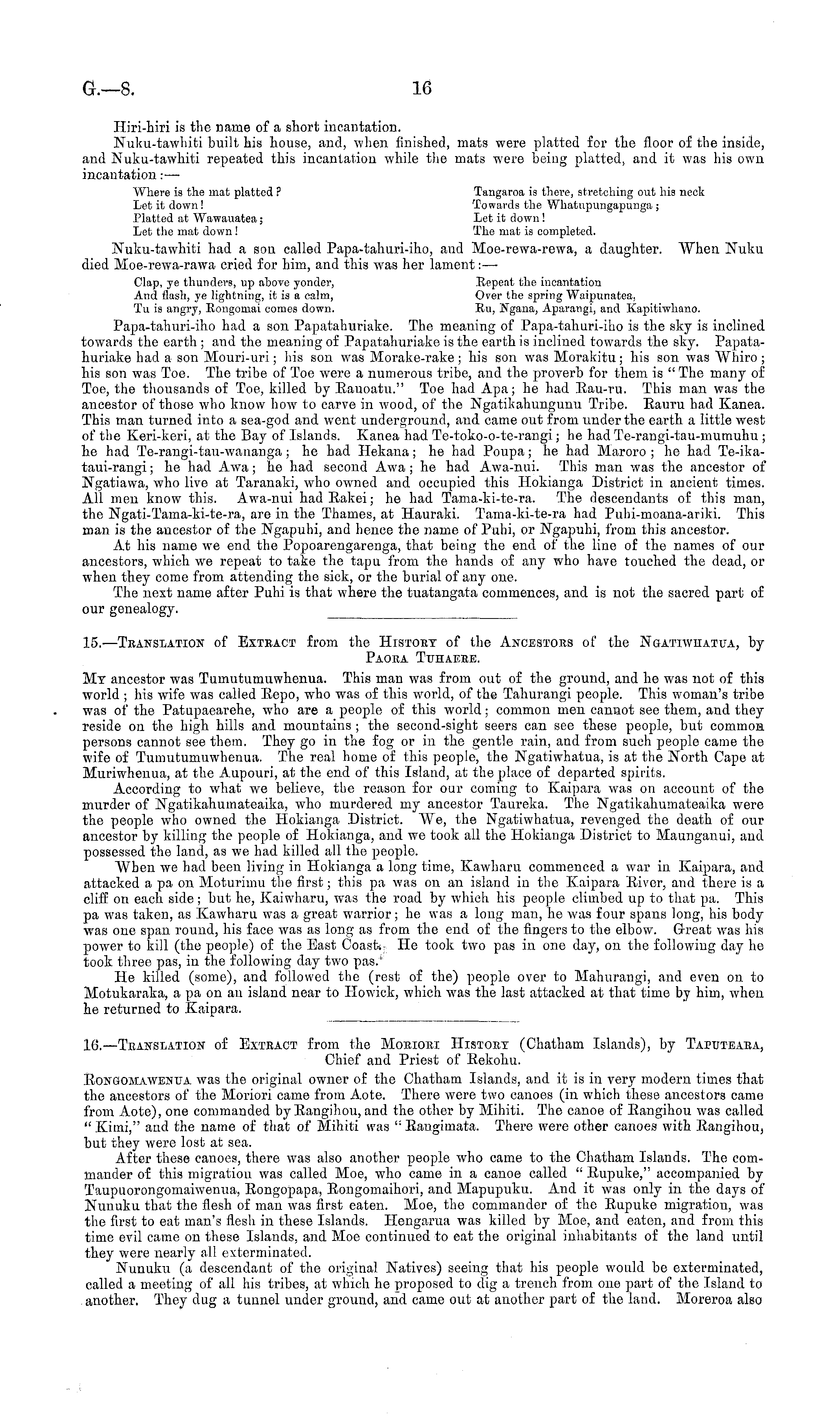15. —Translation of Extract from the History of the Ancestors of the Ngatiwhatua, by Paoea Tuhaere. My ancestor was Tumutumuwhenua. This man was from out of the ground, and he was not of this world ; his wife was called Eepo, who was of this world, of the Tahurangi people. This woman's tribe was of the Patupaearehe, who are a people of this world; common men cannot see them, and they reside on the high hills and mountains ; the second-sight seers can see these people, but common persons cannot see them. They go in the fog or in the gentle rain, and from such people came the wife of Tumutumuwhenua. The real home of this people, the Ngatiwhatua, is at the North Cape at Muriwhenua, at the Aupouri, at the end of this Island, at the place of departed spirits. According to what we believe, the reason for our coming to Kaipara was on account of the murder of Ngatikahumateaika, who murdered my ancestor Taureka. The Ngatikahumateaika were the people who owned the Hokianga District. We, the Ngatiwhatua, revenged the death of our ancestor by killing the people of Hokianga, and we took all the Hokianga District to Maunganui, and possessed the land, as we had killed all the people. When we had been living in Hokianga a long time, Kawharu commenced a war in Kaipara, and attacked apa on Moturimu the first; this pa was on an island in the Kaipara River, and there is a cliff on each side; but he, Kaiwharu, was the road by which his people climbed up to that pa. This pa was taken, as Kawharu was a great warrior; he was a long man, he was four spans long, his body was one span round, his face was as long as from the end of the fingers to the elbow. Great was his power to kill (the people) of the East Coast. He took two pas in one day, on the following day he took three pas, in the following day two pas. He killed (some), and followed the (rest of the) people over to Mahurangi, and even on to Motukaraka, a pa on au island near to Howick, which was the last attacked at that time by him, when he returned to Kaipara. 16.—Translation of Extract from the Moriori History (Chatham Islands), by Taputeara, Chief and Priest of Eekohu. Bongomawenua was the original owner of the Chatham Islands, and it is in very modern times that the ancestors of the Moriori came from Aote. There were two canoes (in which these ancestors came from Aote), one commanded by Rangihou, and the other by Mihiti. The canoe of Eangihou was called " Kimi," and the name of that of Mihiti was " Rangimata. There were other canoes with Rangihou, but they were lost at sea. After these canoes, there was also another people who came to the Chatham Islands. The commander of this migration was called Moe, who came in a canoe called " Rupuke," accompanied by Taupuorongomaiwenua, Rongopapa, Rongomaihori, and Mapupuku. And it was only in the days of Nunuku that the flesh of man was first eaten. Moe, the commander of the Rupuke migration, was the first to eat man's flesh in these Islands. Hengama was killed by Moe, and eaten, and from this time evil came on these Islands, and Moe continued to eat the original inhabitants of the land until they were nearly all exterminated. Nunuku (a descendant of the original Natives) seeing that his people would be exterminated, called a meeting of all his tribes, at which he proposed to dig a trench from one part of the Island to another. They dug a tunnel under ground, and came out at another part of the land. Moreroa also