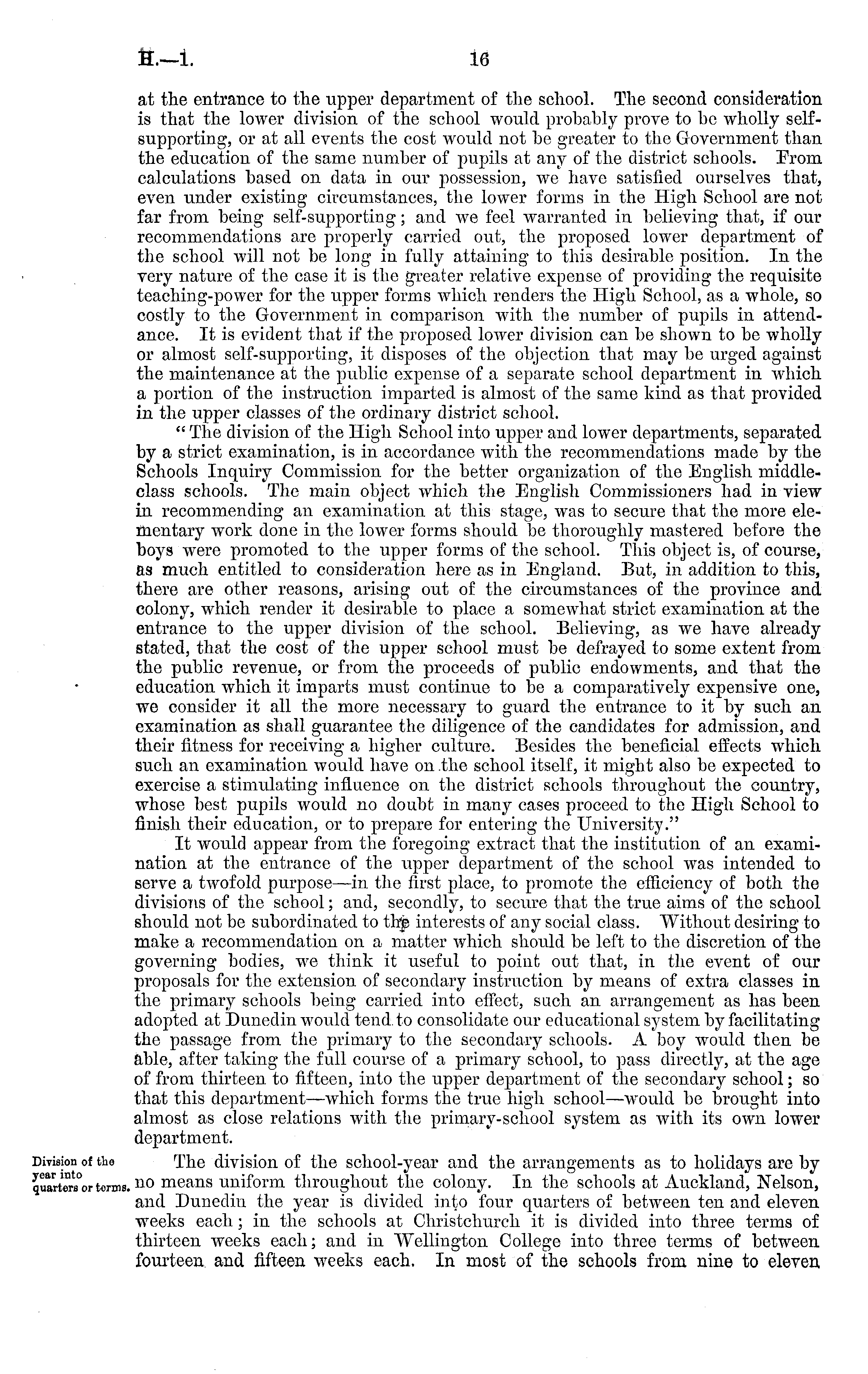 at the entrance to the upper department of the school. The second consideration is that the lower division of the school would probably prove to be wholly selfsupporting, or at all events the cost would not be greater to the Government than the education of the same number of pupils at any of the district schools. Prom calculations based on data in our possession, we have satisfied ourselves that, even under existing circumstances, the lower forms in the High School are not far from being self-supporting; and we feel warranted in believing that, if our recommendations are properly carried out, the proposed lower department of the school will not be long in fully attaining to this desirable position. In the very nature of the case it is the greater relative expense of providing the requisite teaching-power for the upper forms which renders the High School, as a whole, so costly to the Government in comparison with the number of pupils in attendance. It is evident that if the proposed lower division can be shown to be wholly or almost self-supporting, it disposes of the objection that may be urged against the maintenance at the public expense of a separate school department in which a portion of the instruction imparted is almost of the same kind as that provided in the upper classes of the ordinary district school. " The division of the High School into upper and lower departments, separated by a strict examination, is in accordance with the recommendations made by the Schools Inquiry Commission for the better organization of the English middleclass schools. The main object which the English Commissioners had in view in recommending an examination at this stage, was to secure that the more elementary work done in the lower forms should be thoroughly mastered before the boys were promoted to the upper forms of the school. This object is, of course, as much entitled to consideration here as in England. But, in addition to this, there are other reasons, arising out of the circumstances of the province and colony, which render it desirable to place a somewhat strict examination at the entrance to the upper division of the school. Believing, as we have already stated, that the cost of the upper school must be defrayed to some extent from the public revenue, or from the proceeds of public endowments, and that the education which it imparts must continue to be a comparatively expensive one, we consider it all the more necessary to guard the entrance to it by such an examination as shall guarantee the diligence of the candidates for admission, and their fitness for receiving a higher culture. Besides the beneficial effects which such an examination would have on the school itself, it might also be expected to exercise a stimulating influence on the district schools throughout the country, whose best pupils would no doubt in many cases proceed to the High School to finish their education, or to prepare for entering the University." It would appear from the foregoing extract that the institution of an examination at the entrance of the upper department of the school was intended to serve a twofold purpose—in the first place, to promote the efficiency of both the divisions of the school; and, secondly, to secure that the true aims of the school should not be subordinated to the interests of any social class. Without desiring to make a recommendation on a matter which should be left to the discretion of the governing bodies, we think it useful to point out that, in the event of our proposals for the extension of secondary instruction by means of extra classes in the primary schools being carried into effect, such an arrangement as has been adopted at Dunedin would tend to consolidate our educational system by facilitating the passage from the primary to the secondary schools. A boy would then be able, after taking the full course of a primary school, to pass directly, at the age of from thirteen to fifteen, into the upper department of the secondary school; so that this department—which forms the true high school —would be brought into almost as close relations with the primary-school system as with its own lower department. The division of the school-year and the arrangements as to holidays arc by no means uniform throughout the colony. In the schools at Auckland, Nelson, and Dunedin the year is divided into four quarters of between ten and eleven weeks each; in the schools at Christchurch it is divided into three terms of thirteen weeks each; and in Wellington College into three terms of between fourteen, and fifteen weeks each. In most of the schools from nine to eleven
