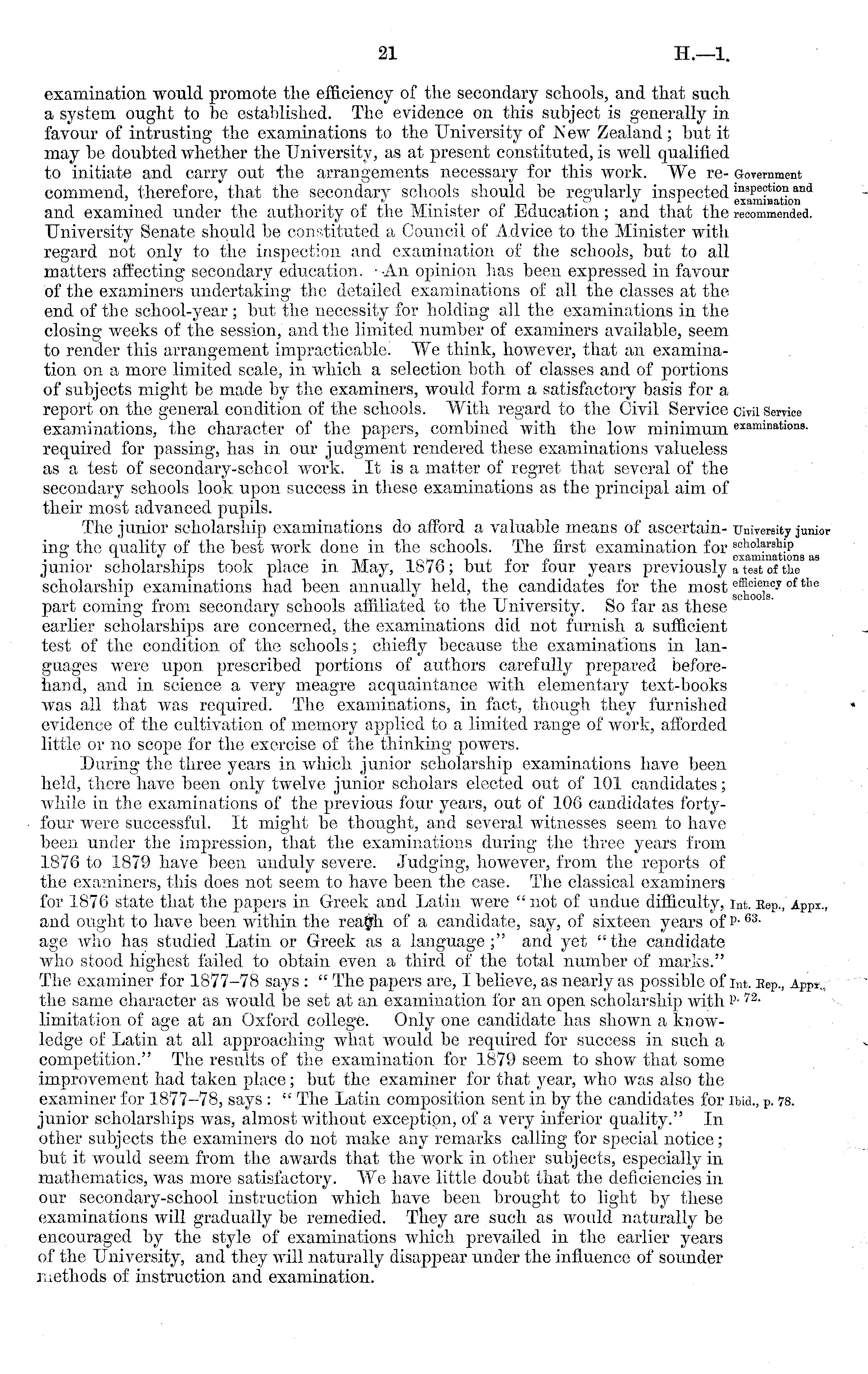 examination would promote the efficiency of the secondary schools, and that such a system ought to be established. The evidence on this subject is generally in favour of intrusting the examinations to the University of New Zealand; but it may be doubted whether the University, as at present constituted, is well qualified to initiate and carry out the arrangements necessary for this work. We recommend, therefore, that the secondary schools should be regularly inspected and examined under the authority of the Minister of Education; and that the University Senate should be constituted a Council of Advice to the Minister with regard not only to the inspection and examination of the schools, but to all matters affecting secondary ediication. An opinion lias been expressed in favour of the examiners undertaking the detailed examinations of all the classes at the end of the school-year ; but the necessity for holding all the examinations in the closing weeks of the session, and the limited number of examiners available, seem to render this arrangement impracticable. We think, however, that an examination on a more limited scale, in which a selection both of classes and of portions of subjects might be made by the examiners, would form a satisfactory basis for a report on the general condition of the schools. With regard to the Civil Service examinations, the character of the papers, combined with the low minimum required for passing, has in our judgment rendered these examinations valueless as a test of secondary-schcol work. It is a matter of regret that several of the secondary schools look upon success in these examinations as the principal aim of their most advanced pupils. The junior scholarship examinations do afford a valuable means of ascertaining' the quality of the best work done in the schools. The first examination for .. i i " i ■ j_i t • -ir -ini~r> i j_ !• o i junior scholarships took place in May, 18/6; but tor tour years previously scholarship examinations had been annually held, the candidates for the most part coming from secondary schools affiliated to the University. So far as these earlier scholarships are concerned, the examinations did not furnish a sufficient test of the condition of the schools; chiefly because the examinations in languages were upon prescribed portions of authors carefully prepared beforehand, and in science a very meagre acquaintance with elementary text-books was all that was required. The examinations, in fact, though they furnished evidence of the cultivation of memory applied to a limited range of work, afforded little or no scope for the exercise of the thinking powers. During the three years in which junior scholarship examinations have been held, there have been only twelve junior scholars elected out of 101 candidates; while in the examinations of the previous four years, out of 106 candidates fortyfour were successful. It might be thought, and several witnesses seem to have been under the impression, that the examinations during the three years from 1876 to 1879 have been unduly severe. Judging, however, from the reports of the examiners, this does not seem to have been the case. The classical examiners for 1876 state that the papers in Greek and Latin were "not of undue difficulty, and ought to have been within the rea£h of a candidate, say, of sixteen years of age who has studied Latin or Greek as a language;" and yet " the candidate who stood highest failed to obtain even a third of the total number of marks." The examiner for 1877-78 says : "The papers are, 1 believe, as nearly as possible of the same character as would be set at an examination for an open scholarship with limitation of age at an Oxford college. Only one candidate has shown a knowledge of Latin at all approaching what would be required for success in such a competition." The results of the examination for 1879 seem to show that some improvement had taken place; but the examiner for that year, who was also the examiner for 1877-78, says : " The Latin composition sent in by the candidates for junior scholarships was, almost Avithout exception, of a very inferior quality." In other subjects the examiners do not make any remarks calling for special notice; but it would seem from the awards that the work in other subjects, especially in mathematics, was more satisfactory. We have little doubt that the deficiencies in our secondary-school instruction which have been brought to light by these examinations will gradually be remedied. They are such as would naturally be encouraged by the style of examinations which prevailed in the earlier years of the University, and they will naturally disappear under the influence of sounder methods of instruction and examination.