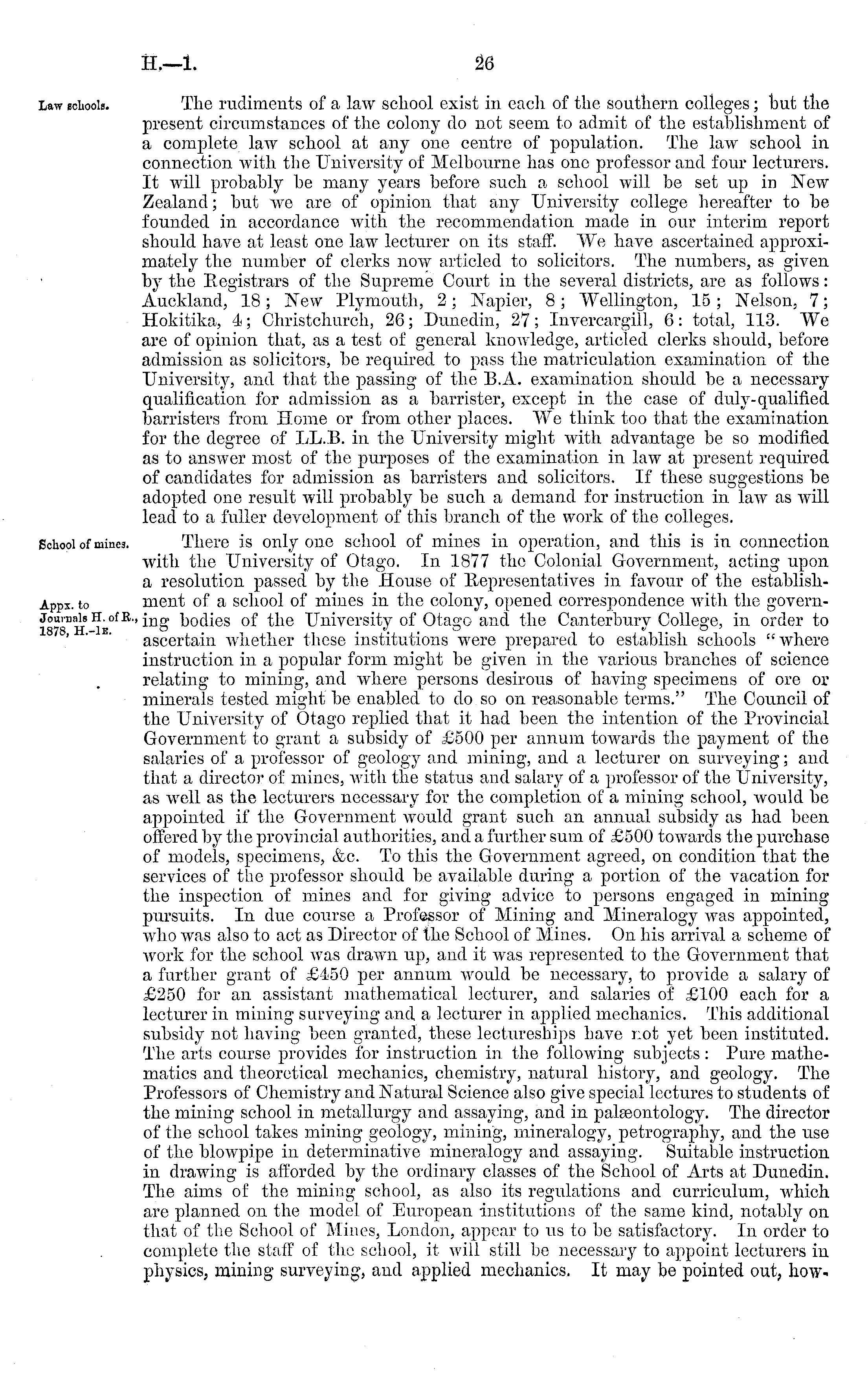 The rudiments of a law school exist in each of the southern colleges; but the present circumstances of the colony do not seem to admit of the establishment of a complete law school at any one centre of population. The law school in connection with the University of Melbourne has one professor and four lecturers. It will probably be many years before such a school will be set up in New Zealand; but we are of opinion that any University college hereafter to be founded in accordance with the recommendation made in our interim report should have at least one law lecturer on its staff. We have ascertained approximately the number of clerks now articled to solicitors. The numbers, as given by the Registrars of the Supreme Court in the several districts, are as follows: Auckland, 18; New Plymouth, 2; Napier, 8; Wellington, 15 ; Nelson, 7; ilokitika, 4; Christchurch, 26; Dunedin, 27; Invercargill, 6: total, 113. We are of opinion that, as a test of general knowledge, articled clerks should, before admission as solicitors, be required to pass the matriculation examination of the University, and that the passing of the B.A. examination should be a necessary qualification for admission as a barrister, except in the case of duly-qualified barristers from Home or from other places. We think too that the examination for the degree of LL.B. in the University might with advantage be so modified as to answer most of the purposes of the examination in law at present required of candidates for admission as barristers and solicitors. If these suggestions be adopted one result will probably be such a demand for instruction in law as will lead to a fuller development of this branch of the work of the colleges. There is only one school of mines in operation, and this is in connection with, the University of Otago. In 1877 the Colonial Government, acting upon a resolution passed by the House of Representatives in favour of the establishment of a school of mines in the colony, opened correspondence with the governing bodies of the University of Otago and the Canterbury College, in order to ascertain whether these institutions were prepared to establish schools "where instruction in a popular form might be given in the various branches of science relating to mining, and where persons desirous of having specimens of ore or minerals tested might be enabled to do so on reasonable terms." The Council of the University of Otago replied that it had been the intention of the Provincial Government to grant a subsidy of £500 per annum towards the payment of the salaries of a professor of geology and mining, and a lecturer on surveying; and that a director of mines, with, the status and salary of a professor of the University, as well as the lecturers necessary for the completion of a mining school, would be appointed if the Government would grant such an annual subsidy as had been offered by the provincial authorities, and a further sum of £500 towards the purchase of models, specimens, &c. To this the Government agreed, on condition that the services of the professor should be available during a portion of the vacation for the inspection of mines and for giving advice to persons engaged in mining pursuits. In due course a Professor of Mining and Mineralogy was appointed, who was also to act as Director of the School of Mines. On his arrival a scheme of work for the school was drawn up, and it was represented to the Government that a further grant of £450 per annum, would be necessary, to provide a salary of £250 for an assistant mathematical lecturer, and salaries of £100 each for a lecturer in mining surveying and a lecturer in applied mechanics. This additional subsidy not having been granted, these lectureships have rot yet been instituted. The arts course provides for instruction in the following subjects: Pure mathematics and theoretical mechanics, chemistry, natural history, and geology. The Professors of Chemistry and Natural Science also give special lectures to students of the mining school in metallurgy and assaying, and in palaeontology. The director of the school takes mining geology, mining, mineralogy, petrography, and the use of the blowpipe in determinative mineralogy and assaying. Suitable instruction in drawing is afforded by the ordinary classes of the School of Arts at Dunedin. The aims of the mining school, as also its regulations and curriculum, which are planned on the model of European, institutions of the same kind, notably on that of the School of Mines, London, appear to us to be satisfactory. In order to complete the staff of the school, it will still be necessary to appoint lecturers in physics, mining surveying, and applied mechanics. It may be pointed out, how-