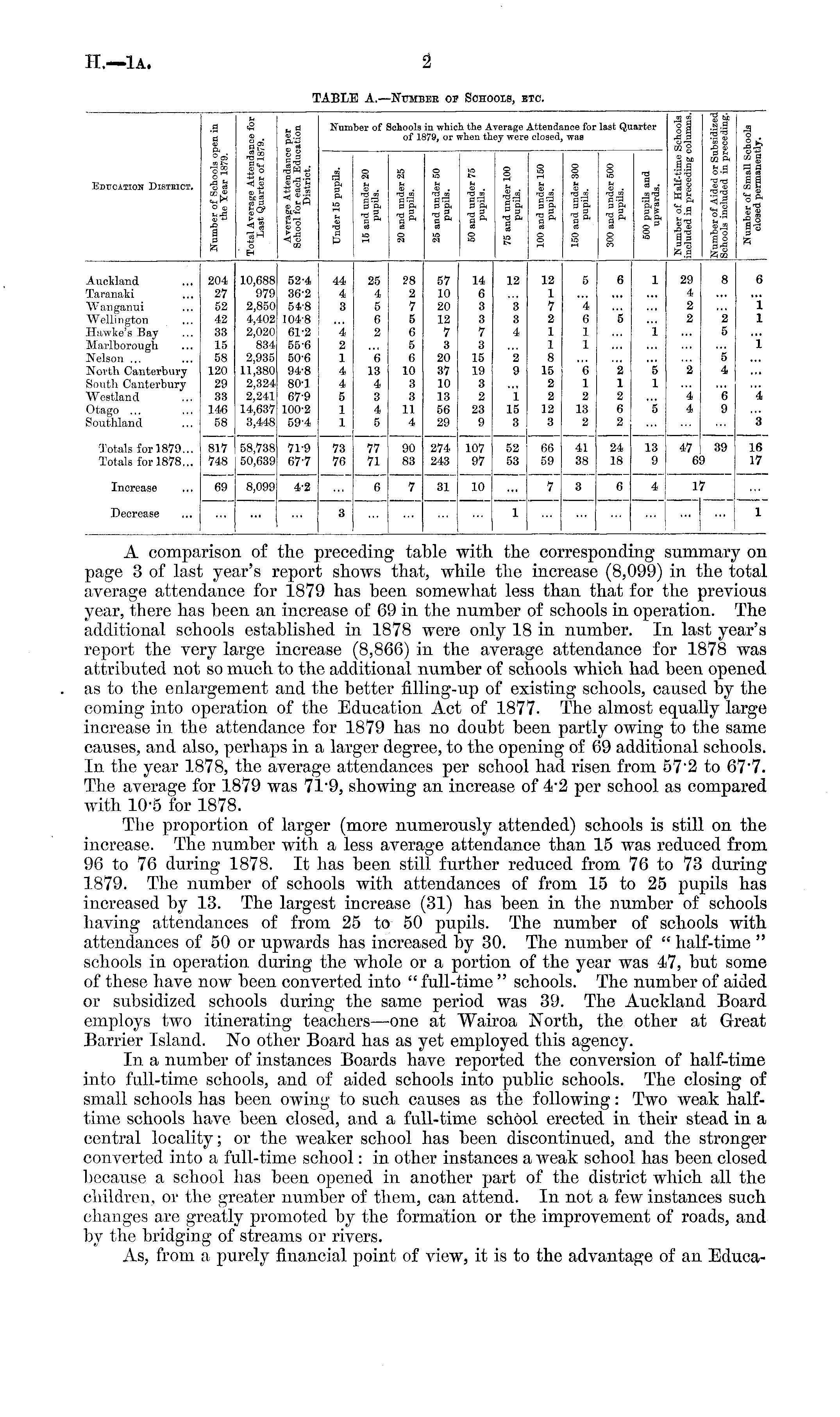 A comparison of the preceding table with the corresponding summary on page 3 of last year's report shows that, while the increase (8,099) in the total average attendance for 1879 has been somewhat less than that for the previous year, there has been an increase of 69 in the number of schools in operation. The additional schools established in 1878 were only 18 in number. In last year's report the very large increase (8,866) in the average attendance for 1878 was attributed not so much to the additional number of schools which had been opened as to the enlargement and the better filling-up of existing schools, caused by the coming into operation of the Education Act of 1877. The almost equally large increase in the attendance for 1879 has no doubt been partly owing to the same causes, and also, perhaps in a larger degree, to the opening of 69 additional schools. In the year 1878, the average attendances per school had risen from 57'2 to 67'7. The average for 1879 was 71'9, showing an increase of 4"2 per school as compared with 10-5 for 1878. The proportion of larger (more numerously attended) schools is still on the increase. The number with a less average attendance than 15 was reduced from 96 to 76 during 1878. It has been still further reduced from 76 to 73 during 1879. The number of schools with attendances of from 15 to 25 pupils has increased by 13. The largest increase (31) has been in the number of schools having attendances of from 25 to 50 pupils. The number of schools with attendances of 50 or upwards has increased by 30. The number of " half-time " schools in operation during the whole or a portion of the year was 47, but some of these have now been converted into " full-time " schools. The number of aided or subsidized schools during the same period was 39. The Auckland Board employs two itinerating teachers —one at Wairoa North, the other at Great Barrier Island. No other Board has as yet employed this agency. In a number of instances Boards have reported the conversion of half-time into full-time schools, and of aided schools into public schools. The closing of small schools has been owing to such causes as the following: Two weak halftime schools have been closed, and a full-time school erected in their stead in a central locality; or the weaker school has been discontinued, and the stronger converted into a full-time school: in other instances a weak school has been closed because a school has been opened in another part of the district which all the children, or the greater number of them, can attend. In not a few instances such changes are greatly promoted by the formation or the improvement of roads, and by the bridging of streams or rivers. As, from a purely financial point of view, it is to the advantage of an Educa-