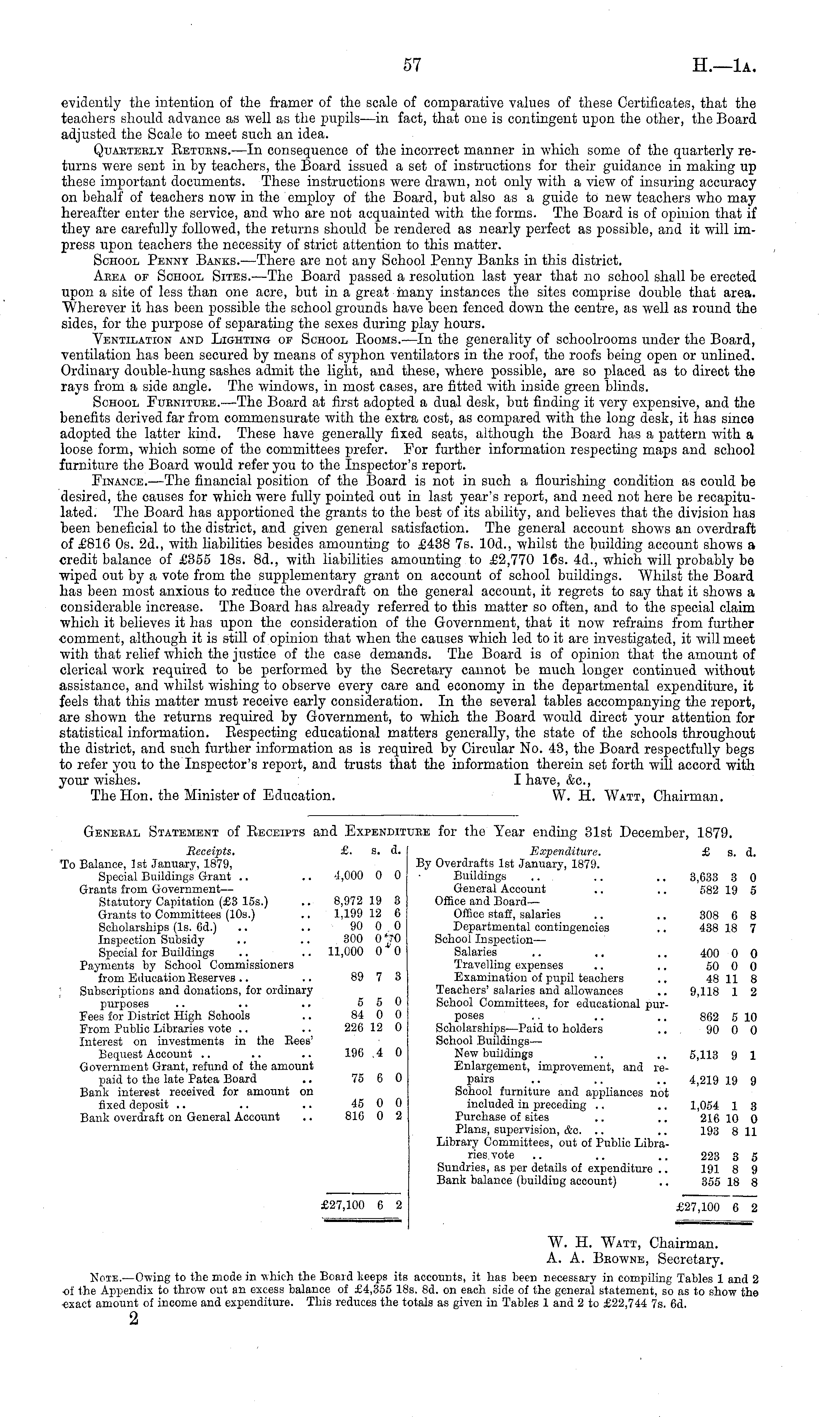 General Statement of Receipts and Expenditure for the Year ending 31st December, 1879. Receipts. £. s. d. Expenditure. £ s. d. To Balance, Ist January, 1879, By Overdrafts Ist January, 1879. Special Buildings Grant .. .. 4,000 0 0 Buildings .. .. .. 3,633 3 0 Grants from Government — General Account .. .. 582 19 5 Statutory Capitation (£3 155.) .. 8,972 19 3 Office and BoardGrants to Committees (10s.) .. 1,199 12 6 Office staff, salaries .. .. 308 6 8 Scholarships (Is. 6d.) .. .. 90 0 0 Departmental contingencies .. 438 18 7 Inspection Subsidy .. .. 300 0""0 School Inspection— Special for Buildings .. .. 11,000 0 0 Salaries .. .. .. 400 0 0 Payments by School Commissioners Travelling expenses .. .. 50 0 0 from Education Eeserves.. .. 89 7 3 Examination of pupil teachers .. 48 11 8 Subscriptions and donations, for ordinary Teachers' salaries and allowances .. 9,118 1 2 purposes .. .. .. 5 5 0 School Committees, for educational purFees for District High Schools .. 84 0 0 poses .. .. .. 862 5 10 From Public Libraries vote .. .. 226 12 0 Scholarships—Paid to holders .. 90 0 0 Interest on investments in the Eees' School Buildings— Bequest Account .. .. .. 196 4 0 New buildings .. .. 5,113 9 1 Government Grant, refund of the amount Enlargement, improvement, and repaid to the late Patea Board .. 75 6 0 pairs .. .. .. 4,219 19 9 Bank interest received for amount on School furniture and appliances not fixed deposit .. .. .. 45 0 0 included in preceding .. .. 1,054 1 3 Bank overdraft on General Account .. 816 0 2 Purchase of sites .. .. 216 10 0 Plans, supervision, &c. .. .. 193 8 11 Library Committees, out of Public Libraries vote .. .. .. 223 3 5 Sundries, as per details of expenditure .. 191 8 9 Bank balance (building account) .. 355 18 8 £27,100 6 2 £27,100 6 2 W. H. Watt, Chairman. A. A. Browne, Secretary. Note.—Owing to the mode in which the Board keeps its accounts, it has been necessary in compiling Tables 1 and 2 of the Appendix to throw out an excess balance of £4,355 18s. Bd. on each side of the general statement, so as to show the •exact amount of income and expenditure. This reduces the totals as given in Tables 1 and 2to £22,744 7s. 6d. 2