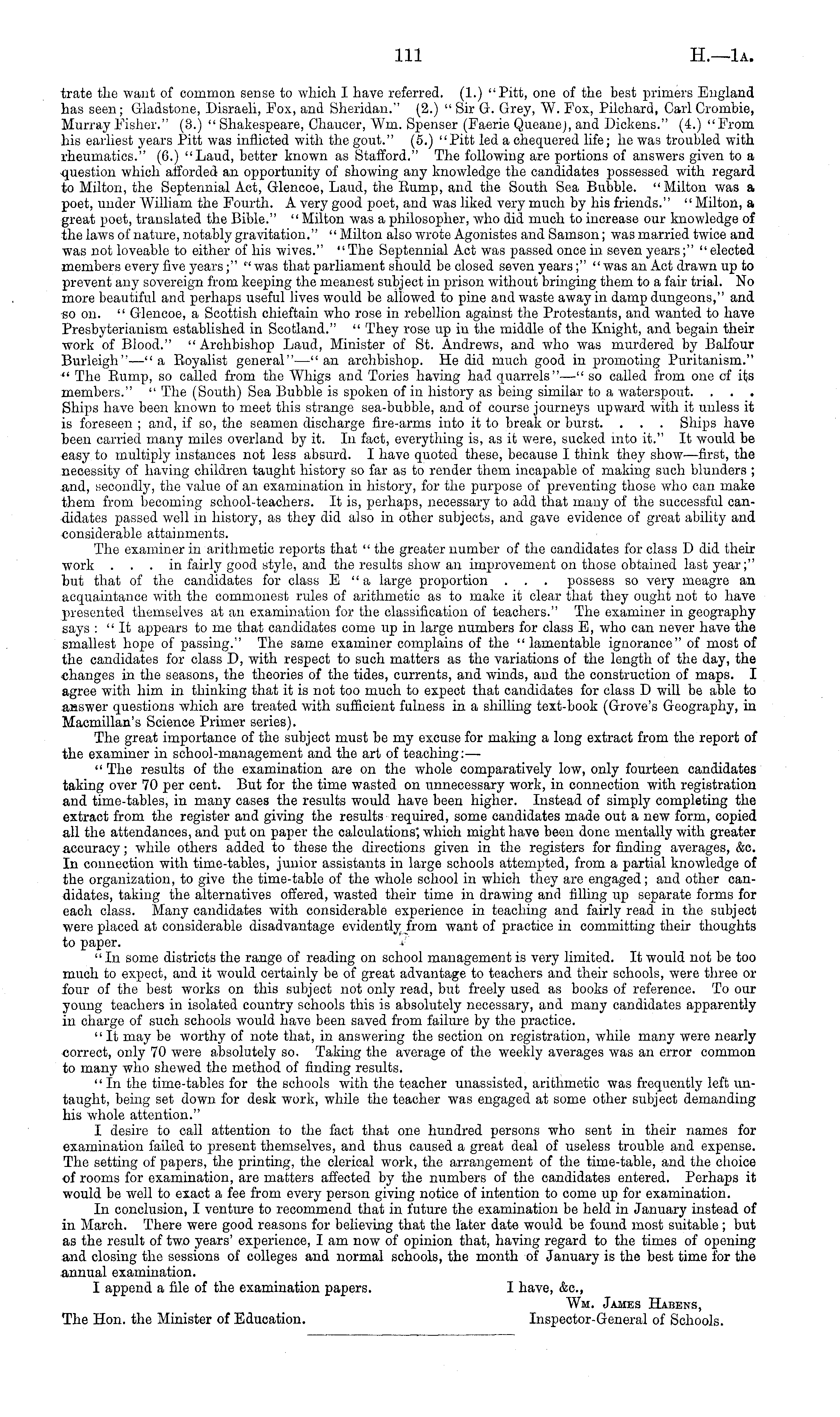 trate the want of common sense to which I have referred. (1.) "Pitt, one of the best primers England has seen; Gladstone, Disraeli, Fox, and Sheridan." (2.) " Sir G. Grey, W. Fox, Pilchard, Carl Crombie, Murray Fisher." (3.) " Shakespeare, Chaucer, Wm. Spenser (Faerie Queane), and Dickens." (4.) "From his earliest years Pitt was inflicted with the gout." (5.) "Pitt led a chequered life; he was troubled with rheumatics." (6.) "Laud, better known as Stafford." The following are portions of answers given to a ■question which afforded an opportunity of showing any knowledge the candidates possessed with regard to Milton, the Septennial Act, Glencoe, Laud, the Rump, and the South Sea Bubble. "Milton was a poet, under William the Fourth. A very good poet, and was liked very much by his friends." " Milton, a great poet, translated the Bible." "Milton was a philosopher, who did much to increase our knowledge of the laws of nature, notably gravitation." " Milton also wrote Agonistes and Samson; was married twice and was not loveable to either of his wives." "The Septennial Act was passed once in seven years;" " elected members every five years;" " was that parliament should be closed seven years;" "was an Act drawn up to prevent any sovereign from keeping the meanest subject in prison without bringing them to a fair trial. No more beautiful and perhaps useful lives would be allowed to pine and waste away in damp dungeons," and so on. " Glencoe, a Scottish chieftain who rose in rebellion against the Protestants, and wanted to have Presbyterianism established in Scotland." " They rose up in the middle of the Knight, and begain their work of Blood." " Archbishop Laud, Minister of St. Andrews, and who was murdered by Balfour Burleigh"—"a Royalist general"—"an archbishop. He did much good in promoting Puritanism." " The Rump, so called from the Whigs and Tories having had quarrels"—" so called from one cf its members." " The (South) Sea Bubble is spoken of in history as being similar to a waterspout. . . . Ships have been known to meet this strange sea-bubble, and of course journeys upward with it unless it is foreseen ; and, if so, the seamen discharge fire-arms into it to break or burst. . . . Ships have been carried many miles overland by it. In fact, everything is, as it were, sucked into it." It would be easy to multiply instances not less absurd. I have quoted these, because I think they show—first, the necessity of having children taught history so far as to render them incapable of making such blunders ; and, secondly, the value of an examination in history, for the purpose of preventing those who can make them from becoming school-teachers. It is, perhaps, necessary to add that many of the successful candidates passed well m history, as they did also in other subjects, and gave evidence of great ability and considerable attainments. The examiner in arithmetic reports that " the greater number of the candidates for class D did their work ... in fairly good style, and the results show an improvement on those obtained last year;" hut that of the candidates for class E "a large proportion . . . possess so very meagre an acquaintance with the commonest rules of arithmetic as to make it clear that they ought not to have presented themselves at an examination for the classification of teachers." The examiner in geography says : "It appears to me that candidates come up in large numbers for class E, who can never have the smallest hope of passing." The same examiner complains of the "lamentable ignorance" of most of the candidates for class D, with respect to such matters as the variations of the length of the day, the changes in the seasons, the theories of the tides, currents, and winds, and the construction of maps. I agree with him in thinking that it is not too much to expect that candidates for class D will be able to answer questions which are treated with sufficient fulness in a shilling text-book (Grove's Geography, in Macmillan's Science Primer series). The great importance of the subject must be my excuse for making a long extract from the report of the examiner in school-management and the art of teaching:— " The results of the examination are on the whole comparatively low, only fourteen candidates taking over 70 per cent. But for the time wasted on unnecessary work, in connection with registration and time-tables, in many cases the results would have been higher. Instead of simply completing the extract from the register and giving the results required, some candidates made out a new form, copied all the attendances, and put on paper the calculations, which might have been done mentally with greater accuracy; while others added to these the directions given in the registers for finding averages, &c. In connection with time-tables, junior assistants in large schools attempted, from a partial knowledge of the organization, to give the time-table of the whole school in which they are engaged; and other candidates, taking the alternatives offered, wasted their time in drawing and filling up separate forms for each class. Many candidates with considerable experience in teaching and fairly read in the subject were placed at considerable disadvantage evidently from want of practice in committing their thoughts to paper. "In some districts the range of reading on school management is very limited. It would not be too much to expect, and it would certainly be of great advantage to teachers and their schools, were three or four of the best works on this subject not only read, but freely used as books of reference. To our young teachers in isolated country schools this is absolutely necessary, and many candidates apparently in charge of such schools would have been saved from failure by the practice. " It may be worthy of note that, in answering the section on registration, while many were nearly correct, only 70 were absolutely so. Taking the average of the weekly averages was an erro