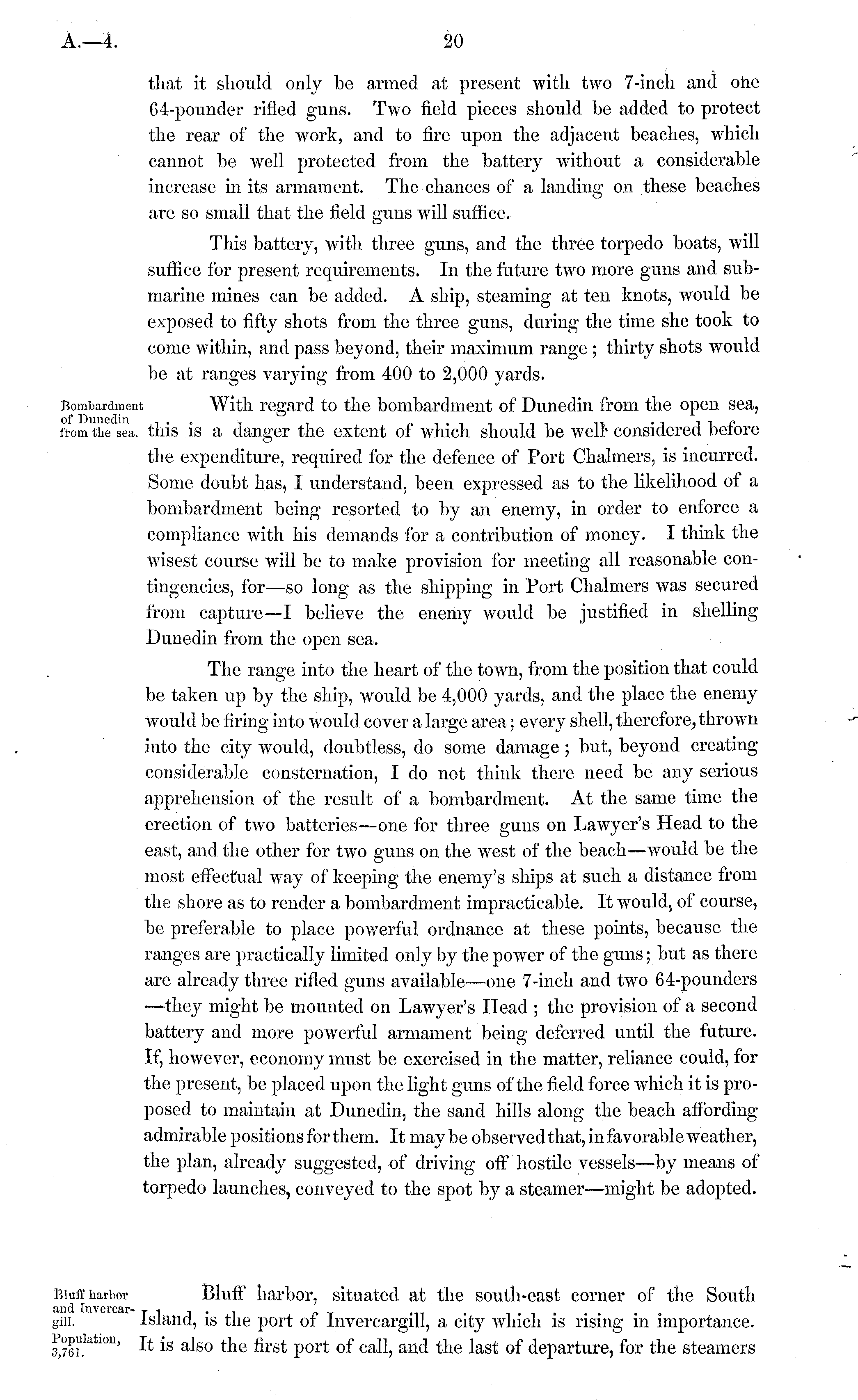 that it should only be armed at present with two 7-inch and one 64-pounder rifled guns. Two field pieces should be added to protect the rear of the work, and to fire upon the adjacent beaches, which cannot be well protected from the battery without a considerable increase in its armament. The chances of a landing on these beaches are so small that the field guns will suffice. This battery, with three guns, and the three torpedo boats, will suffice for present requirements. In the future two more guns and submarine mines can be added. A ship, steaming at ten knots, would be exposed to fifty shots from the three guns, during the time she took to come within, and pass beyond, their maximum range ; thirty shots would be at ranges varying from 400 to 2,000 yards. With regard to the bombardment of Dunedin from the open sea, this is a danger the extent of which should be well* considered before the expenditure, required for the defence of Port Chalmers, is incurred. Some doubt has, I understand, been expressed as to the likelihood of a bombardment being resorted to by an enemy, in order to enforce a compliance with his demands for a contribution of money. I think the wisest course will be to make provision for meeting all reasonable contingencies, for—so long as the shipping in Port Chalmers was secured from capture —I believe the enemy would be justified in shelling Dunedin from the open sea. The range into the heart of the town, from the position that could be taken up by the ship, would be 4,000 yards, and the place the enemy would be filing into would cover a large area; every shell, therefore, thrown into the city would, doubtless, do some damage ; but, beyond creating considerable consternation, I do not think there need be any serious apprehension of the result of a bombardment. At the same time the erection of two batteries—one for three guns on Lawyer's Head to the east, and the other for two guns on the west of the beach—would be the most effectual way of keeping the enemy's ships at such a distance from the shore as to render a bombardment impracticable. It would, of course, be preferable to place powerful ordnance at these points, because the ranges are practically limited only by the power of the guns; but as there are already three rifled guns available —one 7-inch and two 64-pounders —they might be mounted on Lawyer's Head ; the provision of a second battery and more powerful armament being deferred until the future. If, however, economy must be exercised in the matter, reliance could, for the present, be placed upon the light guns of the field force which it is proposed to maintain at Dunedin, the sand hills along the beach affording admirable positions for them. It may be observed that, in favorable weather, the plan, already suggested, of driving off hostile vessels —by means of torpedo launches, conveyed to the spot by a steamer —might be adopted. Bluff harbor, situated at the south-cast corner of the South Island, is the port of Invercargill, a city which is rising in importance. It is also the first port of call, and the last of departure, for the steamers