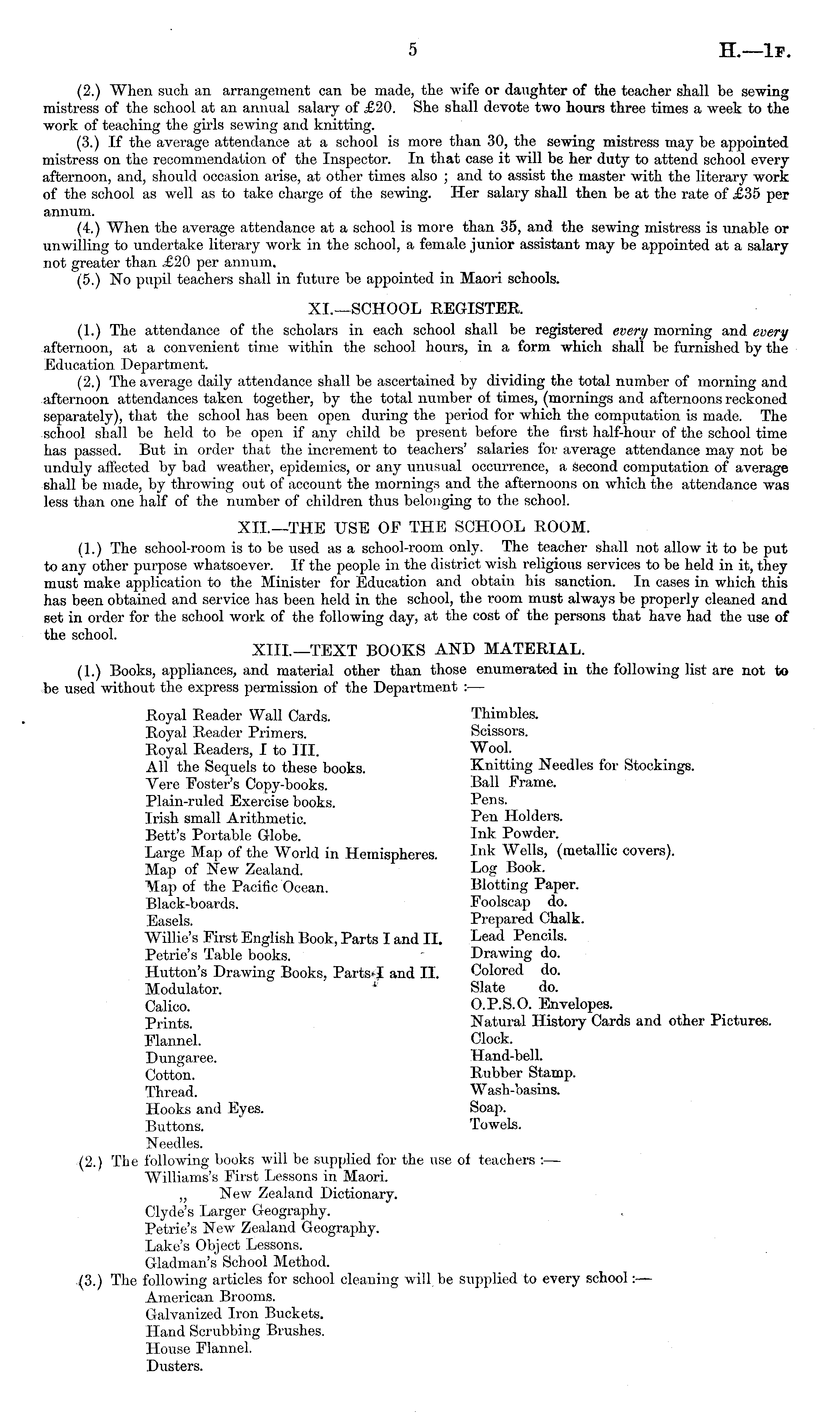 (2.) When such an arrangement can be made, the wife or daxighter of the teacher shall be sewing mistress of the school at an annual salary of £20. She shall devote two hours three times a week to the work of teaching the girls sewing and knitting. (3.) If the average attendance at a school is more than 30, the sewing mistress may be appointed mistress on the recommendation of the Inspector. In that case it will be her duty to attend school every afternoon, and, should occasion arise, at other times also ; and to assist the master with the literary work of the school as well as to take charge of the sewing. Her salary shall then be at the rate of .£35 per annum. (4.) When the average attendance at a school is more than 35, and the sewing mistress is unable or unwilling to undertake literary work in the school, a female junior assistant may be appointed at a salary not greater than £20 per annum. (5.) No pupil teachers shall in future be appointed in Maori schools. XI.—SCHOOL REGISTER. (1.) The attendance of the scholars in each school shall be registered every morning and every afternoon, at a convenient time within the school hours, in a form which shall be furnished by the Education Department. (2.) The average daily attendance shall be ascertained by dividing the total number of morning and afternoon attendances taken together, by the total number of times, (mornings and afternoons reckoned separately), that the school has been open during the period for which the computation is made. The school shall be held to be open if any child be present before the first half-hour of the school time has passed. But in order that the increment to teachers' salaries for average attendance may not be unduly affected by bad weather, epidemics, or any unusual occurrence, a second computation of average shall be made, by throwing out of account the mornings and the afternoons on which the attendance was less than one half of the number of children thus belonging to the school. XII.—THE USE OF THE SCHOOL ROOM. (1.) The school-room is to be used as a school-room only. The teacher shall not allow it to be put to any other purpose whatsoever. If the people in the district wish religious services to be held in it, they must make application to the Minister for Education and obtain his sanction. In cases in which this has been obtained and service has been held in the school, the room must always be properly cleaned and set in order for the school work of the following day, at the cost of the persons that have had the use of the school. XIII.—TEXT BOOKS AND MATERIAL. (1.) Books, appliances, and material other than those enumerated in the following list are not to be used without the express permission of the Department :— Royal Reader Wall Cards. Thimbles. Royal Reader Primers. Scissors. Royal Readers, I to 111. Wool. All the Sequels to these books. Knitting Needles for Stockings. Vere Foster's Copy-books. Ball Frame. Plain-ruled Exercise books. Pens. Irish small Arithmetic. Pen Holders. Bett's Portable Globe. Ink Powder. Large Map of the World in Hemispheres. Illk Wells, (metallic covers). Map of New Zealand. Log Book. Map of the Pacific Ocean. Blotting Paper. Black-boards. Foolscap do. Easels. Prepared Chalk. Willies First English Book, Parts I and 11, Lead Pencils. Petrie's Table books. Drawing do. Hutton's Drawing Books, Parts-1 and 11. Colored do. Modulator. Slate do. Calico. 0.P.5.0. Envelopes. Prints. Natural History Cards and other Pictures. Flannel. Clock. Dungaree. Hand-bell. Cotton. Rubber Stamp. Thread. Wash-basins. Hooks and Eyes. Soap. Buttons. Towels. Needles. (2.) The following books will be supplied for the use oi teachers :— Williams's First Lessons in Maori. ~ New Zealand Dictionary. Clyde's Larger Geography. Petrie's New Zealand Geography. Lake's Object Lessons. Gladman's School Method. (3.) The following articles for school cleaning will be supplied to every school:— American Brooms. Galvanized Iron Buckets. Hand Scrubbing Brushes. House Flannel. Dusters.