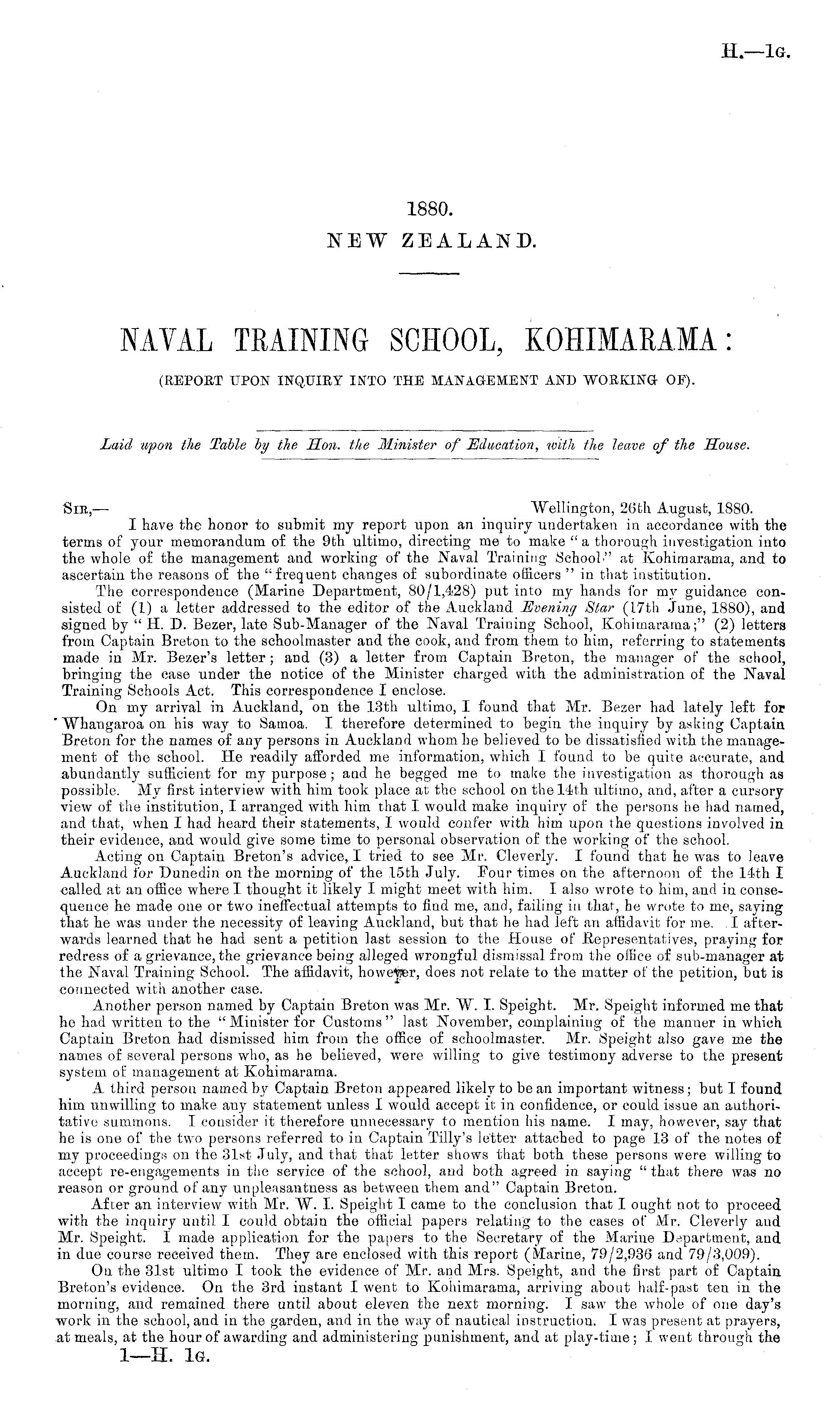Sic,— Wellington, 26th August, 1880. I have the honor to submit my report upon an inquiry undertaken in accordance with the terms of your memorandum of the 9th ultimo, directing me to make "a thorough investigation into the whole of the management and working of the Naval Training School" at Kohimarama, and to ascertain the reasons of the "frequent changes of subordinate officers " in that institution. The correspondence (Marine Department, 80/1,428) put into my hands for my guidance consisted of (1) a letter addressed to the editor of the Auckland Evening Star (17th June, 1880), and signed by " H. D. Bezer, late Sub-Manager of the Naval Training School, Kohimarama;" (2) letters from Captain Breton to the schoolmaster and the cook, and from them to him, referring to statements made in Mr. Bezer's letter; and (3) a letter from Captain Breton, the manager of the school, bringing the case under the notice of the Minister charged with the administration of the Naval Training Schools Act. This correspondence I enclose. On my arrival in Auckland, on the 13th ultimo, I found that Mr. Bezer had lately left for " Whaugaroa on his way to Samoa. I therefore determined to begin the inquiry by asking Captain Breton for the names of any persons in Auckland whom he believed to be dissatisfied with the management of the school. He readily afforded me information, which I found to be quite accurate, and abundantly sufficient for my purpose ; and he begged me to make the investigation as thorough as possible. My first interview with him took place at the school on the 14th ultimo, and, after a cursory view of the institution, I arranged with him that I would make inquiry of the persons he had named, and that, when I had heard their statements, I would confer with him upon the questions involved in their evidence, and would give some time to personal observation of the working of the school. Acting on Captain Breton's advice, I tried to see Mr. Cleverly. I found that he was to leave Auckland for Dunedin on the morning of the 15th July. Four times on the afternoon of the 14th I called at an office where I thought it likely I might meet with him. I also wrote to him, and in consequence he made one or two ineffectual attempts to find me, and, failing in that, he wrote to me, saving that he was under the necessity of leaving Auckland, but that he had left an affidavit for me. I afterwards learned that he had sent a petition last session to the House of .Representatives, praying for redress of a grievance, the grievance being alleged wrongful dismissal from the office of sub-manager at the Naval Training School. The affidavit, howetier, does not relate to the matter of the petition, but is connected with another case. Another person named by Captain Breton was Mr. W. I. Speight. Mr. Speight informed me that he had written to the "Minister for Customs" last November, complaining of the manner in which Captain Breton had dismissed him from the office of schoolmaster. Mr. Speight also gave me the names of several persons who, as he believed, were willing to give testimony adverse to the present system of management at Kohimarama. A third person named by Captain Breton appeared likely to bean important witness; but I found him unwilling to make any statement unless I would accept it in confidence, or could issue an authoritative summons. I consider it therefore unnecessary to mention his name. I may, however, say that he is one of the two persons referred to in Captain Tilly's letter attached to page 13 of the notes of my proceedings on the 31st July, and that that latter shows that both these persons were willing to accept re-engagements in the service of the school, and both agreed in saying " that there was no reason or ground of any unpleasantness as between them and" Captain Breton. After an interview with Mr. W. I. Speight I came to the conclusion that I ought not to proceed with the inquiry until I could obtain the official papers relating to the cases of Mr. Cleverly and Mr. Speight. I made application for the papers to the Secretary of the Marine Department, and in due course received them. They are enclosed with this report (Marine, 79/2,936 and 79/3,009). On the 31st ultimo I took the evidence of Mr. and Mrs. Speight, and the first part of Captain. Breton's evidence. On the 3rd instant I went to Kohimarama, arriving about half-past ten in the morning, and remained there until about eleven the next morning. I saw the whole of one day's work in the school, and in the garden, and in the way of nautical instruction. I was present at prayers, at meals, at the hour of awarding and administering punishment, and at play-time; I went through the I—H. la