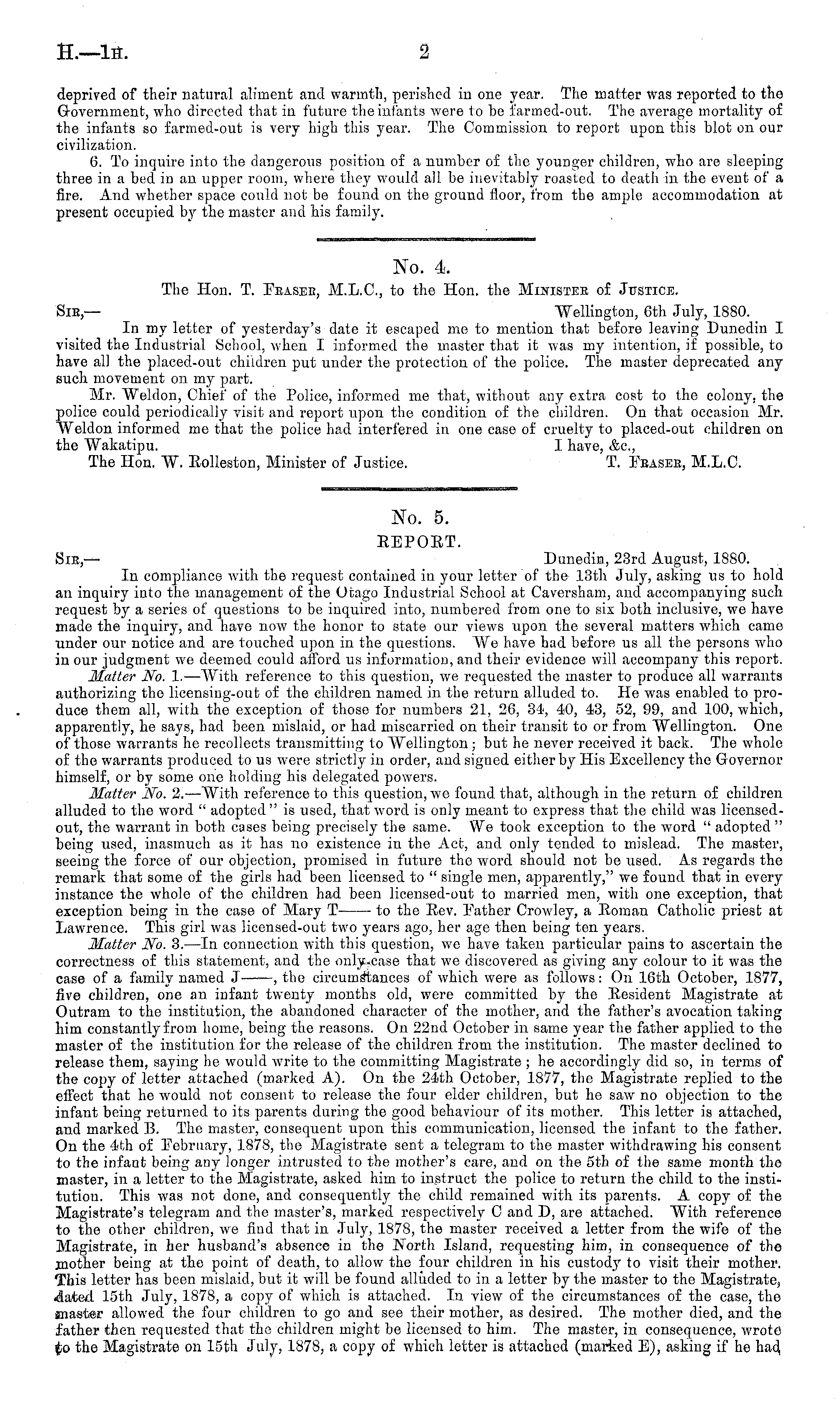 No. 5. REPORT. 8lE } — Dunedim, 23rd August, 1880. In compliance with the request contained in your letter of the 13th July, asking us to hold an inquiry into the management of the Otago Industrial School at Caversham, and accompanying such request by a series of questions to be inquired into, numbered from one to six both inclusive, we have made the inquiry, and have now the honor to state our views upon the several matters which came under our notice and are touched upon in the questions. We have had before us all the persons who in our judgment we deemed could afford us information, and their evidence will accompany this report. Hatter No. I.—"With reference to this question, we requested the master to produce all warrants authorizing the licensing-out of the children named in the return alluded to. He was enabled to produce them all, with the exception of those for numbers 21, 26, 34, 40, 43, 52, 99, and 100, which, apparently, he says, had been mislaid, or had miscarried on their transit to or from Wellington. One of those warrants he recollects transmitting to Wellington ; but he never received it back. The whole of the warrants produced to us were strictly in order, and signed either by His Excellency the Governor himself, or by some one holding his delegated powers. Matter No. 2.—With reference to this question, we found that, although in the return of children alluded to the word " adopted " is used, that word is only meant to express that the child was licensedout, the warrant in both cases being precisely the same. We took exception to the word " adopted " being used, inasmuch as it has no existence in the Act, and only tended to mislead. The master, seeing the force of our objection, promised in future the word should not be used. As regards the remark that some of the girls had been licensed to " single men, apparently," we found that in every instance the whole of the children had been licensed-out to married men, with one exception, that exception being in the case of Mary T to the Rev. Father Crowley, a Roman Catholic priest at Lawrence. This girl was licensed-out two years ago, her age then being ten years. Matter No. 3.—ln connection with this question, we have taken particular pains to ascertain the correctness of this statement, and the only-case that we discovered as giving any colour to it was the case of a family named J , the circumstances of which were as follows: On 16th October, 1877, five children, one an infant twenty months old, were committed by the Resident Magistrate at Outram to the institution, the abandoned character of the mother, and the father's avocation taking him constantly from home, being the reasons. On 22nd October in same year the father applied to the master of the institution for the release of the children from the institution. The master declined to release them, saying he would write to the committing Magistrate ; he accordingly did so, in terms of the copy of letter attached (marked A). On the 24th October, 1877, the Magistrate replied to the effect that he would not consent to release the four elder children, but he saw no objection to the infant being returned to its parents during the good behaviour of its mother. This letter is attached, and marked 13. The master, consequent upon this communication, licensed the infant to the father. On the 4fch of February, 1878, the Magistrate sent a telegram to the master withdrawing his consent to the infant being any longer intrusted to the mother's care, and on the sth of the same month the master, in a letter to the Magistrate, asked him to instruct the police to return the child to the institution. This was not done, and consequently the child remained with its parents. A copy of the Magistrate's telegram and the master's, marked respectively C and D, are attached. With reference to the other children, we find that in July, 1878, the master received a letter from the wife of the Magistrate, in her husband's absence in the North Island, requesting him, in consequence of the mother being at the point of death, to allow the four children in his custody to visit their mother. This letter has been mislaid, but it will be found alluded to in a letter by the master to the Magistrate, dated 15th July, 1878, a copy of which is attached. In view of the circumstances of the case, the aaiastor allowed the four children to go and see their mother, as desired. The mother died, and the father then requested that the children might be licensed to him. The master, in consequence, wrote $o the Magistrate on 15th July, 1878, a copy of which letter is attached (marked E), asking if he had,