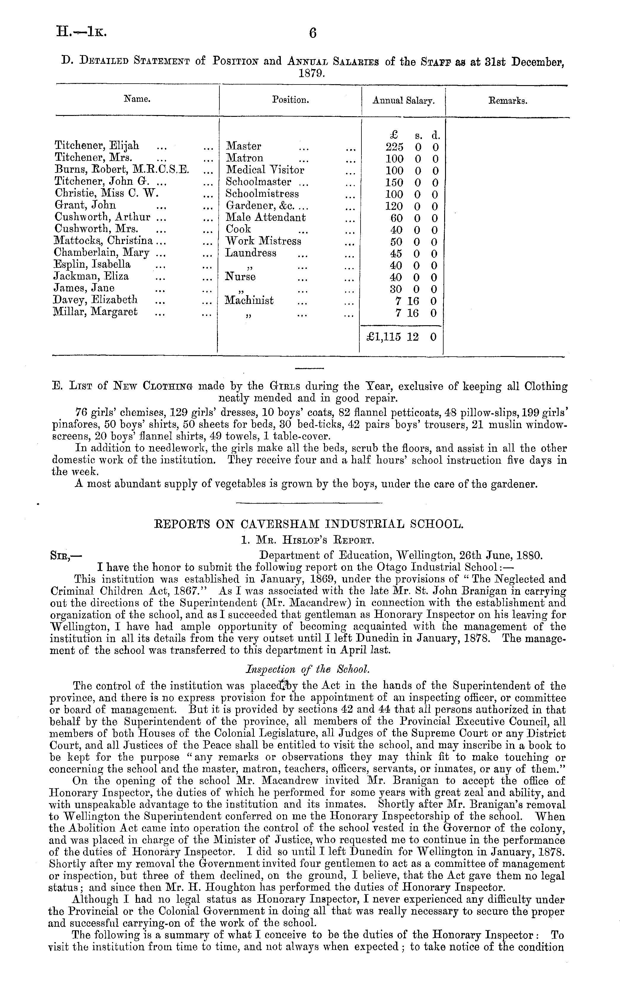 EEPOETS ON CAVERS HAM INDUSTRIAL SCHOOL. 1. Mb. Hislop's Bepobt. Sic, — Department of Education, "Wellington, 26th June, 1880. I have the honor to submit the following report on the Otago Industrial School: —■ This institution was established in January, 1869, under the provisions of " The Neglected and Criminal Children Act, 1867." As I was associated with the late Mr. St. John Branigan in carrying out the directions of the Superintendent (Mr. Macandrew) in connection with the establishment and organization of the school, and as I succeeded that gentleman as Honorary Inspector on his leaving for "Wellington, I have had ample opportunity of becoming acquainted with the management of the institution in all its details from the very outset until I left Dunedin in January, 1878. The management of the school was transferred to this department in April last. Inspection of the School. The control of the institution was placedtby the Act in the hands of the Superintendent of the province, and there is no express provision for the appointment of an inspecting officer, or committee or board of management. But it is provided by sections 42 and 44 that all persons authorized in that behalf by the Superintendent of the province, all members of the Provincial Executive Council, all members of both Houses of the Colonial Legislature, all Judges of the Supreme Court or any District Court, and all Justices of the Peace shall be entitled to visit the school, and may inscribe in a book to be kept for the purpose " any remarks or observations they may think fit to make touching or concerning the school and the master, matron, teachers, officers, servants, or inmates, or any of them." On the opening of the school Mr. Macandrew invited Mr. Branigan to accept the office of Honorary Inspector, tho duties of which he performed for some years with great zeal and ability, and with unspeakable advantage to the institution and its inmates. Shortly after Mr. Branigan's removal to Wellington the Superintendent conferred on me the Honorary Inspectorship of the school. When the Abolition Act came into operation the control of the school vested in the Governor of the colony, and was placed in charge of the Minister of 3 ustice, who requested me to continue in the performance of the duties of Honorary Inspector. I did so until I left Dunedin for Wellington in January, 1878. Shortly after my removal the Government invited four gentlemen to act as a committee of management or inspection, but three of them declined, on the ground, I believe, that the Act gave them no legal status; and since then Mr. H. Houghton has performed the duties of Honorary Inspector. Although I had no legal status as Honorary Inspector, I never experienced any difficulty under the Provincial or the Colonial Government in doing all that was really necessary to secure the proper and successful carrying-on of the work of the school. The following is a summary of what I conceive to be the duties of the Honorary Inspector: To visit the institution from time to time, and not always when expected; to take notice of the condition