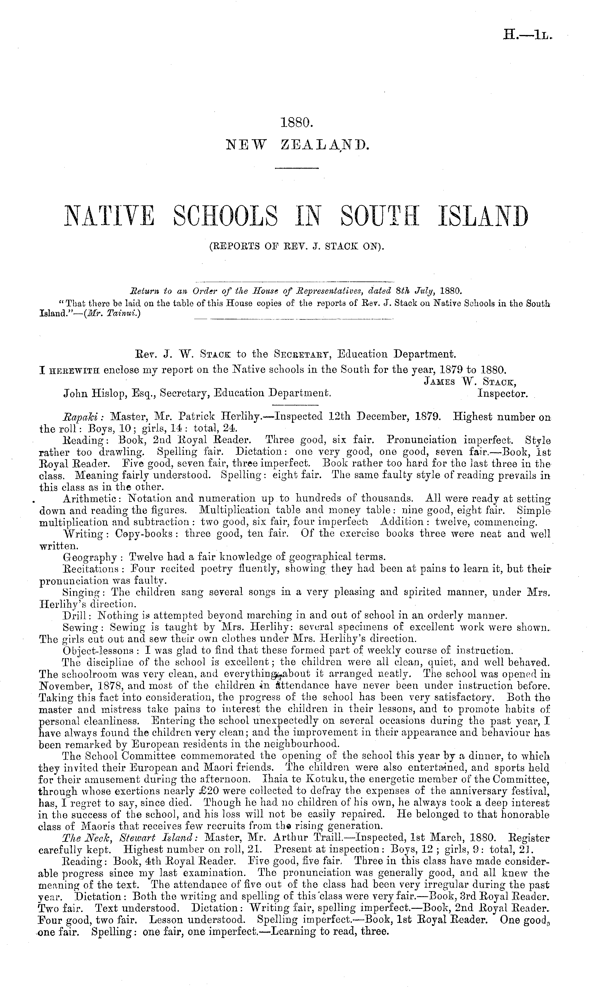 Return to an Order of the House of Representatives, dated Bth July, 1880. "That there be laid on the table of this House copies of the reports of Rev. J. Stack on Native Schools in the South Island." — (Mr. Tainui.)