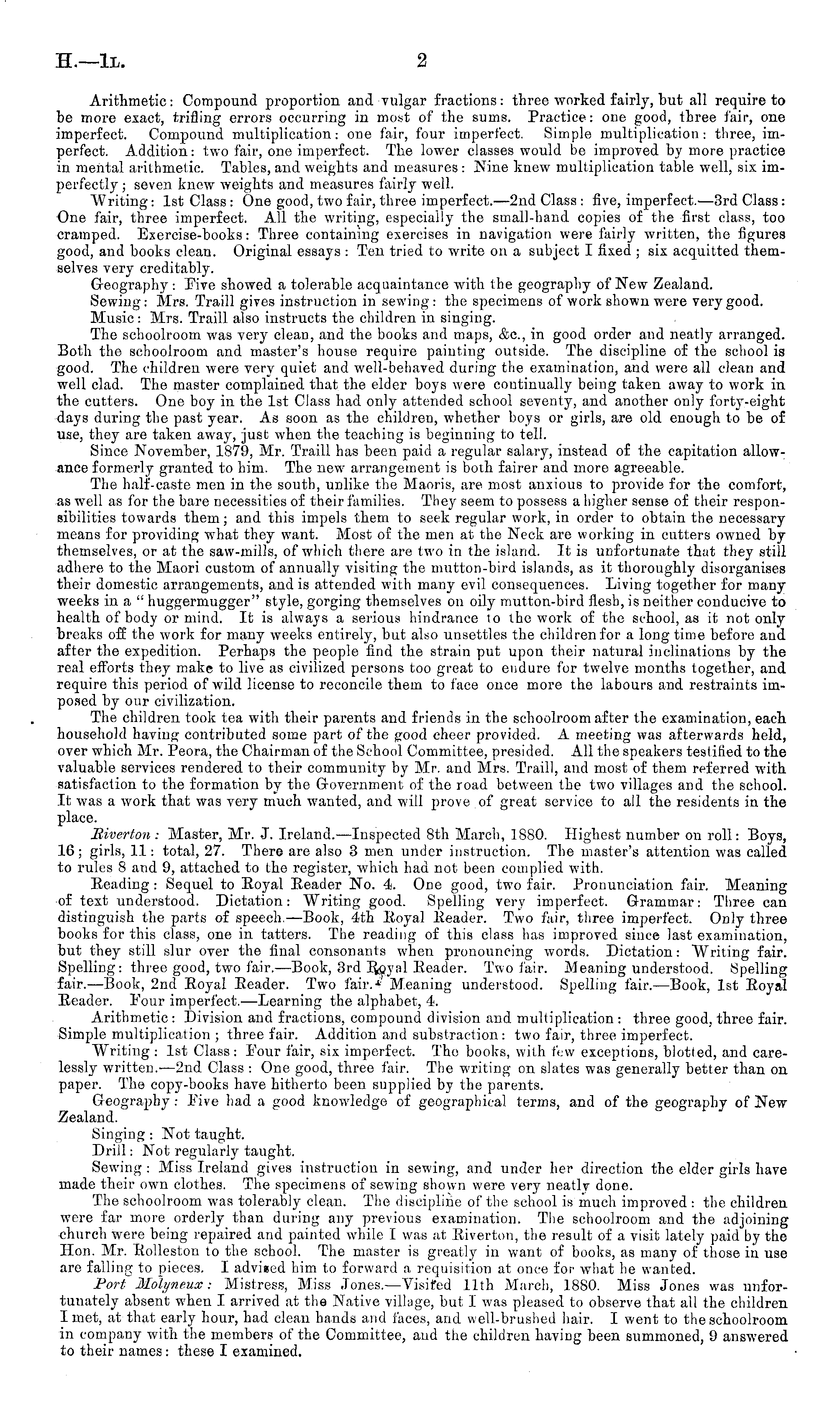 Arithmetic: Compound proportion and vulgar fractions: three worked fairly, but all require to be more exact, trifling errors occurring in most of the sums. Practice: one good, three fair, one imperfect. Compound multiplication: one fair, four imperfect. Simple multiplication: three, imperfect. Addition: two fair, one imperfect. The lower classes would be improved by more practice in mental arithmetic. Tables, and weights and measures : Nine knew multiplication table well, six imperfectly ; seven knew weights and measures fairly well. "Writing: Ist Class : One good, two fair, three imperfect.—2nd Class : five, imperfect.—3rd Class: One fair, three imperfect. All the writing, especially the small-hand copies of the first class, too cramped. Exercise-books: Three containing exercises in navigation were fairly written, the figures good, and books clean. Original essays : Ten tried to write on a subject I fixed ; six acquitted themselves very creditably. Geography : Five showed a tolerable acquaintance with the geography of New Zealand. Sewing: Mrs. Traill gives instruction in sewing : the specimens of work shown were very good. Music: Mrs. Traill also instructs the children in singing. The schoolroom was very clean, and the books and maps, &c, in good order and neatly arranged. Both the schoolroom and master's house require painting outside. The discipline of the school is good. The children were very quiet and well-behaved during the examination, and were all clean and well clad. The master complained that the elder boys were continually being taken away to work in the cutters. One boy in the Ist Class had only attended school seventy, and another only fortj'-eight days during the past year. As soon as the children, whether boys or girls, are old enough to be of use, they are taken away, just when the teaching is beginning to tell. Since November, 1879, Mr. Traill has been paid a regular salarj^, instead of the capitation allowance formerly granted to him. The new arrangement is both fairer and more agreeable. The half-caste men in the south, unlike the Maoris, are most anxious to provide for the comfort, as well as for the bare necessities of their families. They seem to possess a higher sense of their responsibilities towards them; and this impels them to seek regular work, in order to obtain the necessary means for providing what they want. Most of the men at the Neck are working in cutters owned by themselves, or at the saw-mills, of which there are two in the island. It is unfortunate that they still adhere to the Maori custom of annually visiting the mutton-bird islands, as it thoroughly disorganises their domestic arrangements, and is attended with many evil consequences. Living together for many weeks in a " huggermugger" style, gorging themselves on oily mutton-bird flesh, is neither conducive to health of body or mind. It is always a serious hindrance to the work of the school, as it not only breaks off the work for many weeks entirely, but also unsettles the children for a long time before and after the expedition. Perhaps the people find the strain put upon their natural inclinations by the real efforts they make to live as civilized persons too great to endure for twelve months together, and require this period of wild license to reconcile them to face once more the labours and restraints imposed by our civilization. The children took tea with their parents and friends in the schoolroom after the examination, each household having contributed some part of the good cheer provided. A meeting was afterwards held, over which Mr. Peora, the Chairman of the School Committee, presided. All the speakers testified to the valuable services rendered to their community by Mr. and Mrs. Traill, and most of them referred with satisfaction to the formation by the Government of the road between the two villages and the school. It was a work that was very much wanted, and will prove of great service to all the residents in the place. Riverton : Master, Mr. .J. Ireland. —Inspected Bth March, 1880. Highest number on roll: Boys, 16; girls, 11: total, 27. There are also 3 men under instruction. The master's attention was called to rules 8 and 9, attached to the register, which had not been complied with. Reading : Sequel to Royal Reader No. 4. One good, two fair. Pronunciation fair. Meaning of text understood. Dictation: Writing good. Spelling very imperfect. Grammar: Three can distinguish the parts of speech.—Book, 4th Royal Reader. Two fair, three imperfect. Only three books for this class, one in tatters. The reading of this class has improved since last examination, but they still slur over the final consonants when pronouncing words. Dictation: "Writing fair. Spelling: three good, two fair.—Book, 3rd Royal Reader. Two fair. Meaning understood. Spelling fair.—Book, 2nd Royal Reader. Two fair.: Meaning understood. Spelling fair. —Book, Ist Royal Reader. Pour imperfect.—Learning the alphabet, 4. Arithmetic : Division and fractions, compound division and multiplication : three good, three fair. Simple multiplication ; three fair. Addition and substraction : two fair, three imperfect. "Writing : Ist Class : Pour fair, six imperfect. The books, with t'trw exceptions, blotled, and carelessly written.* —2nd Class : One good, three fair. The writing on slates was generally better than on paper. The copy-books have hitherto been supplied by the parents. Geography : Pive had a good knowledge of geographical terms, and of the geography of New Zealand. Singing : Not taught. Drill: Not regularly taught. Sewing : Miss Ireland gives instruction in sewing, and under her direction the elder girls have made their own clothes. The specimens of sewing shown were very neatly done. The schoolroom was tolerably clean. The discipline of the school is much improved : the children were far more orderly than during any previous examination. The schoolroom and the adjoining church were being repaired and 