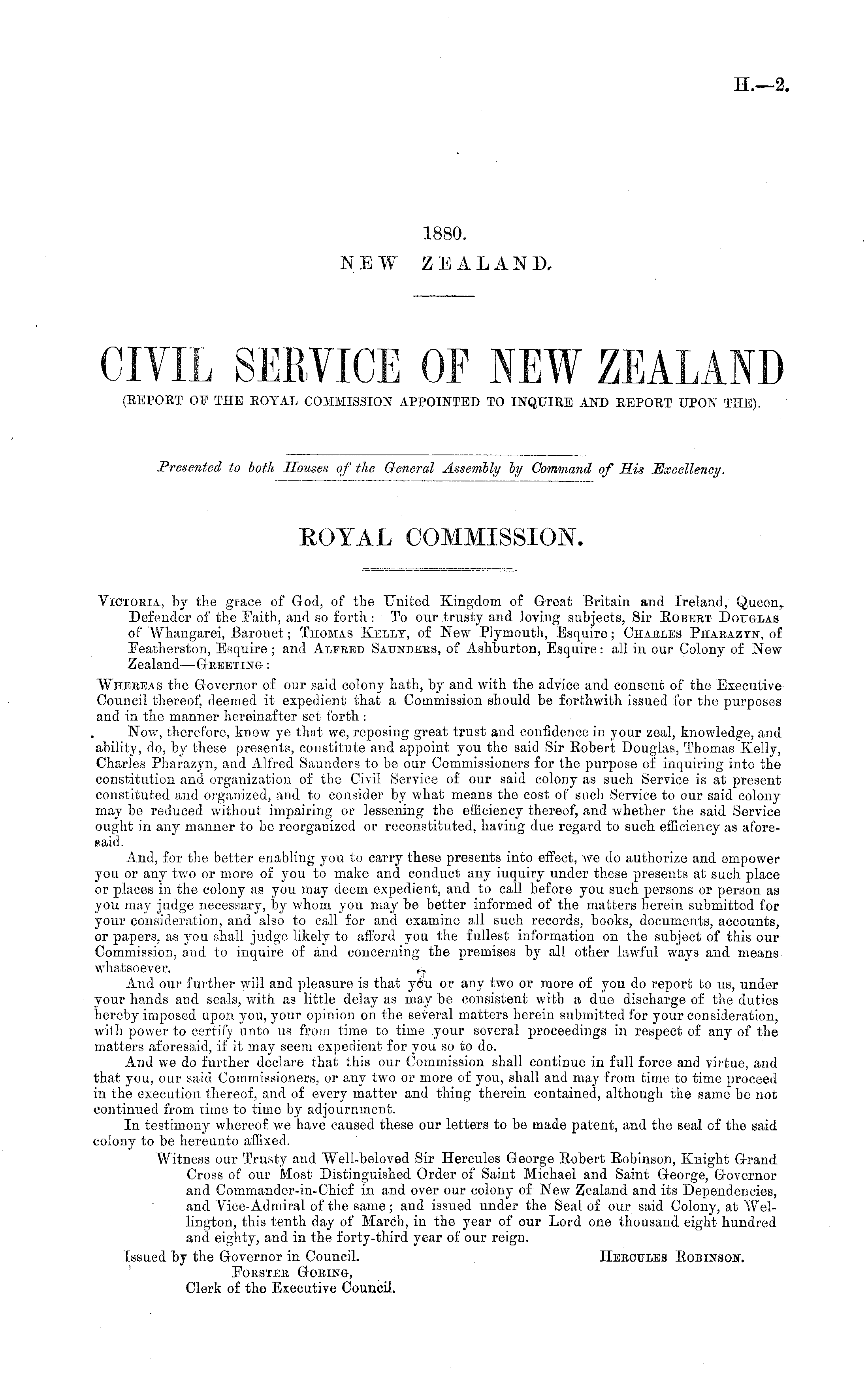 Victoeia, by the grace of Grod, of the United Kingdom of Great Britain and Ireland, Queen,. Defender of the Eaith, and so forth : To our trusty and loving subjects, Sir Robebt Douglas of Whangarei, Baronet; Thomas Kelly, of New Plymouth, JEsquire; Chables Phabazsts, of Featherston, Esquire; and Alfred Satjntiees, of Ashburton, Esquire: all in our Colony of ]N rew Zealand —Gbeeting : Wheeeas the Governor of our said colony hath, by and with the advice and consent of the Executive Council thereof, deemed it expedient that a Commission should be forthwith issued for the purposes and in the manner hereinafter set forth : Now, therefore, know ye that we, reposing great trust and confidence in your zeal, knowledge, and ability, do, by these presents, constitute and appoint you the said Sir Robert Douglas, Thomas Kelly, Charles Pharazyn, and Alfred Saunders to be our Commissioners for the purpose of inquiring into the constitution and organization of the Civil Service of our said colony as such Service is at present constituted and organized, and to consider by what means the cost of such Service to our said colony may be reduced without impairing or lessening the efficiency thereof, and whether the said Service ought in any manner to be reorganized or reconstituted, having due regard to such efficiency as aforesaid. And, for the better enabling you to carry these presents into effect, we do authorize and empower you or any two or more of you to make and conduct any iuquiry under these presents at such place or places in the colony as you may deem expedient, and to call before you such persons or person as you may judge necessary, by whom you may be better informed of the matters herein submitted for your consideration, and also to call for and examine all such records, books, documents, accounts, or papers, as you shall judge likely to afford you the fullest information on the subject of this our Commission, and to inquire of and concerning the premises by all other lawful ways and means whatsoever. And our further will and pleasure is that y6u or any two or more of you do report to us, under your hands and seals, with as little delay as may be consistent with a due discharge of the duties hereby imposed upon you, your opinion on the several matters herein submitted for your consideration, with power to certify unto us from time to time your several proceedings in respect of any of the matters aforesaid, if it may seem expedient for you so to do. And we do further declare that this our Commission shall continue in full force and virtue, and that you, our said Commissioners, or any two or more of you, shall and ma} r from time to time proceed in the execution thereof, and of every matter and thing therein contained, although the same be not continued from time to time by adjournment. In testimony whereof we have caused these our letters to be made patent, and the seal of the said colony to be hereunto affixed. "Witness our Trusty and Well-beloved Sir Hercules George Robert Robinson, Knight Grand Cross of our Most Distinguished Order of Saint Michael and Saint G-eorge, Grovernor and Commander-in-Chief in and over our colony of New Zealand and its Dependencies, and Vice-Admiral of the same; and issued under the Seal of our said Colony, at Wellington, this tenth day of March, in the year of our Lord one thousand eight hundred and eighty, and in the forty-third year of our reign. Issued by the Governor in Council. Hehcules Robinson. FoBSTEB GOBING, Clerk of the Executive Council.