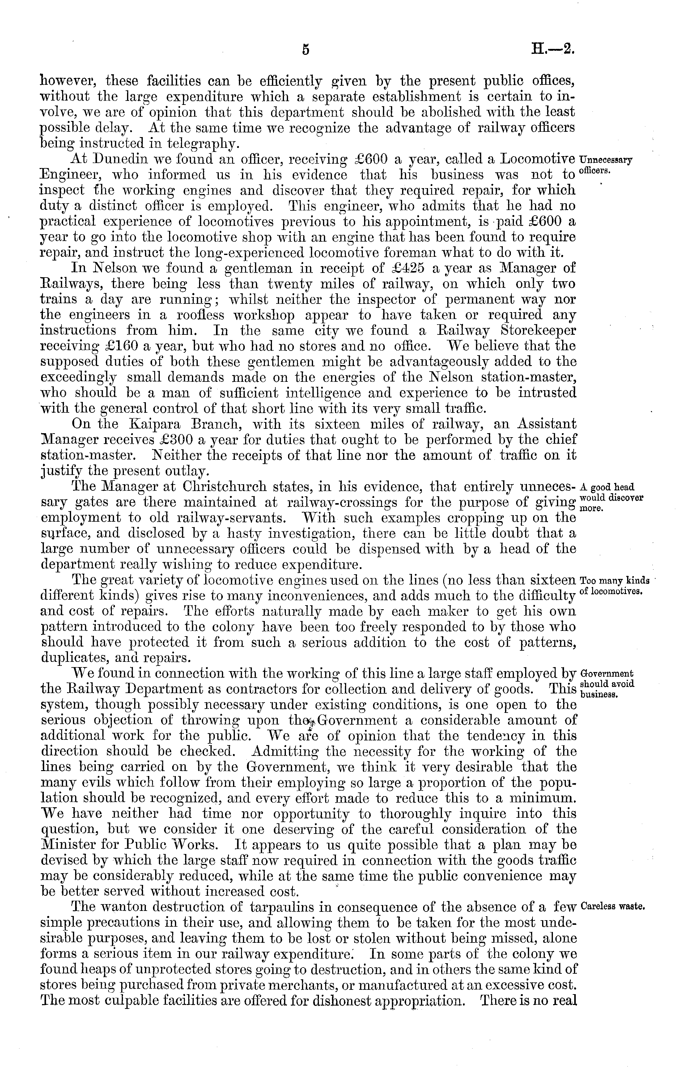 The Manager at Ohristchurch states, in his evidence, that entirely unnecessary gates are there maintained at railway-crossings for the purpose of giving employment to old railway-servants. With such examples cropping up on the surface, and disclosed by a hasty investigation, there can be little doubt that a large number of unnecessary officers could be dispensed with by a head of the department really wishing to reduce expenditure.