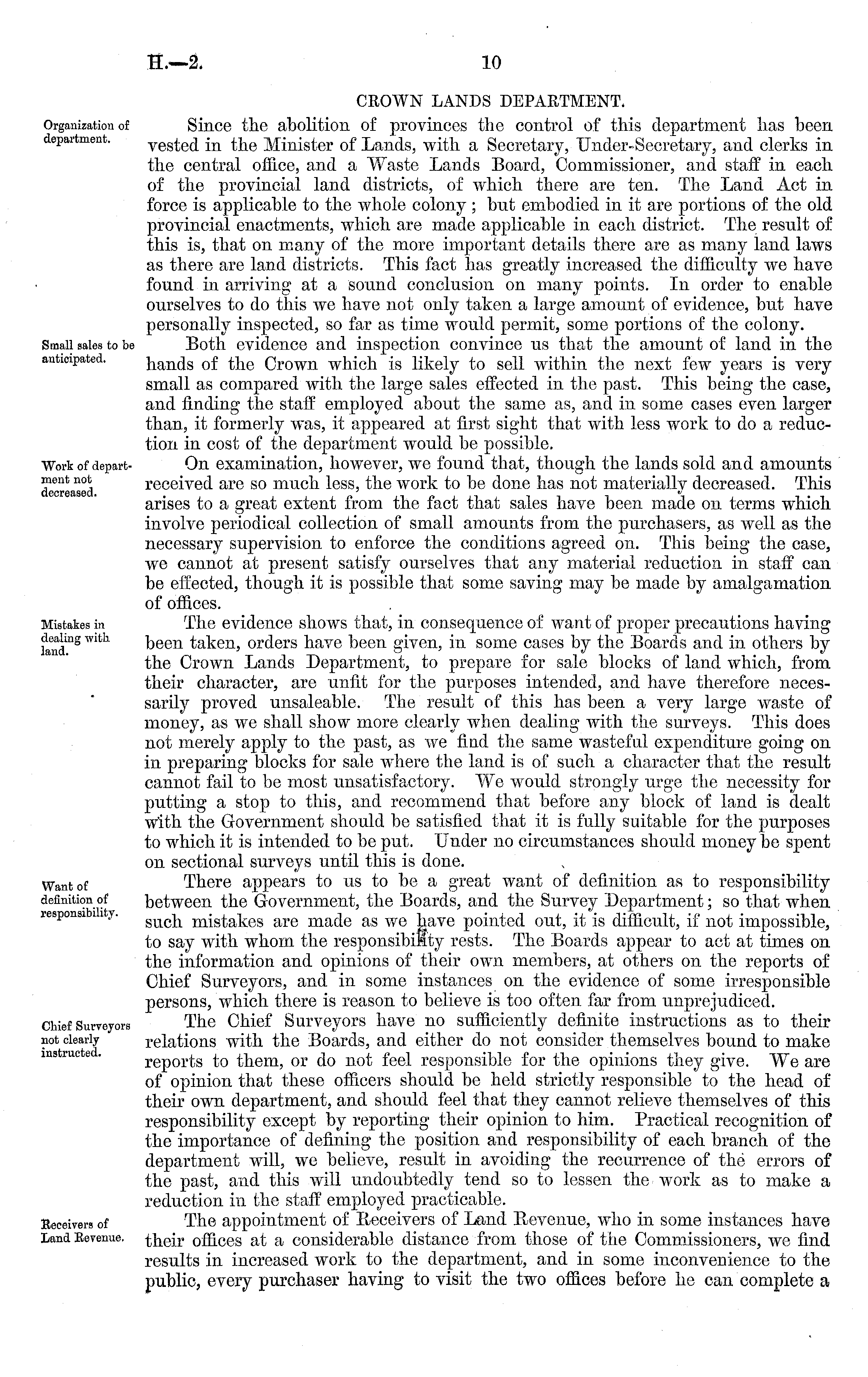 CROWN LANDS DEPARTMENT. Since the abolition of provinces the control of this department has been vested in the Minister of Lands, with a Secretary, Under-Secretary, and clerks in the central office, and a Waste Lands Board, Commissioner, and staff in each of the provincial land districts, of which there are ten. The Land Act in force is applicable to the whole colony ; but embodied in it are portions of the old provincial enactments, which are made applicable in each district. The result of this is, that on many of the more important details there are as many land laws as there are land districts. This fact has greatly increased the difficulty we have found in arriving at a sound conclusion on many points. In order to enable ourselves to do this we have not only taken a large amount of evidence, but have personally inspected, so far as time would permit, some portions of the colony.