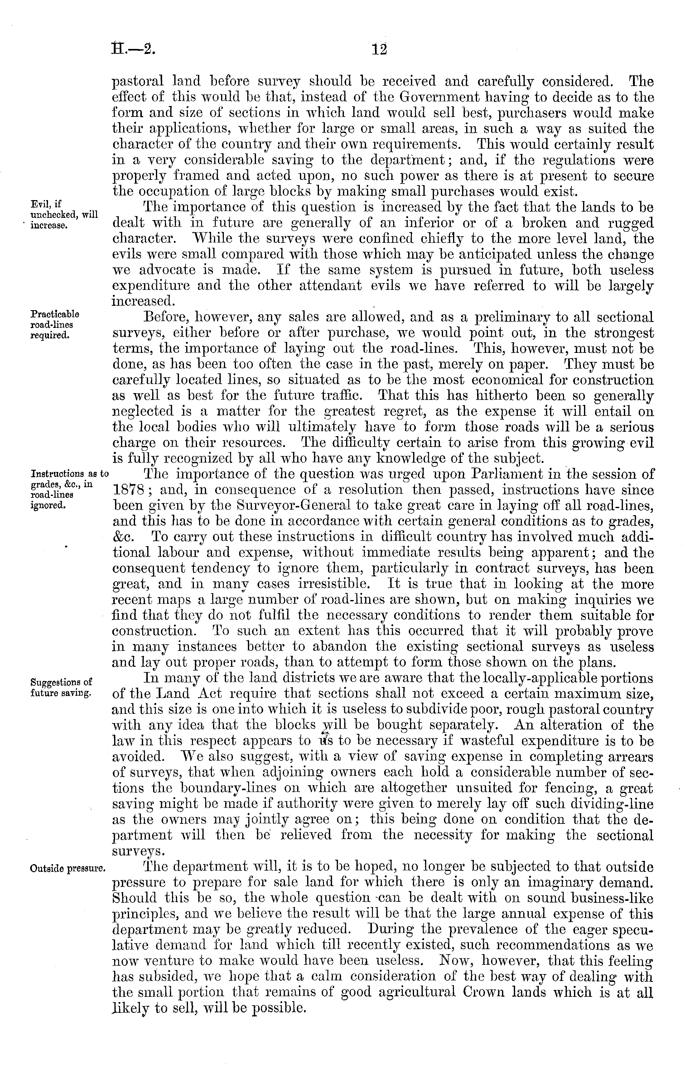 Before, however, any sales are allowed, and as a preliminary to all sectional surveys, either before or after purchase, we would point out, in the strongest terms, the importance of laying out the road-lines. This, however, must not be done, as has been too often the case in the past, merely on paper. They must be carefully located lines, so situated as to be the most economical for construction as well as best for the future traffic. That this has hitherto been so generally neglected is a matter for the greatest regret, as the expense it will entail on the local bodies avlio will ultimately have to form those roads will be a serious charge on their resources. The difficulty certain to arise from this growing evil is fully recognized by all who have any knowledge of the subject.