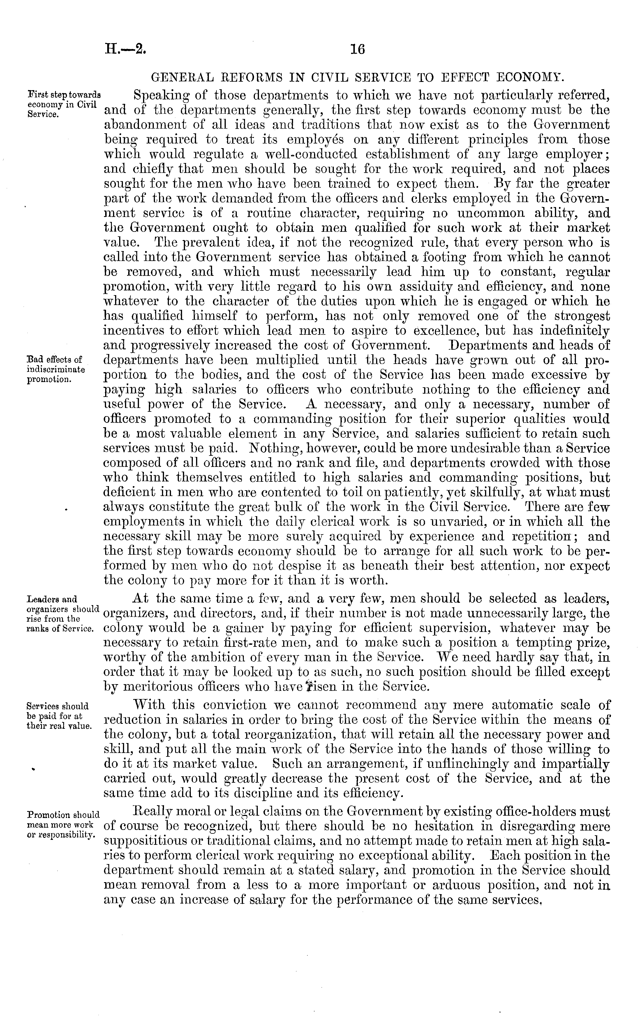 GENERAL REFORMS IN CIVIL SERVICE TO EFFECT ECONOMY. Speaking of those departments to which we have not particularly referred, and of the departments generally, the first step towards economy must be the abandonment of all ideas and traditions that now exist as to the Government being required to treat its employes on any different principles from those which would regulate a well-conducted establishment of any large employer; and chiefly that men should be sought for the work required, and not places sought for the men who have been trained to expect them. By far the greater part of the work demanded from the officers and clerks employed in the Government service is of a routine character, requiring no uncommon ability, and the Government ought to obtain men qualified for such work at their market value. The prevalent idea, if not the recognized rule, that every person who is called into the Government service has obtained a footing from which he cannot be removed, and which must necessarily lead him up to constant, regular promotion, with very little regard to his own assiduity and efficiency, and none whatever to the character of the duties upon which he is engaged or which he has qualified himself to perform, has not only removed one of the strongest incentives to effort which lead men to aspire to excellence, but has indefinitely and progressively increased the cost of Government. Departments and heads of departments have been multiplied until the heads have grown out of all proportion to the bodies, and the cost of the Service has been made excessive by paying high salaries to officers who contribute nothing to the efficiency and useful power of the Service. A necessary, and only a necessary, number of officers promoted to a commanding position for their superior qualities would be a most valuable element in any Service, and salaries sufficient to retain such services must be paid. Nothing, however, could be more undesirable than a Service composed of all officers and no rank and file, and departments crowded with those who think themselves entitled to high salaries and commanding positions, but deficient in men who are contented to toil on patiently, yet skilfully, at what must always constitute the great bulk of the work in the Civil Service. There are few employments in which the daily clerical work is so unvaried, or in which all the necessary skill may be more surely acquired by experience and repetition; and the first step towards economy should be to arrange for all such work to be performed by men who do not despise it as beneath their best attention, nor expect the colony to pay more for it than it is worth.