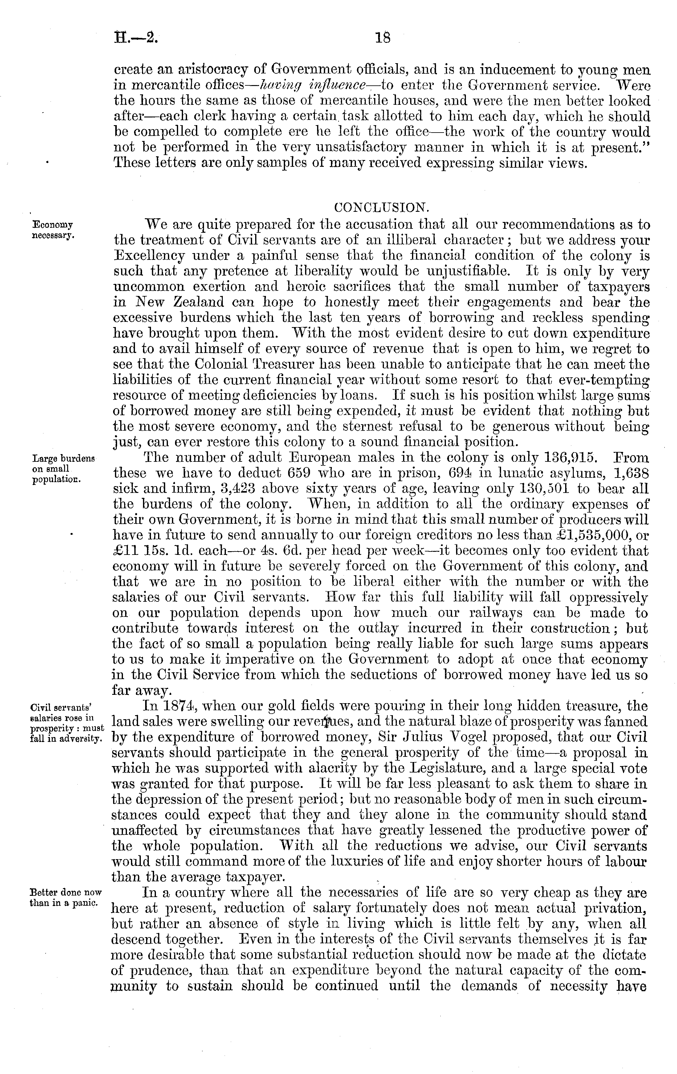 CONCLUSION. We are quite prepared for the accusation that all our recommendations as to the treatment of Civil servants are of an illiberal character; but we address your Excellency under a painful sense that the financial condition of the colony is such that any pretence at liberality would be unjustifiable. It is only by very uncommon exertion and heroic sacrifices that the small number of taxpayers in New Zealand can hope to honestly meet their engagements and bear the excessive burdens which the last ten years of borrowing and reckless spending have brought upon them. With the most evident desire to cut down expenditure and to avail himself of every source of revenue that is open to him, we regret to see that the Colonial Treasurer has been unable to anticipate that he can meet the liabilities of the current financial year without some resort to that ever-tempting resource of meeting deficiencies by loans. If such is his position whilst large sums of borrowed money are still being expended, it must be evident that nothing but the most severe economy, and the sternest refusal to be generous without being just, can ever restore this colony to a sound financial position.