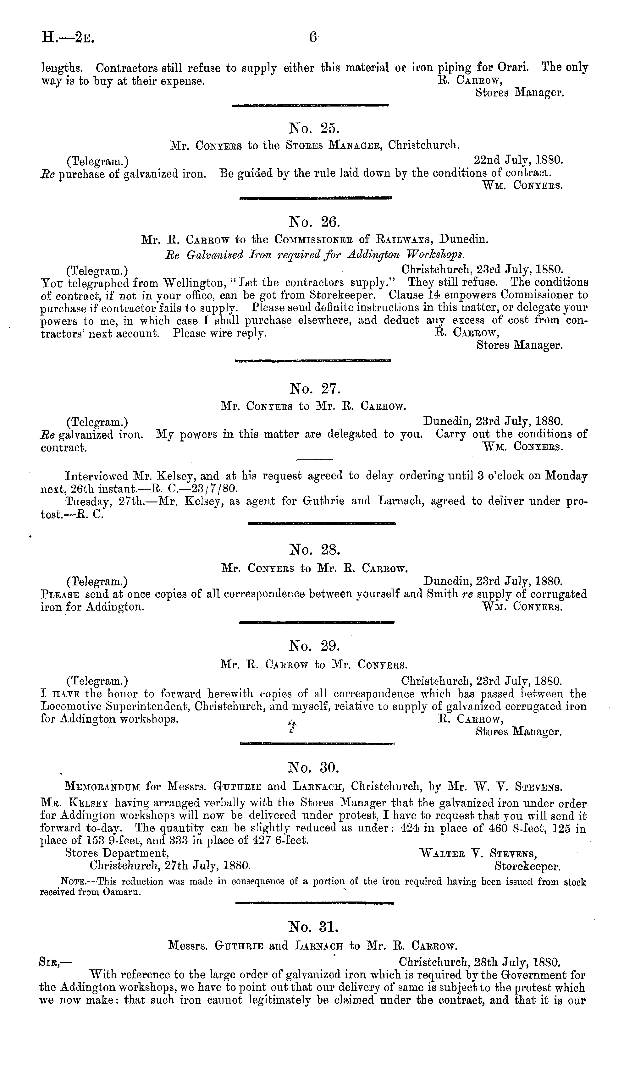 No. 30. Memorandum for Messrs. Guthrie and Larnach, Christchurch, by Mr. W. V. Stevens. Mr. Kelsey having arranged verbally with the Stores Manager that the galvanized iron under order for Addington workshops will now be delivered under protest, I have to request that yon will send it forward to-day. The quantity can be slightly reduced as under: 424 in place of 460 8-feet, 125 in place of 153 9-feet, and 333 in place of 427 6-feet. Stores Department, Walter V. Stevens, Christchurch, 27th July, 1880. Storekeeper. Note. —This reduction was made in consequence of a portion of the iron required having been issued from stock received from Oamaru.