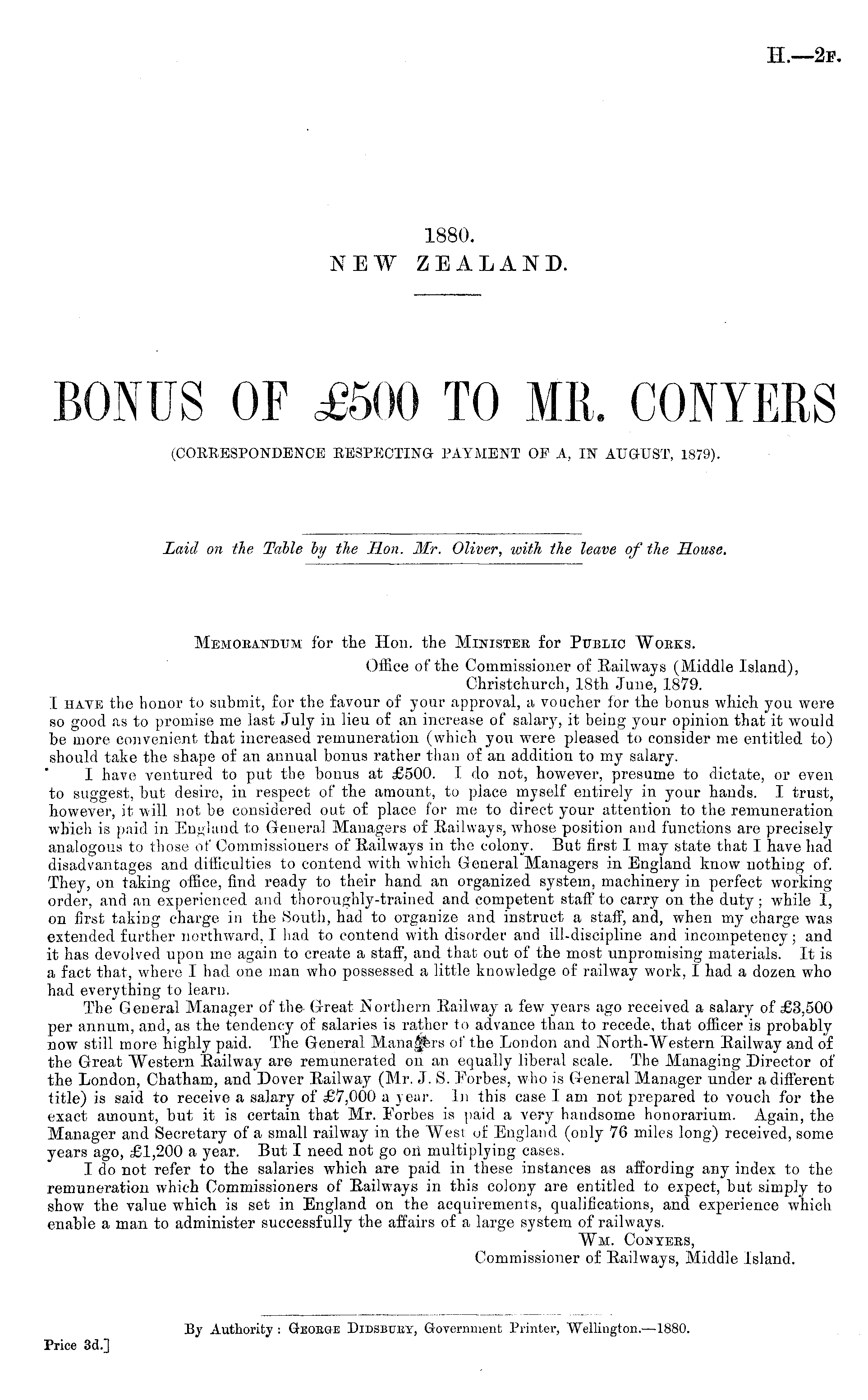 Memorandum for the Hon. the Minister for Public Woeks. Office of the Commissioner of Railways (Middle Island), Christchurch, 18th June, 1879. I hate the honor to submit, for the favour of your approval, a voucher for the bonus which you wore so good as to promise me last July in lieu of an increase of salary, it being your opinion that it would be more convenient that increased remuneration (which you were pleased to consider me entitled to) should take the shape of an annual bonus rather than of an addition to my salary. I have ventured to put the bonus at £500. 1 do not, however, presume to dictate, or even to suggest, but desire, in respect of the amount, to place myself entirely in your hands. I trust, however, it will not be considered out of place for me to direct your attention to the remuneration which is paid in England to General Managers of Railways, whose position and functions are precisely analogous to those of Commissioners of Railways in the colony. But first I may state that I have had disadvantages and difficulties to contend with which General Managers in England know nothing of. They, on taking office, find ready to their hand an organized system, machinery in perfect working order, and an experienced and thoroughly-trained and competent staff to carry on the duty; while 1, on first taking charge in the South, had to organize and instruct a staff, and, when my charge was extended further northward, I had to contend with disorder and ill-discipline and incompetency; and it has devolved upon mo again to create a staff, and that out of the most unpromising materials. It is a fact that, where I had one man who possessed a little knowledge of railway work, I had a dozen who had everything to learn. The General Manager of the- Great Northern Railway a few years ago received a salary of £3,500 per annum, and, as the tendency of salaries is rather to advance than to recede, that officer is probably now still more highly paid. The General Manaßrs of the London and North-Western Railway and of the Great Western Railway are remunerated on an equally liberal scale. The Managing Director of the London, Chatham, and Dover Railway (Mr. J. S. Forbes, who is General Manager under a different title) is said to receive a salary of £7,000 a year. In this case lam not prepared to vouch for the exact amount, but it is certain that Mr. Forbes is paid a very handsome honorarium. Again, the Manager and Secretary of a small railway in the West of England (only 76 miles long) received, some years ago, £1,200 a year. But I need not go oil multiplying cases. I do not refer to the salaries which are paid in these instances as affording any index to the remuneration which Commissioners of Railways in this colony are entitled to expect, but simply to show the value which is set in England on the acquirements, qualifications, and experience which enable a man to administer successfully the affairs of a large system of railways. Wm. Cos tees, Commissioner of Railways, Middle Island.