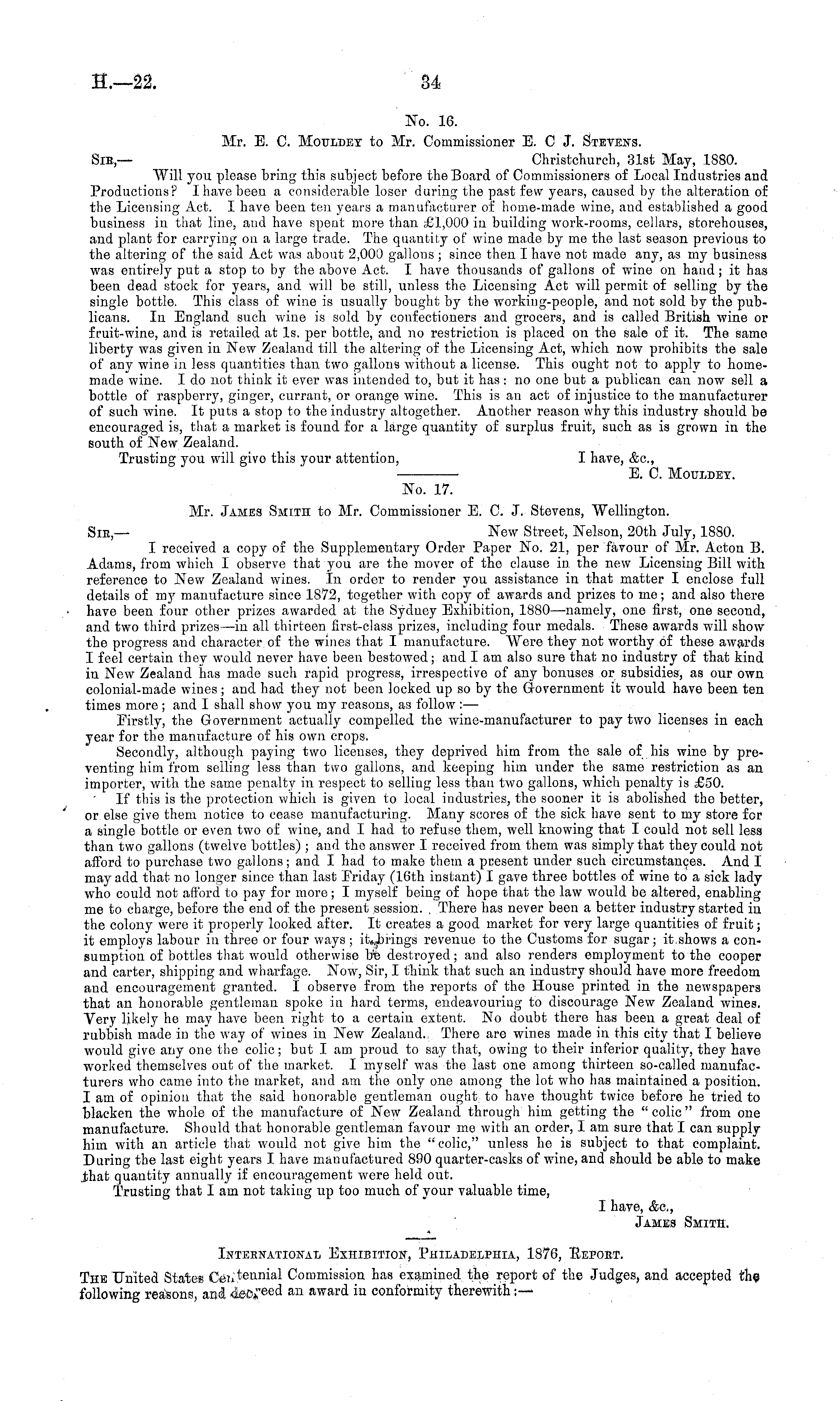 No. 17. Mr. James Smith to Mr. Commissioner E. C. J. Stevens, "Wellington. Sib,— New Street, Nelson, 20th July, 1880. I received a copy of the Supplementary Order Paper No. 21, per favour of Mr. Acton B. Adams, from which. I observe that you are the mover of the clause in the new Licensing Bill with reference to New Zealand wines. In order to render you assistance in that matter I enclose full details of my manufacture since 1872, together with copy of awards and prizes to me; and also there have been four other prizes awarded at the Sydney Exhibition, 1880 —namely, one first, one second, and two third prizes—in all thirteen first-class prizes, including four medals. These awards will show the progress and character of the wines that I manufacture. Were they not worthy of these awards I feel certain they would never have been bestowed; and I am also sure that no industry of that kind in New Zealand has made such rapid progress, irrespective of any bonuses or subsidies, as our own colonial-made wines; and had they not been locked up so by the (iovernment it would have been ten times more ; and I shall show you my reasons, as follow : — Firstly, the Government actually compelled the wine-manufacturer to pay two licenses in each year for the manufacture of his own crops. Secondly, although paying two licenses, they deprived him from the sale of his wine by preventing him from selling less than two gallons, and keeping him under the same restriction as an importer, with the same penalty in respect to selling less than two gallons, which penalty is £50. If this is the protection which is given to local industries, the sooner it is abolished the better, or else give them notice to cease manufacturing. Many scores of the sick have sent to my store for a single bottle or even two of wine, and I had to refuse them, well knowing that I could not sell less than two gallons (twelve bottles) ; and the answer I received from them was simply that they could not afford to purchase two gallons; and I had to make them a present under such circumstances. And I may add that no longer since than last Friday (16th instant) I gave three bottles of wine to a sick lady who could not afford to pay for more; I myself being of hope that the law would be altered, enabling me to charge, before the end of the present session. . There has never been a better industry started in the colony were it properly looked after. It creates a good market for very large quantities of fruit; it employs labour in three or four ways; ifc.-brings revenue to the Customs for sugar; it shows a consumption of bottles that would otherwise tre destroyed; and also renders employment to the cooper and carter, shipping and wharfage. Now, Sir, I think that such an industry should have more freedom and encouragement granted. I observe from the reports of the House printed in the newspapers that an honorable gentleman spoke in hard terms, endeavouring to discourage New Zealand wines. Very likely he may have been right to a certain extent. No doubt there has been a great deal of rubbish made in the way of wines in New Zealand. There are wines made in this city that I believe would give any one the colic; but lam proud to say that, owing to their inferior quality, they have worked themselves out of the market. I myself was the last one among thirteen so-called manufacturers who came into the market, and am the only one among the lot who has maintained a position. I am of opinion that the said honorable gentleman ought to have thought twice before he tried to blacken the whole of the manufacture of New Zealand through him getting the " colic" from one manufacture. Should that honorable gentleman favour me with an order, lam sure that I can supply him with an article that would not give him the "colic," unless he is subject to that complaint. During the last eight years I have manufactured 890 quarter-casks of wine, and should be able to make .that quantity annually if encouragement were held out. Trusting that I am not taking up too much of your valuable time, I have, &c, James Smith.
