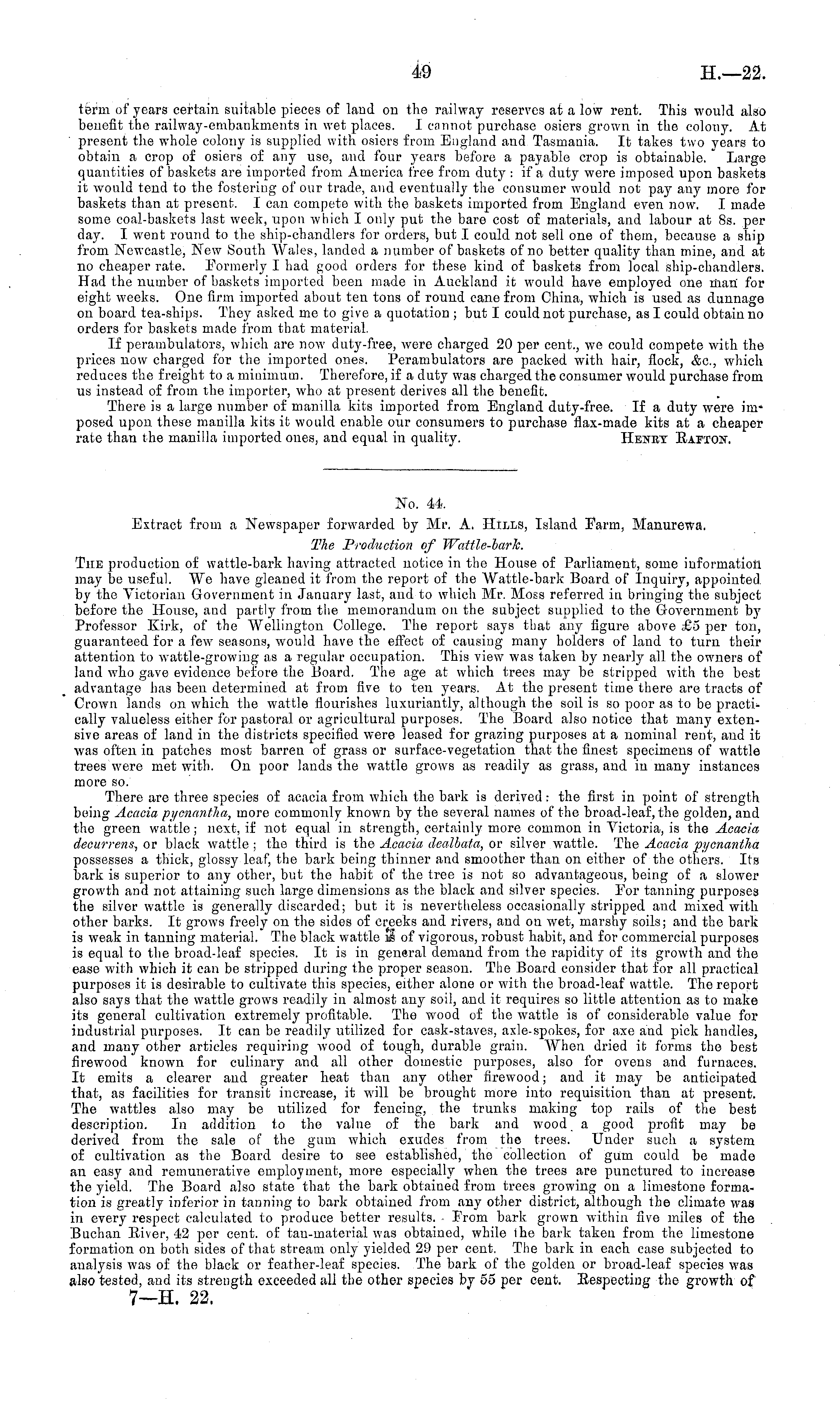 term of years certain suitable pieces of land on the railway reserves at a low rent. This would also benefit the railway-embankments in wet places. I cannot purchase osiers grown in the colony. At present the whole colony is supplied with osiers from England and Tasmania. It takes two years to obtain a crop of osiers of any uso, and four years before a payable crop is obtainable. " Large quantities of baskets are imported from America free from duty : if a duty were imposed upon baskets it would tend to the fostering of our trade, and eventually the cousumer would not pay any more for baskets than at present. I can compete with the baskets imported from England even now. I made some coal-baskets last week, upon which I only put the bare cost of materials, and labour at Bs. per day. I went round to the ship-chandlers for orders, but I could not sell one of them, because a ship from Newcastle, New South Wales, landed a number of baskets of no better quality than mine, and at no cheaper rate. Pormerly I had good orders for these kind of baskets from local ship-chandlers. Had the number of baskets imported been made in Auckland it would have employed one man' for eight weeks. One firm imported about ten tons of round cane from China, which is used as dunnage on board tea-ships. They asked me to give a quotation ; but I could not purchase, as I could obtain no orders for baskets made from that material. If perambulators, which are now duty-free, were charged 20 per cent., we could compete with the prices now charged for the imported ones. Perambulators are packed with hair, flock, &c, which reduces the freight to a minimum. Therefore, if a duty was charged the consumer would purchase from us instead of from the importer, who at present derives all the benefit. There is a large number of manilla kits imported from England duty-free. If a duty were im* posed upon these manilla kits it would enable our consumers to purchase flax-made kits at a cheaper rate than the manilla imported ones, and equal in quality. Hetcet Bapton.