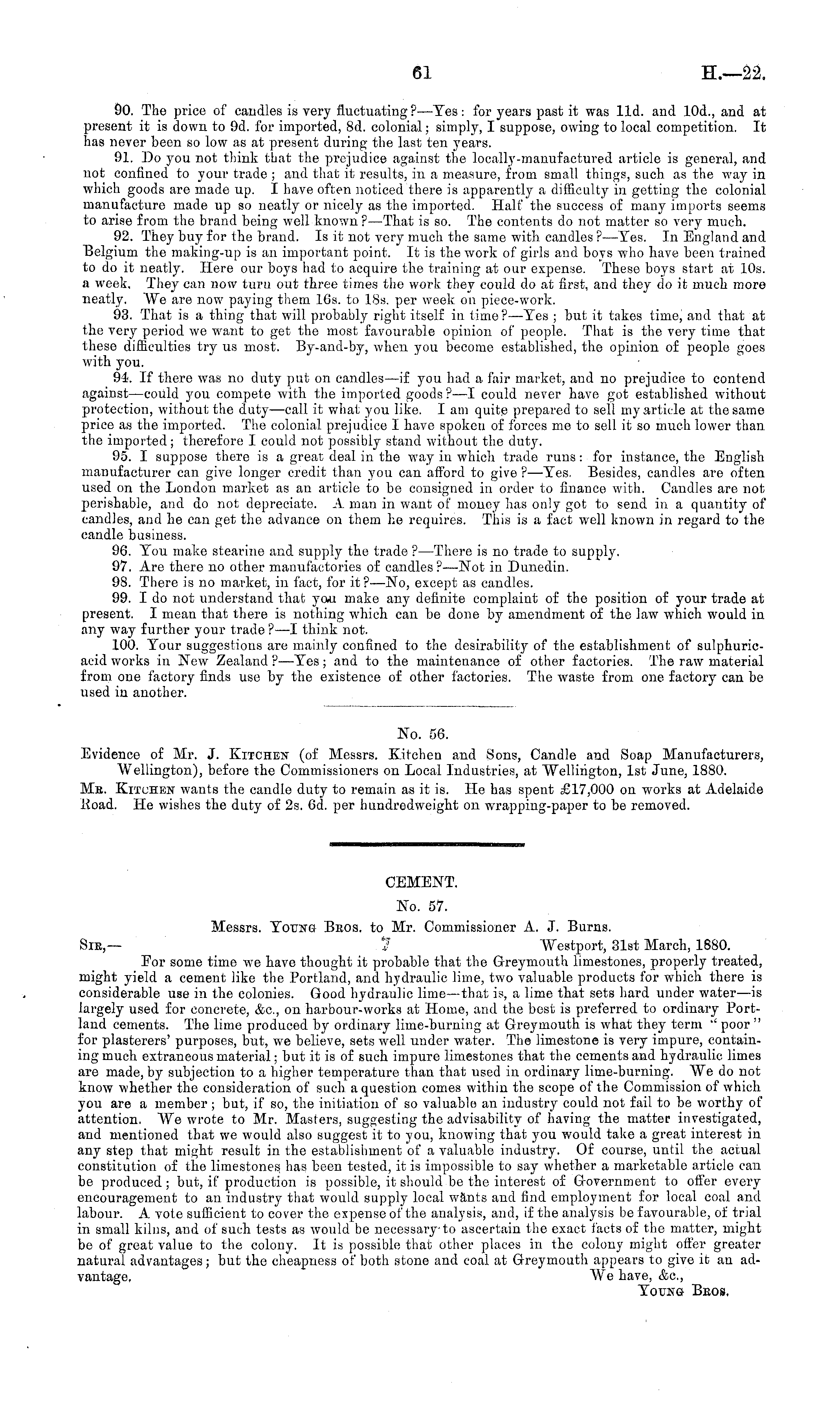 No. 56. Evidence of Mr. J. Kitchen (of Messrs. Kitchen and Sons, Candle and Soap Manufacturers, Wellington), before the Commissioners on Local Industries, at Wellington, Ist June, 1880. Me. Kitchen wants the candle duty to remain as it is. He has spent £17,000 on works at Adelaide lioad. He wishes the duty of 2s. 6d. per hundredweight on wrapping-paper to be removed.