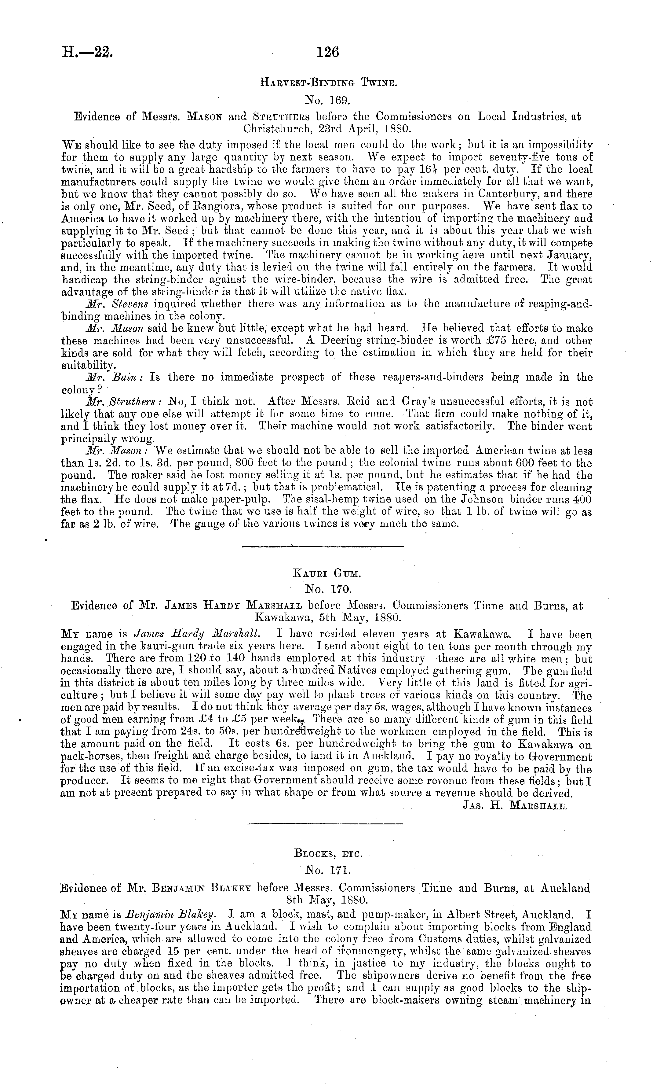 Katjei Gum. No. 170. Evidence of Mr. James Haedy Marshall before Messrs. Commissioners Tinne and Burns, at Kawakawa, sth May, 1880. My name is James Hardy 31arsJiall. I have resided eleven years at Kawakawa. I have been engaged in the kauri-gum trade six years here. I send about eight to ten tons per month through my hands. There are from 120 to 140 hands employed at this industry—these are all white men ; but occasionally there are, I should say, about a hundred Natives employed gathering gum. The gum field in this district is about ten miles long by three miles wide. Very little of this land is fitted for agriculture ; but I believe it will some day pay well to plant trees of various kinds on this country. The men are paid by results. Ido not think they average per day ss. wages, although I have known instances of good men earning from £4 to £5 per week*|. There are so many different kinds of gum in this field that lam paying from 245. to 50s. per hundredweight to the workmen employed in the field. This is the amount paid on the field. It costs 6s. per hundredweight to bring the gum to Kawakawa on pack-horses, then freight and charge besides, to land it in Auckland. I pay no royalty to Government for the use of this field. If an excise-tax was imposed on gum, the tax would have to be paid by the producer. It seems to me right that Government should receive some revenue from these fields; but I am not at present prepared to say in what shape or from what source a revenue should be derived. Jas. H. Marshall.