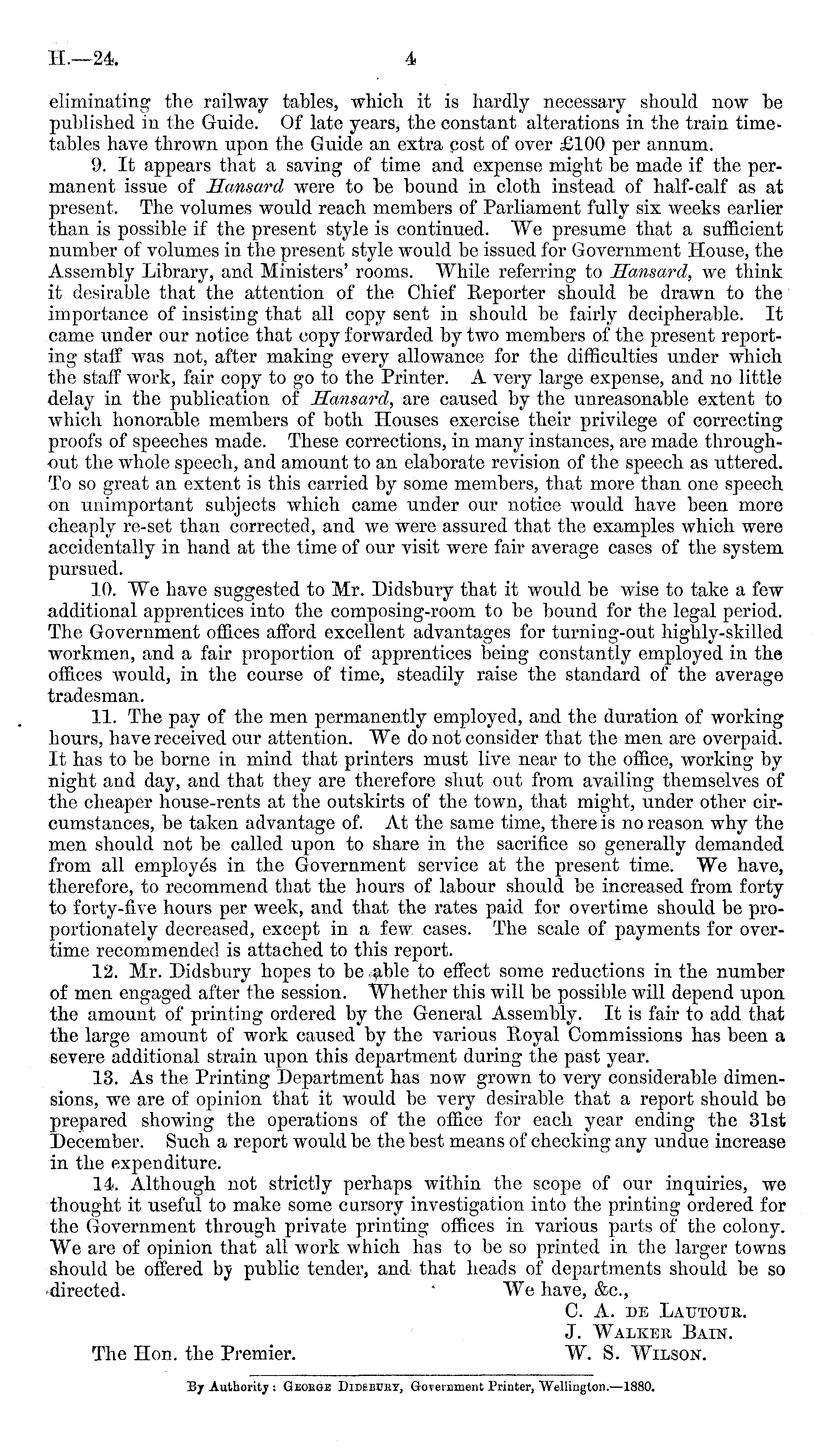 eliminating the railway tables, which it is hardly necessary should now be published in the Guide. Of late years, the constant alterations in the train timetables have thrown upon the Guide an extra cost of over £100 per annum. 9. It appears that a saving of time and expense might be made if the permanent issue of Hansard were to be bound in cloth instead of half-calf as at present. The volumes would reach members of Parliament fully six weeks earlier than is possible if the present style is continued. We presume that a sufficient number of volumes in the present style would be issued for Government House, the Assembly Library, and Ministers' rooms. While referring to Hansard, we think it desirable that the attention of the Chief Reporter should be drawn to the importance of insisting that all copy sent in should be fairly decipherable. It came under our notice that copy forwarded by two members of the present reporting staff was not, after making every allowance for the difficulties under which the staff work, fair copy to go to the Printer. A very large expense, and no little delay in the publication of Hansard, are caused by the unreasonable extent to which honorable members of both Houses exercise their privilege of correcting proofs of speeches made. These corrections, in many instances, are made throughout the whole speech, and amount to an elaborate revision of the speech as uttered. To so great an extent is this carried by some members, that more than one speech on unimportant subjects which came under our notice would have been more cheaply re-set than corrected, and we were assured that the examples which were accidentally in hand at the time of our visit were fair average cases of the system pursued. 10. We have suggested to Mr. Didsbury that it would be wise to take a few additional apprentices into the composing-room to be bound for the legal period. The Government offices afford excellent advantages for turning-out highly-skilled workmen, and a fair proportion of apprentices being constantly employed in the offices would, in the course of time, steadily raise the standard of the average tradesman. 11. The pay of the men permanently employed, and the duration of working hours, have received our attention. We do not consider that the men are overpaid. It has to be borne in mind that printers must live near to the office, working by night and day, and that they are therefore shut out from availing themselves of the cheaper house-rents at the outskirts of the town, that might, under other circumstances, be taken advantage of. At the same time, there is no reason why the men should not be called upon to share in the sacrifice so generally demanded from all employes in the Government service at the present time. We have, therefore, to recommend that the hours of labour should be increased from forty to forty-five hours per week, and that the rates paid for overtime should be proportionately decreased, except in a few cases. The scale of payments for overtime recommended is attached to this report. 12. Mr. Didsbury hopes to be able to effect some reductions in the number of men engaged after the session. Whether this will be possible will depend upon the amount of printing ordered by the General Assembly. It is fair to add that the large amount of work caused by the various Royal Commissions has been a severe additional strain upon this department during the past year. 13. As the Printing Department has now grown to very considerable dimensions, we are of opinion that it would be very desirable that a report should be prepared showing the operations of the office for each year ending the 31st December. Such a report would be the best means of checking any undue increase in the expenditure. 14. Although not strictly perhaps within the scope of our inquiries, we thought it useful to make some cursory investigation into the printing ordered for the Government through private printing offices in various parts of the colony. We are of opinion that all work which has to be so printed in the larger towns should be offered by public tender, and that heads of departments should be so ■directed. We have, &c, C. A. de Lautotjr. J. Walker Bain. The Hon. the Premier. W. S. Wilson.