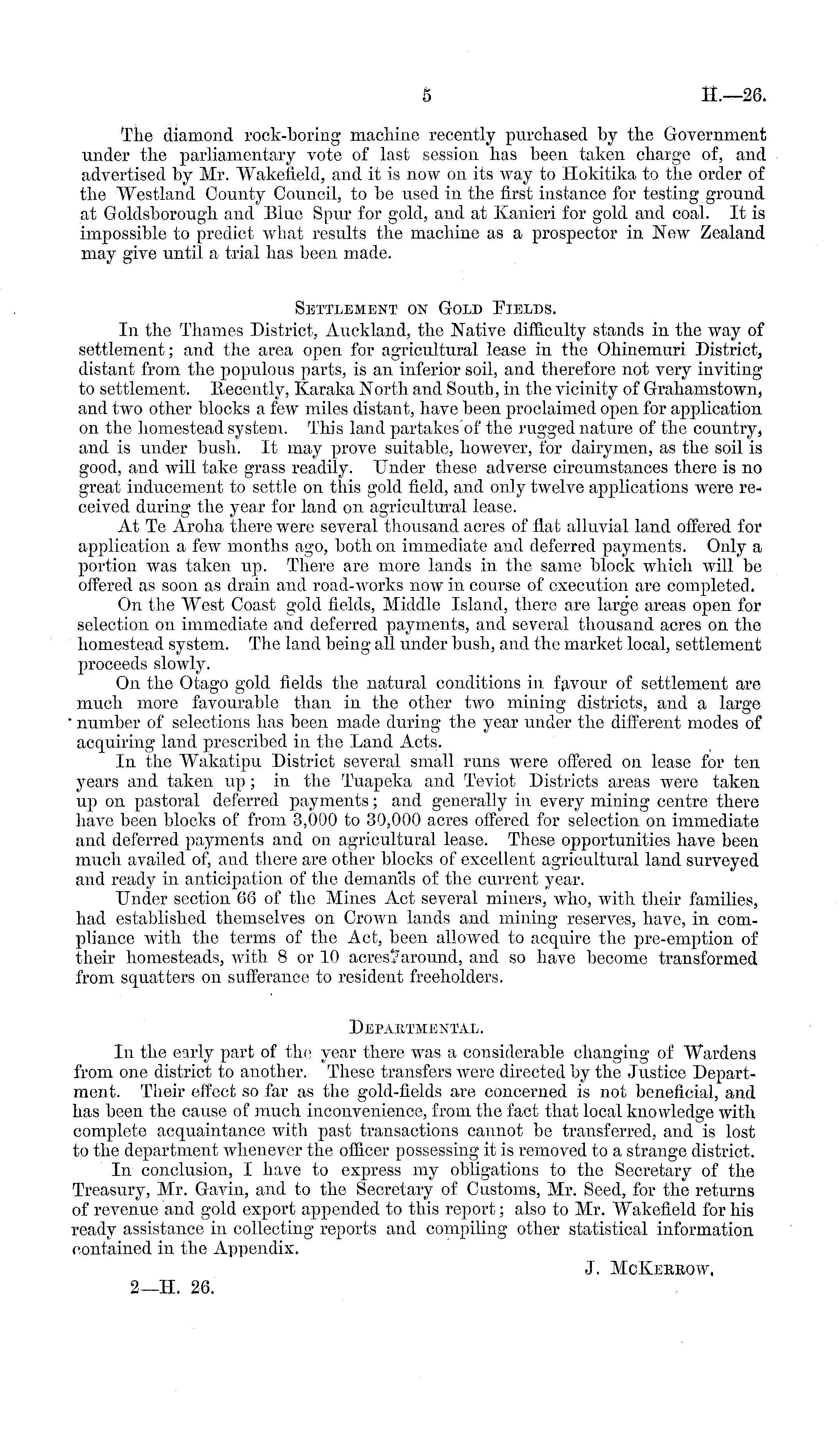 The diamond rock-boring machine recently purchased by the Government under the parliamentary vote of last session has been taken charge of, and advertised by Mr. Wakefield, and it is now on its way to Hokitika to the order of the Westland County Council, to be used in the first instance for testing ground at Goldsborough and Blue Spur for gold, and at Kanicri for gold and coal. It is impossible to predict what results the machine as a prospector in New Zealand may give until a trial has been made. Settlement on Gold Pields. In the Thames District, Auckland, the Native difficulty stands in the way of settlement; and the area open for agricultural lease in the Ohinemuri District, distant from the populous parts, is an inferior soil, and therefore not very inviting to settlement. Recently, Karaka North and South, in the vicinity of Grahamstown, and two other blocks a few miles distant, have been proclaimed open for application on the homestead system. This land partakes of the rugged nature of the country, and is under bush. It may prove suitable, however, for dairymen, as the soil is good, and will take grass readily. Under these adverse circumstances there is no great inducement to settle on this gold field, and only twelve applications were received during the year for land on agricultural lease. At Te Aroha there were several thousand acres of flat alluvial land offered for application a few months ago, both on immediate and deferred payments. Only a portion was taken up. There are more lands in the same block which will be offered as soon as drain and road-works now in course of execution are completed. On the West Coast gold fields, Middle Island, there are large areas open for selection on immediate and deferred payments, and several thousand acres on the homestead system. The land being all under bush, and the market local, settlement proceeds slowly. On the Otago gold fields the natural conditions in favour of settlement are much more favourable than in the other two mining districts, and a large • number of selections has been made during the year under the different modes of acquiring land prescribed in the Land Acts. In the Wakatipu District several small runs were offered on lease for ten years and taken up ; in the Tuapeka and Teviot Districts areas were taken up on pastoral deferred payments; and generally in every mining centre there have been blocks of from 3,000 to 30,000 acres offered for selection on immediate and deferred payments and on agricultural lease. These opportunities have been much availed of, and there are other blocks of excellent agricultural land surveyed and ready in anticipation of the demands of the current year. Under section 66 of the Mines Act several miners, who, with their families, had established themselves on Crown lands and mining reserves, have, in compliance with the terms of the Act, been allowed to acquire the pre-emption of their homesteads, with 8 or 10 acres?around, and so have become transformed from squatters on sufferance to resident freeholders. Departmental. In the early part of tin- year there was a considerable changing of Wardens from one district to another. These transfers were directed by the Justice Department. Their effect so far as the gold-fields are concerned is not beneficial, and has been the cause of much inconvenience, from the fact that local knowledge with complete acquaintance with past transactions cannot be transferred, and is lost to the department whenever the officer possessing it is removed to a strange district. In conclusion, I have to express my obligations to the Secretary of the Treasury, Mr. Gavin, and to the Secretary of Customs, Mr. Seed, for the returns of revenue and gold export appended to this report; also to Mr. Wakefield for his ready assistance in collecting reports and compiling other statistical information contained in the Appendix. J. McKerrow. 2—H. 26.