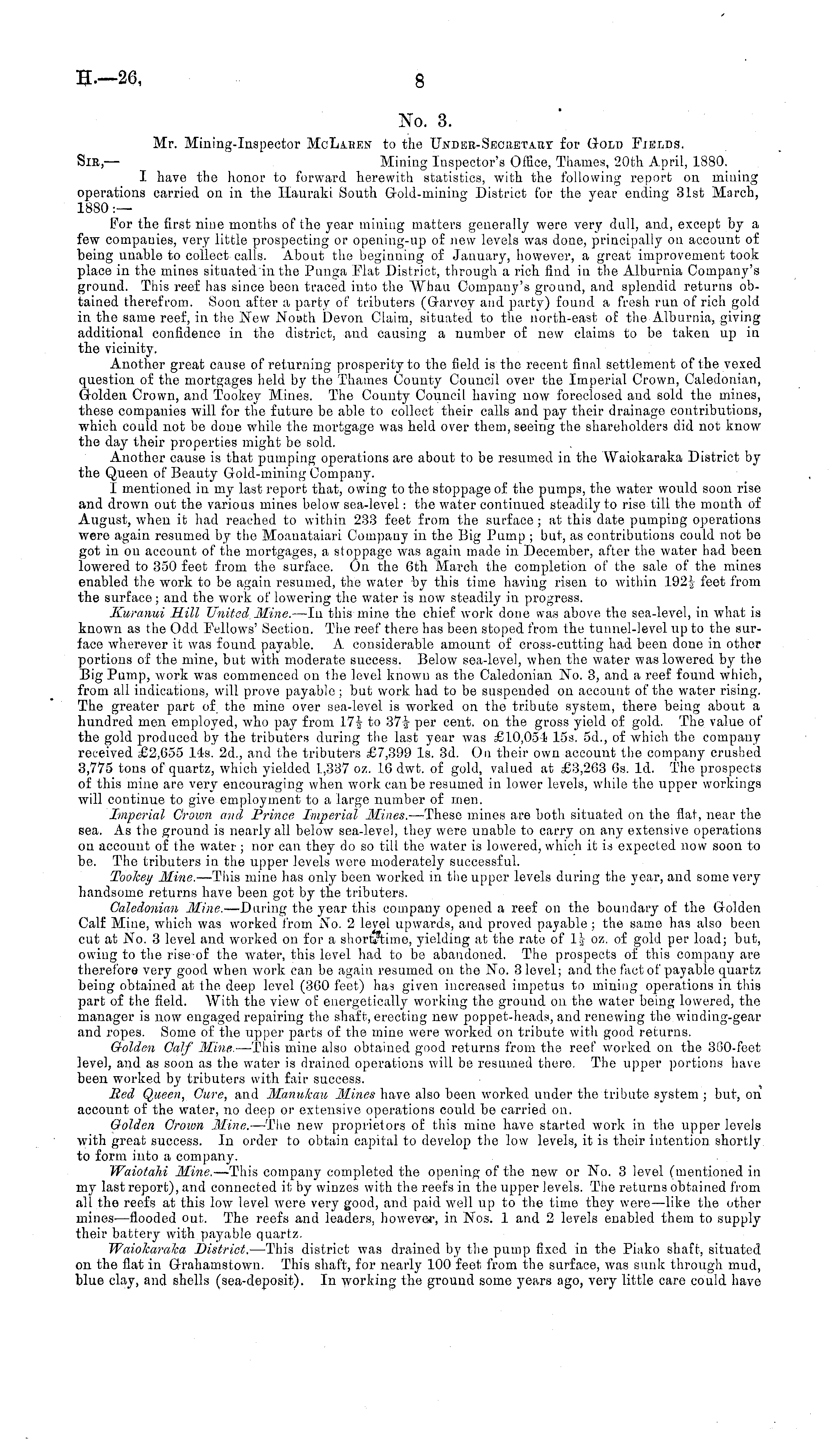 No. 3. Mr. Mining-Inspector McLaben to the Undee-Seceetaey for Gold Fields. Sic, — Mining Inspector's Office, Thames, 20th April, 1880. I have the honor to forward herewith statistics, with the following report on mining operations carried on in the Hauraki South Gold-mining District for the year ending 31st March, 1880 :— For the first nine months of the year mining matters generally were very dull, and, except by a few companies, very little prospecting or opening-up of new levels was done, principally on account of being unable to collect calls. About the beginning of January, however, a great improvement took place in the mines situated in the Punga Flat District, through a rich find in the Alburnia Company's ground. This reef has since been traced into the Whau Company's ground, and splendid returns obtained therefrom. Soon after a party of tributers (Garvcy and party) found a fresh run of rich gold in the same reef, in the New Nouth Devon Claim, situated to the north-east of the Alburnia, giving additional confidence in the district, and causing a number of new claims to be taken up in the vicinity. Another great cause of returning prosperity to the field is the recent final settlement of the vexed question of the mortgages held by the Thames County Council over the Imperial Crown, Caledonian, Golden Crown, and Tookey Mines. The County Council having now foreclosed and sold the mines, these companies will for the future be able to collect their calls and pay their drainage contributions, which could not be dove while the mortgage was held over them, seeing the shareholders did not know the day their properties might be sold. Another cause is that pumping operations are about to be resumed in the Waiokaraka District by the Queen of Beauty Gold-mining Company. I mentioned in my last report that, owing to the stoppage of the pumps, the water would soon rise and drown out the various mines below sea-level: the water continued steadily to rise till the month of August, when it had reached to within 233 feet from the surface; at this date pumping operations were again resumed by the Moauataiari Company in the Big Pump ; but, as contributions could not be got in on account of the mortgages, a stoppage was again made in December, after the water had been lowered to 350 feet from the surface. On the 6th March the completion of the sale of the mines enabled the work to be again resumed, the water by this time having risen to within 192?,- feet from the surface; and the work of lowering the water is now steadily in progress. Kuranui Hill United Mine. —In this mine the chief work done was above the sea-level, in what is known as the Odd Fellows' Section. The reef there has been stoped from the tunnel-level up to the surface wherever it was found payable. A considerable amount of cross-cutting had been done in other portions of the mine, but with moderate success. Below sea-level, when the water was lowered by the Big Pump, work was commenced on the level known as the Caledonian No. 3, and a reef found which, from all indications, will prove payable ; but work had to be suspended on account of the water rising. The greater part of the mine over sea-level is worked on the tribute system, there being about a hundred men employed, who pay from 17| to 37| per cent, on the gross yield of gold. The value of the gold produced by the tributers during the last year was £10,054 15s. 5d., of which the company received £2,655 14s. 2d., and the tributers £7,399 Is. 3d. On their own account the company crushed 3,775 tons of quartz, which yielded 1,337 oz. 16 dwt. of gold, valued at £3,263 6s. Id. The prospects of this mine are very encouraging when work can be resumed in lower levels, while the upper workings will continue to give employment to a large number of men. Imperial Crown and Prince Imperial Mines. —These mines are both situated on the flat, near the sea. As the ground is nearly all below sea-level, they were unable to carry on any extensive operations on account of the water ; nor can they do so till the water is lowered, which it is expected now soon to be. The tributers in the upper levels were moderately successful. Tookey Mine. —This mine has only been worked in the upper levels during the year, and some very handsome returns have been got by the tributers. Caledonian Mine. —During the year this company opened a reef on the boundary of the Golden Calf Mine, which was worked from No. 2 level upwards, and proved payable ; the same has also been cut at No. 3 level and worked on for a short/time, yielding at the rato of IJ, oz. of gold per load; but, owing to the rise-of the water, this level had to be abandoned. The prospects of this company are therefore very good when work can be again resumed on the No. 3 level; and the fact of payable quartz being obtained at the deep level (360 feet) has given increased impetus to mining operations in this part of the field. With the view of energetically working the ground on the water being lowered, the manager is now engaged repairing the shaft, erecting new poppet-heads, and renewing the winding-gear and ropes. Some of the upper parts of the mine were worked on tribute with good returns. Golden Calf Mine. —This mine also obtained good returns from the reef worked on the 360-feet level, and as soon as the water is drained operations will be resumed there. The upper portions have been worked by tributers with fair success. Red Queen, Cure, and Manukau Mines have also been worked under the tribute system ; but, on account of the water, no deep or extensive operations could be carried on. Golden Crown Mine. —The new proprietors of this mine have started work in the upper levels with great success. In order to obtain capital to develop the low levels, it is their intention shortly to form into a company. Waiotahi Mine. —This company completed the opening of the new or No. 3 level (mentioned in my last report), and connected it by winzes 