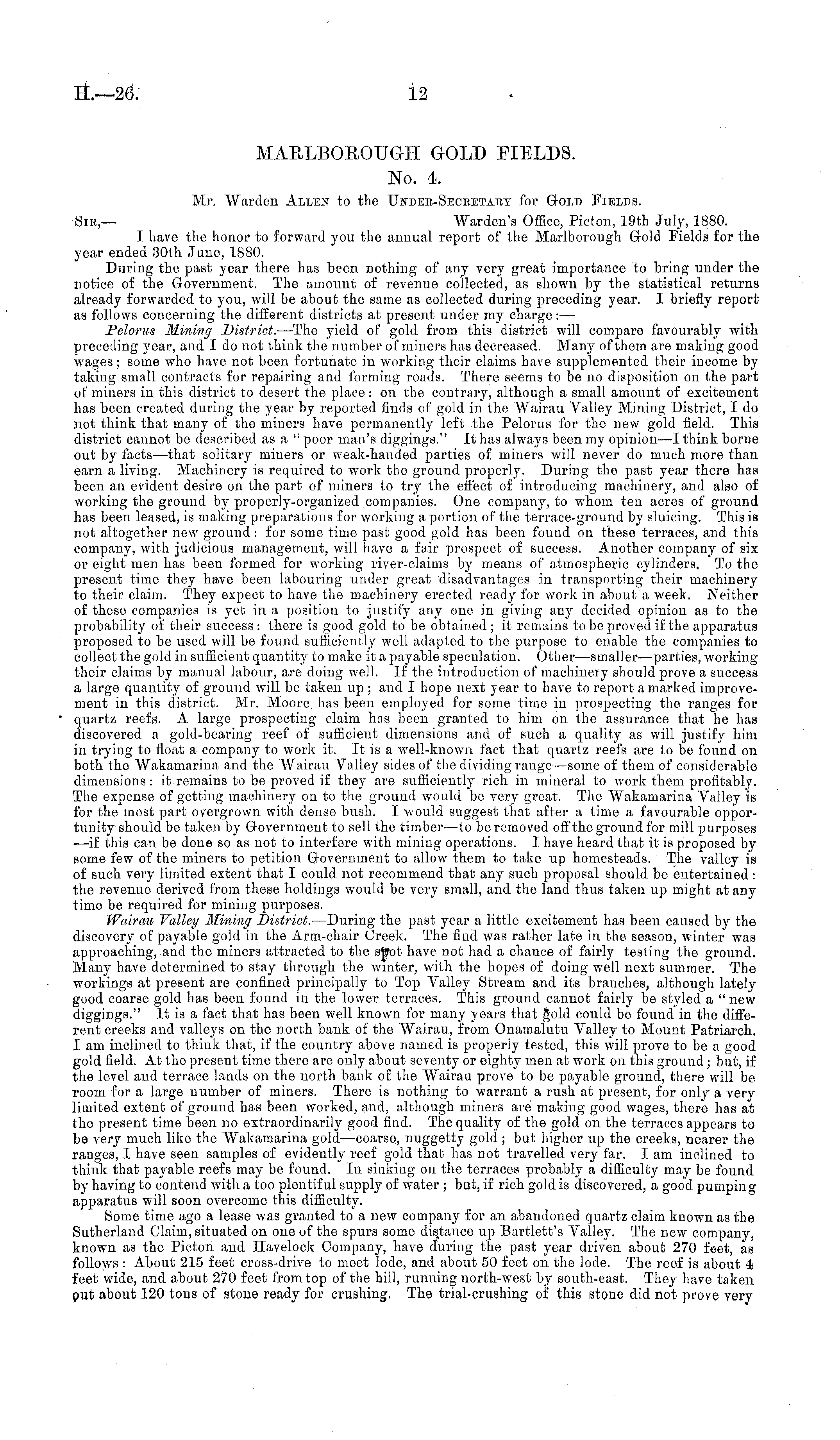 MARLBOROUGH GOLD FIELDS. No. 4. Mr. Warden Allen to the Undee-Secretaey for Gold Fields. Sir,— Warden's Office, Picton, 19th July, 1880. I have the honor to forward you the annual report of the Marlborough Gold Fields for the year ended 30th June, 1880. During the past year there has been nothing of any very great importance to bring under the notice of the Government. The amount of revenue collected, as shown by the statistical returns already forwarded to you, will be about the same as collected during preceding year. I briefly report as follows concerning the different districts at present under my charge:— Pelorus Mining District. —The yield of gold from this district will compare favourably with preceding year, and Ido not think the number of miners has decreased. Many of them are making good wages; some who have not been fortunate in working their claims have supplemented their income by taking small contracts for repairing and forming roads. There seems to be no disposition on the part of miners in this district to desert the place : on the contrary, although a small amount of excitement has been created during the year by reported finds of gold in the Wairau Valley Mining District, I do not think that many of the miners have permanently left the Pelorus for the new gold field. This district cannot be described as a " poor man's diggings." It has always been my- opinion—l think borne out by facts—that solitary miners or weak-handed parties of miners will never do much more than earn a living. Machinery is required to work the ground properly. During the past year there has been an evident desire on the part of miners to try the effect of introducing machinery, and also of working the ground by properly-organized companies. One company, to whom ten acres of ground has been leased, is making preparations for working a portion of the terrace-ground by sluicing. This is not altogether new ground: for some time past good gold has been found on these terraces, and this company, with judicious management, will have a fair prospect of success. Another company of six or eight men has been formed for working river-claims by means of atmospheric cylinders. To the present time they have been labouring under great disadvantages in transporting their machinery to their claim. They expect to have the machinery erected ready for work in about a week. Neither of these companies is yet in a position to justify any one in giving any decided opinion as to the probability of their success : there is good gold to be obtained ; it remains to be proved if the apparatus proposed to be used will be found sufficiently well adapted to the purpose to enable the companies to collect the gold in sufficient quantity to make it a payable speculation. Other—smaller—parties, working their claims by manual labour, are doing well. If the introduction of machinery should prove a success a large quantity of ground will be taken up ; and I hope next year to have to report a marked improvement in this district. Mr. Moore has been employed for some time in prospecting the ranges for quartz reefs. A large prospecting claim has been granted to him on the assurance that he has discovered a gold-bearing reef of sufficient dimensions and of such a quality as will justify him in trying to float a company to work it. It is a well-known fact that quartz reefs are to be found on both the Wakamarina and the Wairau Valley sides of the dividing range—some of them of considerable dimensions: it remains to be proved if they are sufficiently rich in mineral to work them profitably. The expense of getting machinery on to the ground would be very great. The Wakamarina Valley is for the most part overgrown with dense bush. I would suggest that after a time a favourable opportunity should be taken by Government to sell the timber—to be removed off the ground for mill purposes —if this can be done so as not to interfere with mining operations. I have heard that it is proposed by some few of the miners to petition Government to allow them to take up homesteads. The valley is of such very limited extent that I could not recommend that any such proposal should be entertained: the revenue derived from these holdings would be \ery small, and the land thus taken up might at any time be required for mining purposes. Wairau Valley Mining District. —During the past year a little excitement has been caused by the discovery of payable gold in the Arm-chair Creek. The find was rather late in the season, winter was approaching, and the miners attracted to the spot have not had a chance of fairly testing the ground. Many have determined to stay through the winter, with the hopes of doing well next summer. The workings at present are confined principally to Top Valley Stream and its branches, although lately good coarse gold has been found in the lower terraces. This ground cannot fairly be styled a " new diggings." It is a fact that has been well known for many years that gold could be found in the different creeks and valleys on the north bank of the Wairau, from Onamalutu Valley to Mount Patriarch. I am inclined to think that, if the country above named is properly tested, this will prove to be a good gold field. At the present time there are only about seventy or eighty men at work on this ground ; but, if the level and terrace lands on the north bank of the Wairau prove to be payable ground, there will be room for a large number of miners. There is nothing to warrant a rush at present, for only a very limited extent of ground has been worked, and, although miners are making good wages, there has at the present time been no extraordinarily good find. The quality of the gold on the terraces appears to be very much like the Wakamarina gold—coarse, nuggetty gold; but higher up the creeks, nearer the ranges, I have seen samples of evidently reef gold that has not travelled very far. lam inclined to think that payable reefs may be fo