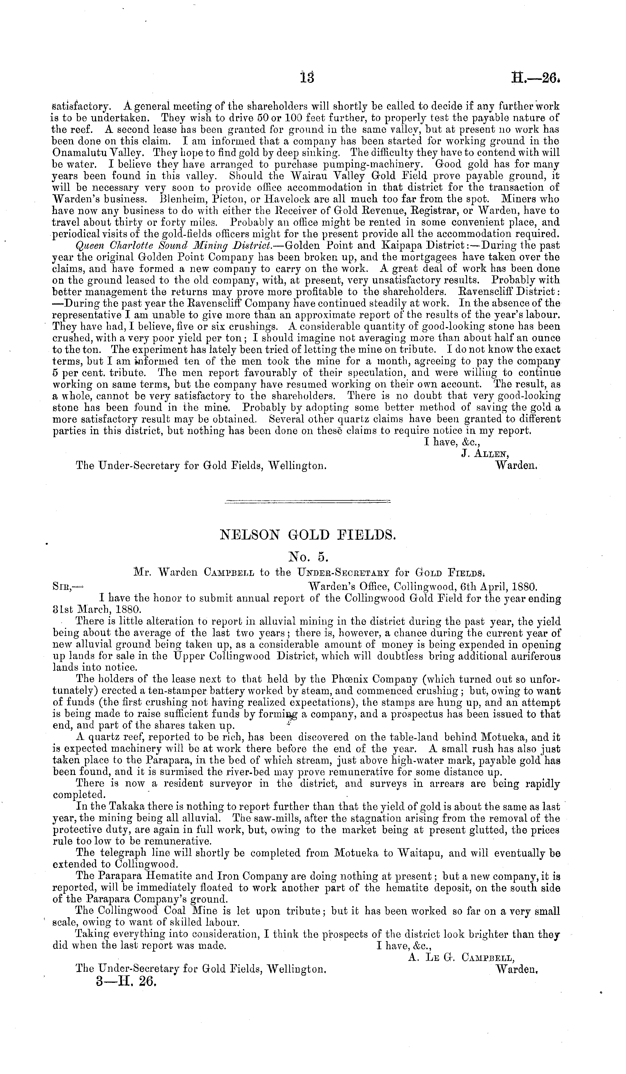 NELSON GOLD EIELDS. No. 5. Mr. Warden Campbell to the Undee-Secretaey for Gold FieldSs Sic,— Warden's Office, Collingwood, 6th April, 1880. I have the honor to submit annual report of the Collingwood Gold Field for the year ending 81st March, 1880. There is little alteration to report in alluvial mining in the district during the past year, the yield being about the average of the last two years ; there is, however, a chance during the current year of new alluvial ground being taken up, as a considerable amount of money is being expended in opening up lands for sale in the Upper Collingwood District, which will doubtless bring additional auriferous lands into notice. The holders of the lease next to that held by the Phoenix Company (which turned out so unfortunately) erected a ten-stamper battery worked by steam, and commenced crushing ; but, owing to want of funds (the first crushing not having realized expectations), the stamps are hung up, and an attempt is being made to raise sufficient funds by forming a company, and a prospectus has been issued to that end, and part of the shares taken up. A quartz reef, reported to be rich, has been discovered on the table-land behind Motueka, and it is expected machinery will be at work there before the end of the year. A small rush has also just taken place to the Parapara, in the bed of which stream, just above high-water mark, payable gold has been found, and it is surmised the river-bed may prove remunerative for some distance up. There is now a resident surveyor in the district, and surveys in arrears are being rapidly completed. In the Takaka there is nothing to report further than that the yield of gold is about the same as last year, the mining being all alluvial. The saw-mills, after the stagnation arising from the removal of the protective duty, are again in full work, but, owing to the market being at present glutted, the prices rule too low to be remunerative. The telegraph line will shortly be completed from Motueka to Waitapu, and will eventually be extended to Collingwood. The Parapara Hematite and Iron Company are doing nothing at present; but a new company, it is reported, will be immediately floated to work another part of the hematite deposit, on the south side of the Parapara Company's ground. The Collingwood Coal Mine is let upon tribute; but it has been worked so far on a very small scale, owing to want of skilled labour. Taking everything into consideration, I think the prospects of the district look brighter than they did when the last report was made. I have, &c, A. Le G. Campbell, The Under-Secretary for Gold Fields, Wellington. Warden, 3—II. 26.
