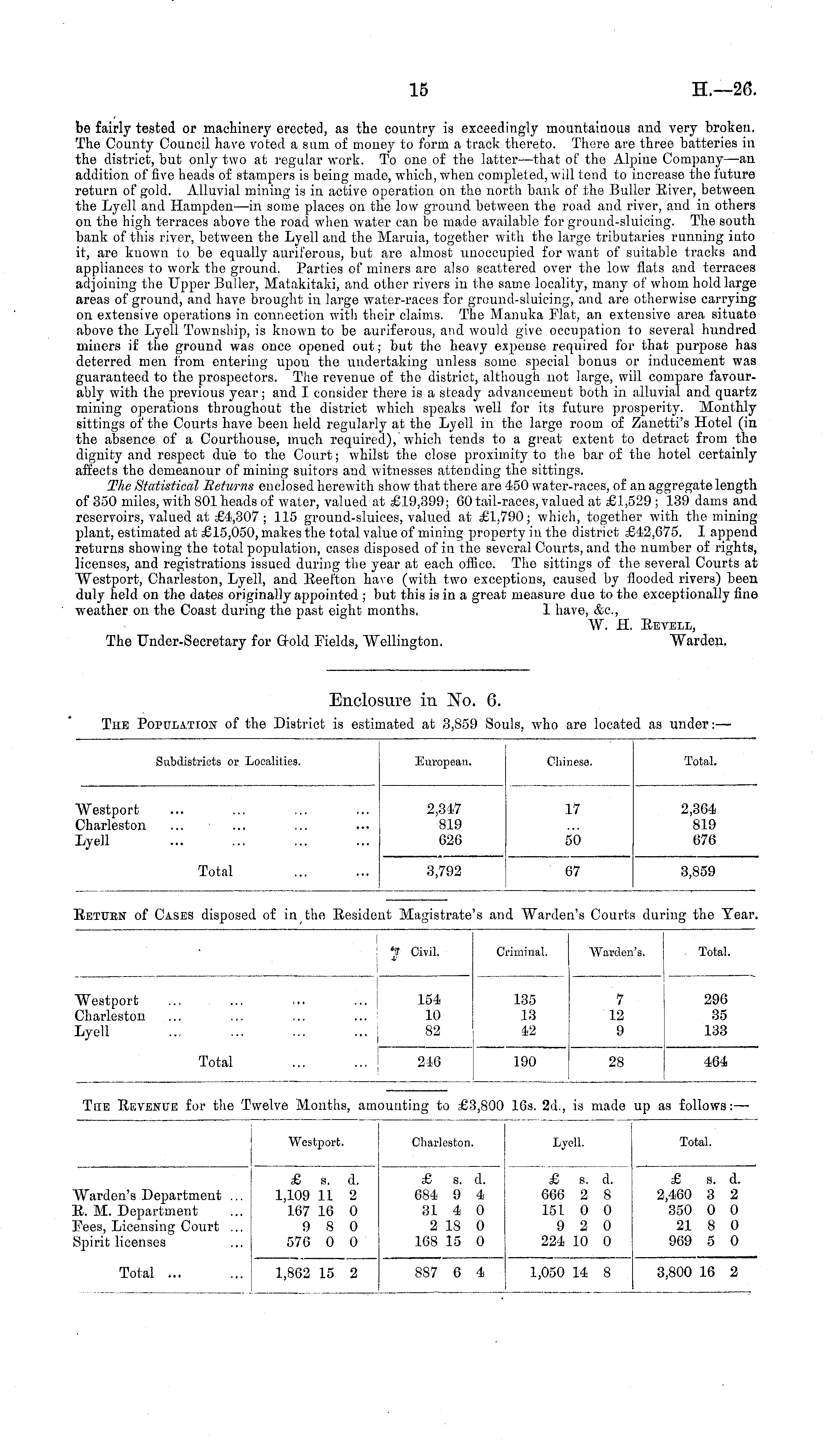 be fairly tested or machinery erected, as the country is exceedingly mountainous and very broken. The County Council have voted a sum of money to form a track thereto. There are three batteries in the district, but only two at regular work. To one of the latter —that of the Alpine Company —an addition of five heads of stampers is being made, which, when completed, will tend to increase the future return of gold. Alluvial mining is in active operation on the north bank of the Buller River, between the Lyell and Hampden —in some places on the low ground between the road and river, and in others on the high terraces above the road when water can be made available for ground-sluicing. The south bank of this river, between the Lyell and the Maruia, together with the large tributaries running into it, are known to be equally auriferous, but are almost unoccupied for want of suitable tracks and appliances to work the ground. Parties of miners are also scattered over the low flats and terraces adjoining the Upper Buller, Matakitaki, and other rivers in the same locality, many of whom hold large areas of ground, and have brought in largo water-races for ground-sluicing, and are otherwise carrying on extensive operations in connection with their claims. The Manuka Flat, an extensive area situate above the Lyell Township, is known to be auriferous, and would give occupation to several hundred miners if the ground was once opened out; but the heavy expense required for that purpose has deterred men from entering upon the undertaking unless some special bonus or inducement was guaranteed to the prospectors. The revenue of the district, although not large, will compare favourably with the previous year; and I consider there is a steady advancement both in alluvial and quartz mining operations throughout the district which speaks well for its future prosperity. Monthly sittings of the Courts have been held regularly at the Lyell in the large room of Zanetti's Hotel (in the absence of a Courthouse, much required), which tends to a great extent to detract from the dignity and respect due to the Court; whilst the close proximity to the bar of the hotel certainly affects the demeanour of mining suitors and witnesses attending the sittings. The Statistical Returns enclosed herewith show that there are 450 water-races, of an aggregate length of 350 miles, with 801 heads of water, valued at £19,399; 60 tail-races, valued at £1,529 ; 139 dams and reservoirs, valued at £4,307 ; 115 ground-sluices, valued at £1,790; which, together with the mining plant, estimated at £15,050, makes the total value of mining property in the district £42,675. I append returns showing the total population, cases disposed of in the several Courts, and the number of rights, licenses, and registrations issued during the year at each office. The sittings of the several Courts at Westport, Charleston, Lyell, and Eeefton have (with two exceptions, caused by flooded rivers) been duly held on the dates originally appointed ; but this is in a great measure due to the exceptionally fine weather on the Coast during the past eight months. 1 have, &c, W. H. Eevell, The Under-Secretary for Gold Fields, "Wellington. "Warden.