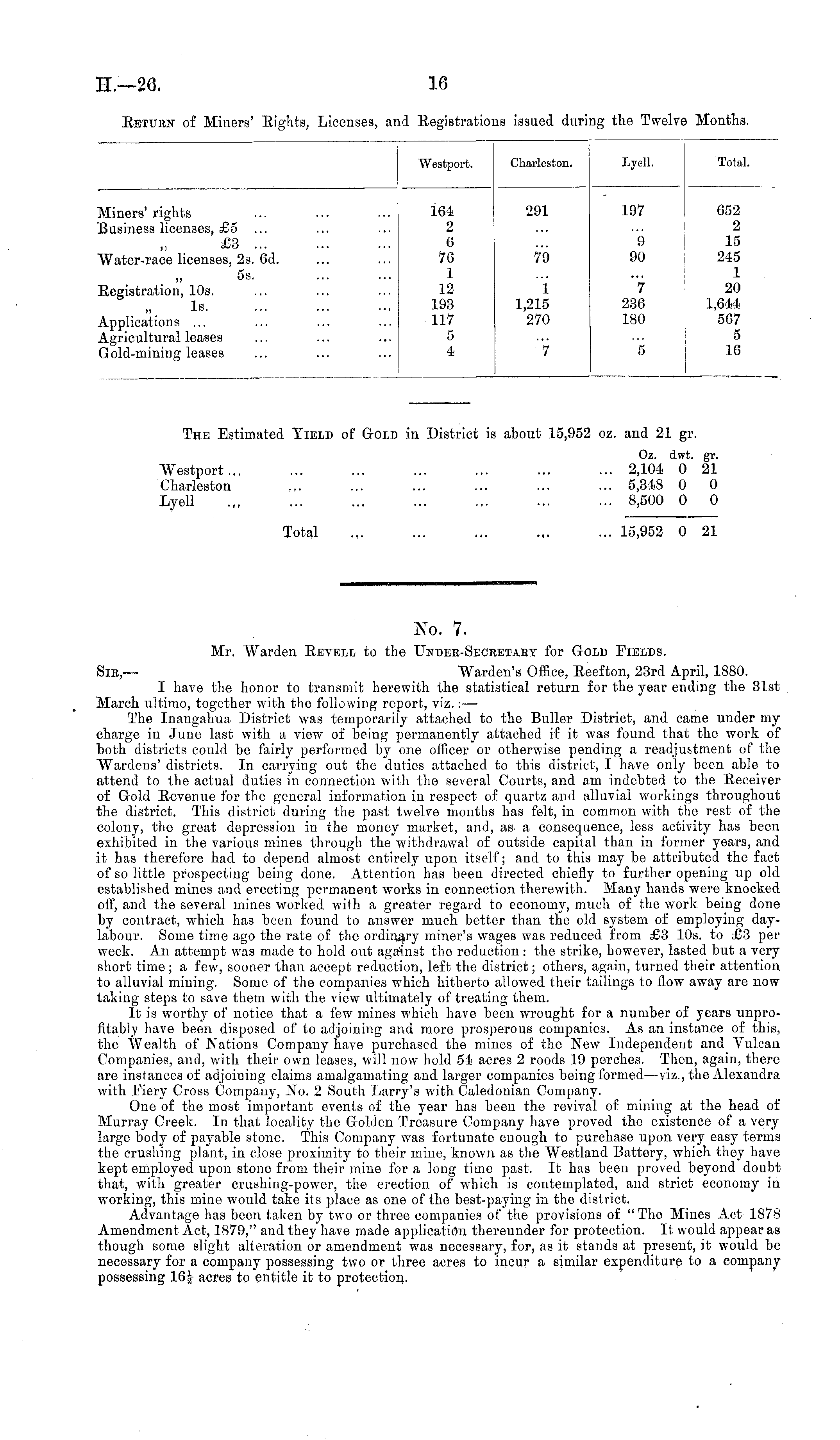 No. 7. Mr. Warden Retell to the Undee-Seceetaey for Gold Fields. Sic,— Warden's Office, Reefton, 23rd April, 1880. I have the honor to transmit herewith the statistical return for the year ending the 31st March ultimo, together with the following report, viz.; — The Inangahua District was temporarily attached to the Buller District, and came under my charge in June last with a view of being permanently attached if it was found that the work of both districts could be fairly performed by one officer or otherwise pending a readjustment of the Wardens' districts. In carrying out the duties attached to this district, I have only been able to attend to the actual duties in connection with the several Courts, and am indebted to the Receiver of Gold Revenue for the general information in respect of quartz and alluvial workings throughout the district. This district during the past twelve months has felt, in common with the rest of the colony, the great depression in the money market, and, as- a consequence, less activity has been exhibited in the various mines through the withdrawal of outside capital than in former years, and it has therefore had to depend almost entirely upon itself; and to this may be attributed the fact of so little prospecting being done. Attention has been directed chiefly to further opening up old established mines and erecting permanent works in connection therewith. Many hands were knocked off, and the several mines worked with a greater regard to economy, much of the work being done by contract, which has been found to answer much better than the old system of employing daylabour. Some time ago the rate of the ordinary miner's wages was reduced from £3 10s. to £3 petweek. An attempt was made to hold out against the reduction: the strike, however, lasted but a very short time; a few, sooner than accept reduction, left the district; others, again, turned their attention to alluvial mining. Some of the companies which hitherto allowed their tailings to flow away are now taking steps to save them with the view ultimately of treating them. It is worthy of notice that a few mines which have been wrought for a number of years unprofitable have been disposed of to adjoining and more prosperous companies. As an instance of this, the Wealth of Nations Company have purchased the mines of tho New Independent and Vulcan Companies, and, with their own leases, will now hold 54 acres 2 roods 19 perches. Then, again, there are instances of adjoining claims amalgamating and larger companies being formed —viz., the Alexandra with Fiery Cross Company, No. 2 South Larry's with Caledonian Company. One of the most important events of the year has been the revival of mining at the head of Murray Creek. In that locality the Golden Treasure Company have proved the existence of a very large body of payable stone. This Company was fortunate enough to purchase upon very easy terms the crushing plant, in close proximity to their mine, known as the Westland Battery, which they have kept employed upon stone from their mine for a long time past. It has been proved beyond doubt that, with greater crushiug-power, the erection of which is contemplated, and strict economy in working, this mine would take its place as one of the best-paying in the district. Advantage has been taken by two or three companies of the provisions of " The Mines Act 1878 Amendment Act, 1879," and they have made application thereunder for protection. It would appear as though some slight alteration or amendment was necessary, for, as it stands at present, it would be necessary for a company possessing two or three acres to incur a similar expenditure to a company possessing 16J acres to entitle it to protection.