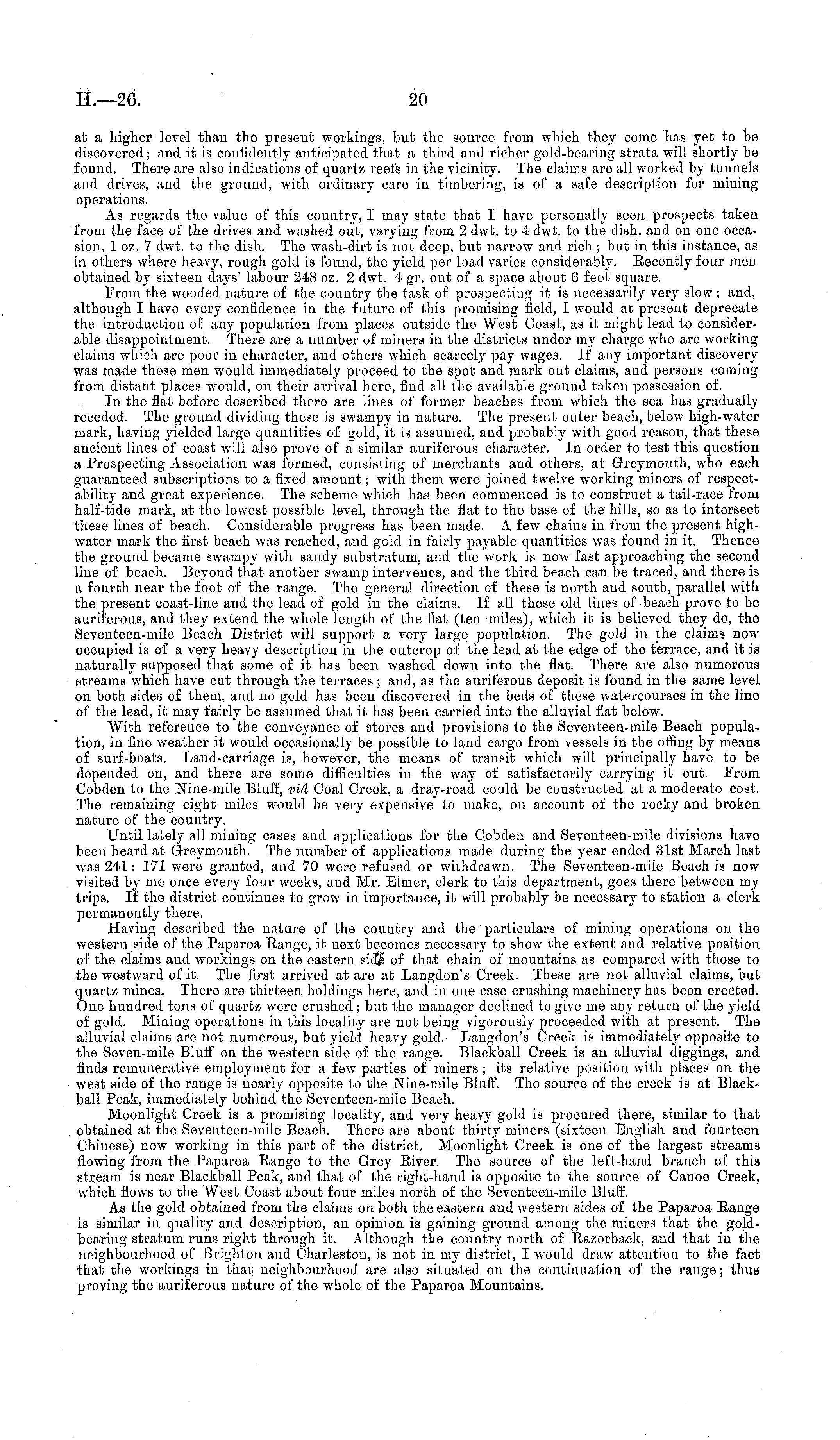 at a higher level than the present workings, but the source from which they come has yet to be discovered; and it is confidently anticipated that a third and richer gold-bearing strata will shortly be found. There are also indications of quartz reefs in the vicinity. The claims are all worked by tunnels and drives, and the ground, with ordinary care in timbering, is of a safe description for mining operations. As regards the value of this country, I may state that I have personally seen prospects taken from the face of the drives and washed out, varying from 2 dwt. to 4 dwt. to the dish, and on one occasion, 1 oz. 7 dwt. to the dish. The wash-dirt is not deep, but narrow and rich ; but in this instance, as in others where heavy, rough gold is found, the yield per load varies considerably. Recently four men obtained by sixteen days' labour 248 oz. 2 dwt. 4 gr. out of a space about 6 feet square. From the wooded nature of the country the task of prospecting it is necessarily very slow; and, although I have every confidence in the future of this promising field, I would at present deprecate the introduction of any population from places outside the West Coast, as it might lead to considerable disappointment. There are a number of miners in the districts under my charge who are working claims which are poor in character, and others which scarcely pay wages. If auy important discovery was made these men would immediately proceed to the spot and mark out claims, and persons coming from distant places would, on their arrival here, find all the available ground taken possession of. In the flat before described there are lines of former beaches from which the sea has gradually receded. The ground dividing these is swampy in nature. The present outer beach, below high-water mark, having yielded largo quantities of gold, it is assumed, and probably with good reason, that these ancient lines of coast will also prove of a similar auriferous character. In order to test this question a Prospecting Association was formed, consisting of merchants and others, at Greymouth, who each guaranteed subscriptions to a fixed amount; with them were joined twelve working miners of respectability and great experience. The scheme which has been commenced is to construct a tail-race from half-tide mark, at the lowest possible level, through the flat to the base of the hills, so as to intersect these lines of beach. Considerable progress has been made. A few chains in from the present highwater mark the first beach was reached, and gold iv fairly payable quantities was found in it. Thence the ground became swampy with sandy substratum, and the work is now fast approaching the second line of beach. Beyond that another swamp intervenes, and the third beach can be traced, and there is a fourth near the foot of the range. The general direction of these is north and south, parallel with the present coast-line and the lead of gold in the claims. If all these old lines of beach prove to be auriferous, and they extend the whole length of the flat (ten miles), which it is believed they do, the Seventeen-mile Beach District will support a very large population. The gold in the claims now occupied is of a very heavy description in the outcrop of the lead at the edge of the terrace, and it is naturally supposed that some of it has been washed down into the flat. There are also numerous streams which have cut through the terraces ; and, as the auriferous deposit is found in the same level on both sides of them, and no gold has been discovered in the beds of these watercourses in the line of the lead, it may fairly be assumed that it has been carried into the alluvial flat below. With reference to the conveyance of stores and provisions to tho Seventeen-mile Beach population, in fine weather it would occasionally be possible to land cargo from vessels in the offing by means of surf-boats. Land-carriage is, however, the means of transit which will principally have to be depended on, and there are some difficulties in the way of satisfactorily carrying it out. From Cobden to the Nine-mile Bluff, via Coal Creek, a dray-road could be constructed at a moderate cost. The remaining eight miles would be very expensive to make, on account of the rocky and broken nature of the country. Until lately all mining cases and applications for the Cobden and Seventeen-mile divisions have been heard at Greymouth. The number of applications made during the year ended 31st March last was 241: 171 were granted, and 70 were refused or withdrawn. The Seventeen-mile Beach is now visited by mo once every four weeks, and Mr. Elmer, clerk to this department, goes there between my trips. If the district continues to grow in importance, it will probably be necessary to station a clerk permanently there. Having described the nature of the country and the particulars of mining operations on the western side of the Paparoa Range, it next becomes necessary to show the extent and relative position of the claims and workings on the eastern side of that chain of mountains as compared with those to the westward of it. The first arrived at are at Langdon's Creek. These are not alluvial claims, but quartz mines. There are thirteen holdings here, and in one case crushing machinery has been erected. One hundred tons of quartz were crushed; but the manager declined to give me any return of the yield of gold. Mining operations iv this locality are not being vigorously proceeded with at present. The alluvial claims are not numerous, but yield heavy gold. Langdon's Creek is immediately opposite to the Seven-mile Bluff on the western side of the range. Blackball Creek is an alluvial diggings, and finds remunerative employment for a few parties of miners ; its relative position with places on the west side of the range is nearly opposite to the Nine-mile Bluff. The source of the creek is at Blackball Peak, immediately behind the Seventeen-mile Beach. Moonlight Creek is a promisin