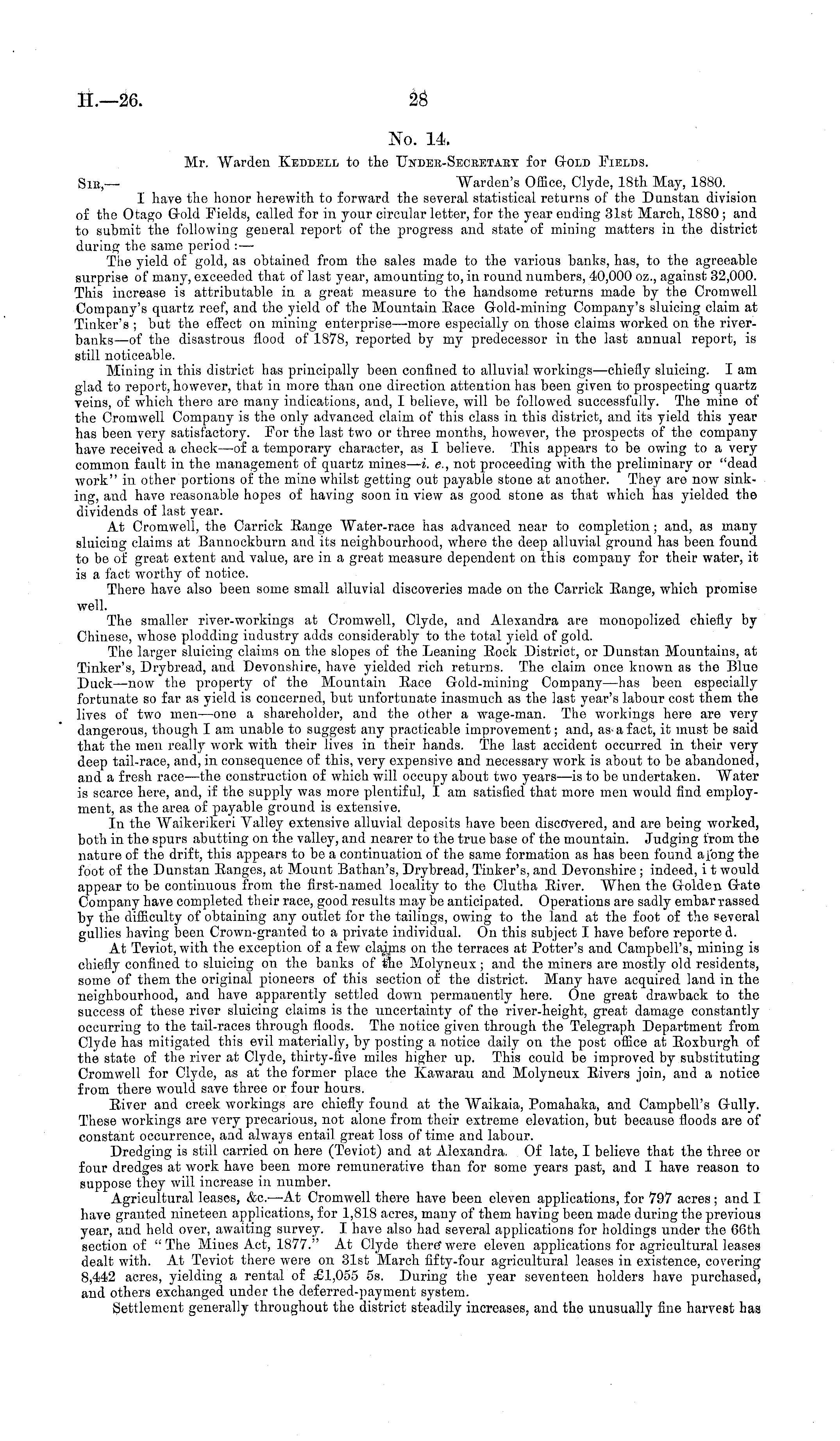 No. 14. Mr. Warden Keddell to the Undee-Seceetaey for Gold Fields. Sib,— Warden's Office, Clyde, 18th May, 1880. I have the honor herewith to forward the several statistical returns of the Dunstan division of the Otago Gold Fields, called for in your circular letter, for the year ending 31st March, 1880 ; and to submit the following general report of the progress and state of mining matters in the district during the same period : — The yield of gold, as obtained from the sales made to the various banks, has, to the agreeable surprise of many, exceeded that of last year, amounting to, in round numbers, 40,000 oz., against 32,000. This increase is attributable in a great measure to the handsome returns made by the Cromwell Company's quartz reef, and the yield of the Mountain Race Gold-mining Company's sluicing claim at Tinker's ; but the effect on mining enterprise —more especially on those claims worked on the riverbanks —of the disastrous flood of 1878, reported by my predecessor in the last annual report, is still noticeable. Mining in this district has principally been confined to alluvial workings—chiefly sluicing. lam glad to report, however, that in more than one direction attention has been given to prospecting quartz veins, of which there are many indications, and, I believe, will be followed successfully. The mine of the Cromwell Company is the only advanced claim of this class in this district, and its yield this year has been very satisfactory. For the last two or three months, however, the prospects of the company have received a check —of a temporary character, as I believe. This appears to be owing to a very common fault in the management of quartz mines— i. c., not proceeding with the preliminary or "dead work" in other portions of the mine whilst getting out payable stone at another. They are now sinking, and have reasonable hopes of having soon in view as good stone as that which has yielded the dividends of last year. At Cromwell, the Carrick Range Water-race has advanced near to completion; and, as many sluicing claims at Bannockburn and its neighbourhood, where the deep alluvial ground has been found to be of great extent and value, are in a great measure dependent on this company for their water, it is a fact worthy of notice. There have also been some small alluvial discoveries made on the Carrick Range, which promise well. The smaller river-workings at Cromwell, Clyde, and Alexandra are monopolized chiefly by Chinese, whose plodding industry adds considerably to the total yield of gold. The larger sluicing claims on the slopes of the Leaning Rock District, or Dunstan Mountains, at Tinker's, Drybread, and Devonshire, have yielded rich returns. The claim once known as the Blue Duek —now the property of the Mountain Race Gold-mining Company —has been especially fortunate so far as yield is concerned, but unfortunate inasmuch as the last year's labour cost them the lives of two men —one a shareholder, and the other a wage-man. The workings here are very dangerous, though lam unable to suggest any practicable improvement; and, as a fact, it must be said that the men really work with their lives in their hands. The last accident occurred in their very deep tail-race, and, in consequence of this, very expensive and necessary work is about to be abandoned, and a fresh race —the construction of which will occupy about two years —is to be undertaken. Water is scarce here, and, if the supply was more plentiful, I am satisfied that more men would find employment, as the area of payable ground is extensive. In the Waikerikeri Valley extensive alluvial deposits have been discovered, and are being worked, both in the spurs abutting on the valley, and nearer to the true base of the mountain. Judging from the nature of the drift, this appears to be a continuation of the same formation as has been found along the foot of the Dunstan Ranges, at Mount Bathan's, Drybread, Tinker's, and Devonshire ; indeed, i t would appear to be continuous from the first-named locality to the Clutha River. When the Golden Gate Company have completed their race, good results may be anticipated. Operations are sadly embarrassed by the difficulty of obtaining any outlet for the tailings, owing to the land at the foot of the several gullies having been Crown-granted to a private individual. On this subject I have before reporte d. At Teviot, with the exception of a few claims on the terraces at Potter's and Campbell's, mining is chiefly confined to sluicing on the banks of the Molyneux; and the miners are mostly old residents, some of them the original pioneers of this section of the district. Many have acquired land in the neighbourhood, and have apparently settled down permanently here. One great drawback to the success of these river sluicing claims is the uncertainty of the river-height, great damage constantly occurring to the tail-races through floods. The notice given through the Telegraph Department from Clyde has mitigated this evil materially, by posting a notice daily on the post office at Roxburgh of the state of the river at Clyde, thirty-five miles higher up. This could be improved by substituting Cromwell for Clyde, as at the former place the Kawarau and Molyneux Rivers join, and a notice from there would save three or four hours. River and creek workings are chiefly found at the Waikaia, Pomahaka, and Campbell's Gully. These workings are very precarious, not alone from their extreme elevation, but because floods are of constant occurrence, and always entail great loss of time and labour. Dredging is still carried on here (Teviot) and at Alexandra. Of late, I believe that the three or four dredges at work have been more remunerative than for some years past, and I have reason to suppose they will increase in number. Agricultural leases, &c.* —At Cromwell there have been eleven applications, for 797 acres; and I have granted nineteen applications, for 1,818 acres, ma