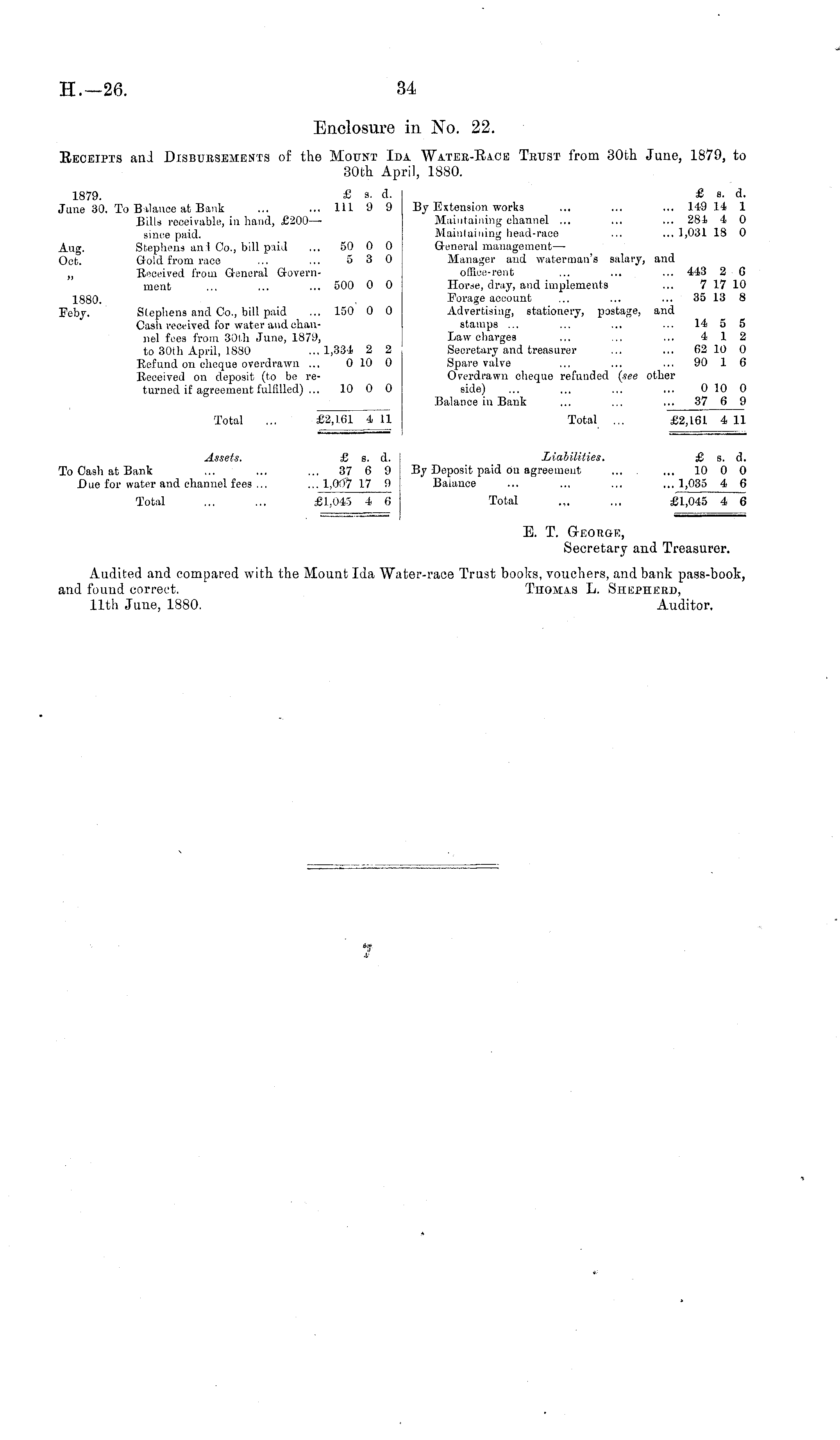 Enclosure in No. 22. Receipts and Disbursements of the Mount Ida Water-Race Trust from 30th June, 1879, to 30th April, 1880. 1879. £ a. d. £ s. d. June 30. To B-lanee at Bank ... ... 11l 9 9 By Extension works ... ... ... 149 14 1 BilU receivable, in hand, £200— Maintaining channel ... ... ... 281 4 0 since paid. Maintaining head-race ... ... 1,031 18 0 Aug. Stephens an I Co., bill paid ... 50 0 0 General management — Oct. Gold from race ... ... 5 3 0 Manager and waterman's salary, and „ Received from General Govern- office-rent ... ... ... 443 2 G merit ... ... ... 500 0 0 Horse, dray, and implements ... 7 17 10 1880. Forage account ... ... ... 35 13 8 Feby. Stephens and Co., bill paid ... 150 0 0 Advertising, stationery, postage, and Cash received for water and chan- stamps ... ... ... ... 14 5 5 nel fees from 30th June, 1879, Law charges ... ... ... 4 12 to 30th April, 1880 ...1,331* 2 2 Secretary and treasurer ... ... 62 10 0 Refund on cheque overdrawn ... 010 0 Spare valve ... ... ... 90 1 6 Received on deposit (to be re- Overdrawn cheque refunded (see other turned if agreement fulfilled) ..'. 10 0 0 side) ... ... ... ... 010 0 Balance in Bank ... ... 37 6 9 Total ... £2,1.61 411 Total ... £2,161 411 Assets. £ 8. d. Liabilities. £ s. d. To Cash at Bank ... ... ... 37 G 9 By Deposit paid on agreement ... ... 10 0 0 One for water and channel fees ... ... 1,007 17 9 Balance ... ... ... ...1,035 4 6 Total ... ... £1,045 4 6 Total ... ... £1,045 4 6 E. T. George, Secretary and Treasurer. Audited and compared with the Mount Ida Water-race Trust books, vouchers, and bank pass-book, and found correct. Thomas L. Shepherd, 11th June, 1880. Auditor.