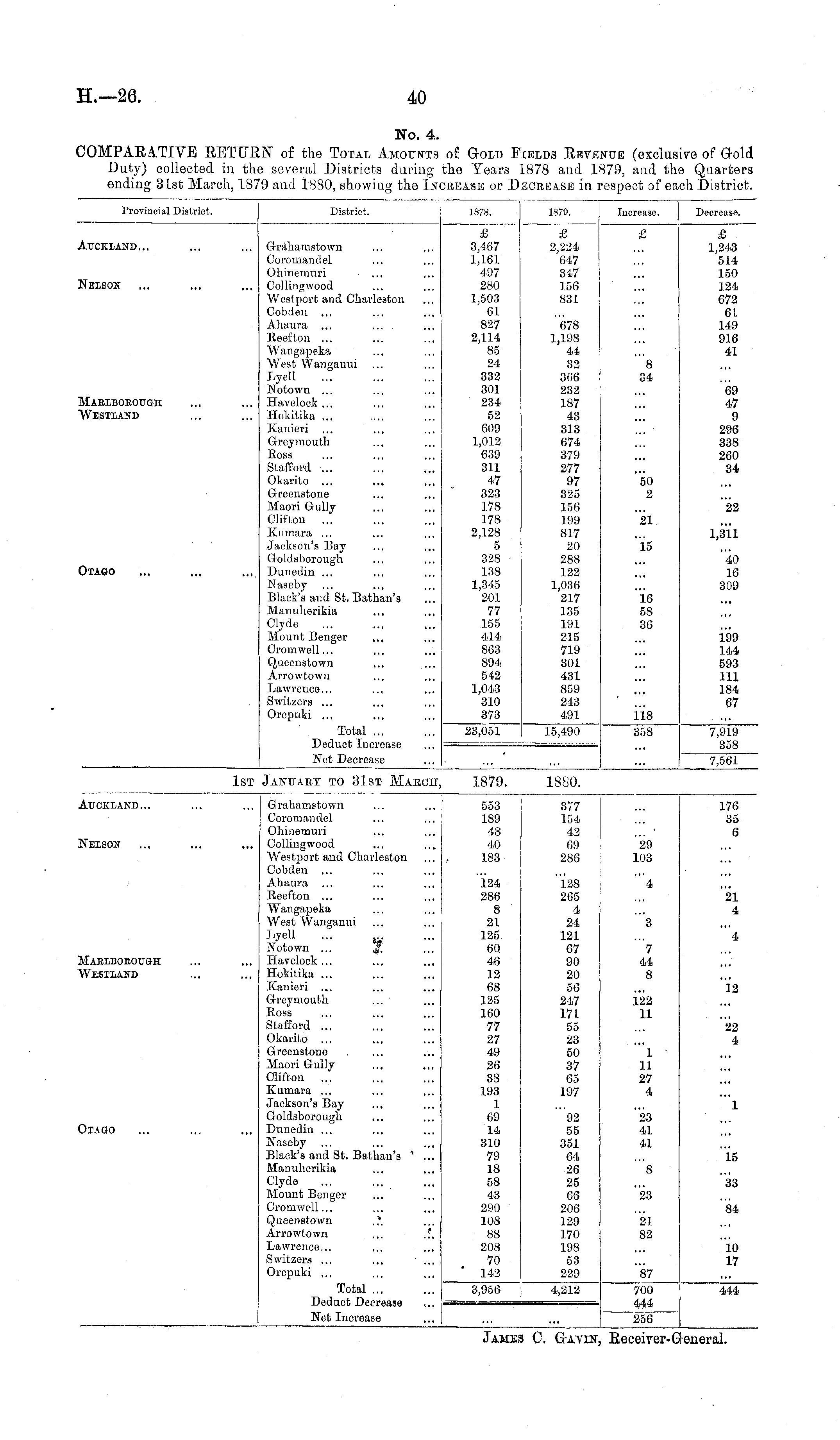 No. 4. COMPARATIVE RETURN of the Total Amounts of Gold Fields Revenue (exclusive of Gold Duty) collected in the several Districts during the Years 1878 and 1879, and the Quarters ending 31st March, 1879 and 1880, showing the Increase or Decrease in respect of each District.