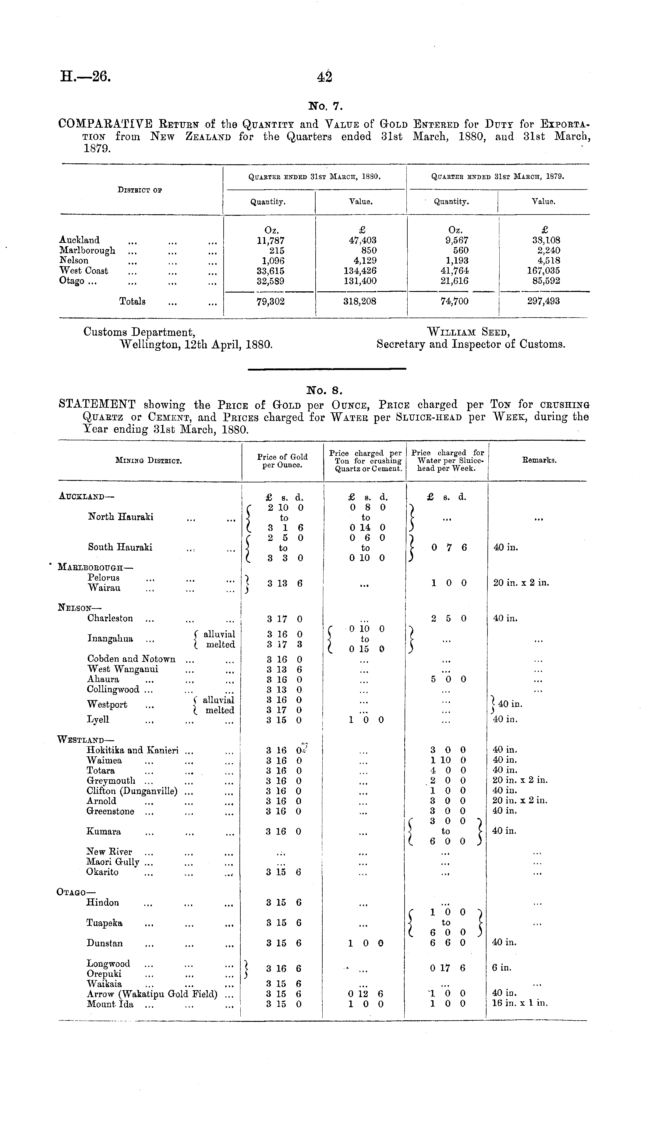 No. 7. COMPARATIVE Return of the Quantity and Value of Gold Entered for Duty for Exportation from New Zealand for the Quarters ended 31st March, 1880, and 31st March, 1879.