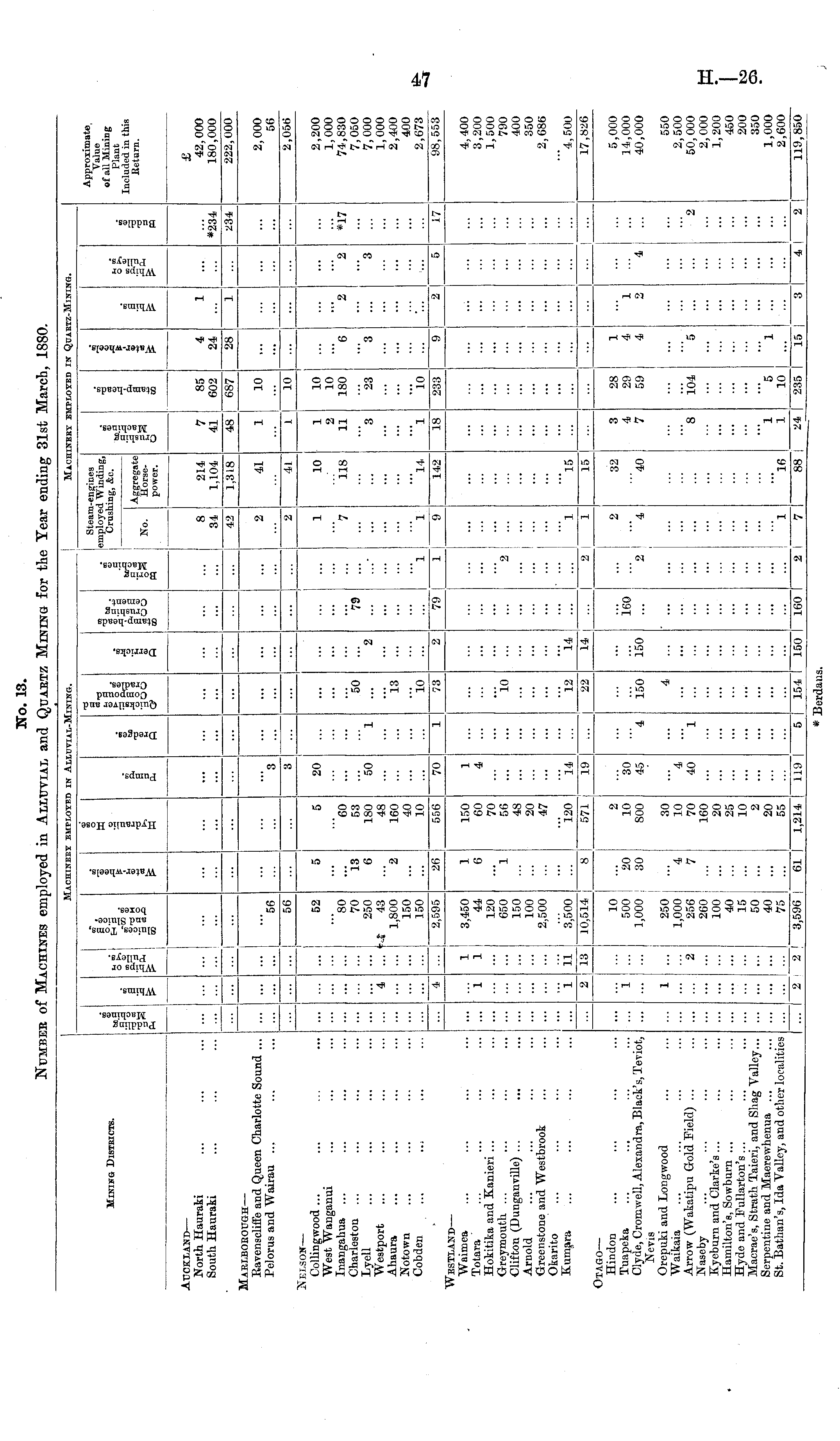 No. 13. Number of Machines employed in Alluvial and Quartz Mining for the Year ending 31st March, 1880. Machinery employed in Alluvial-Mining. Machinery employed in Quartz-Mining.