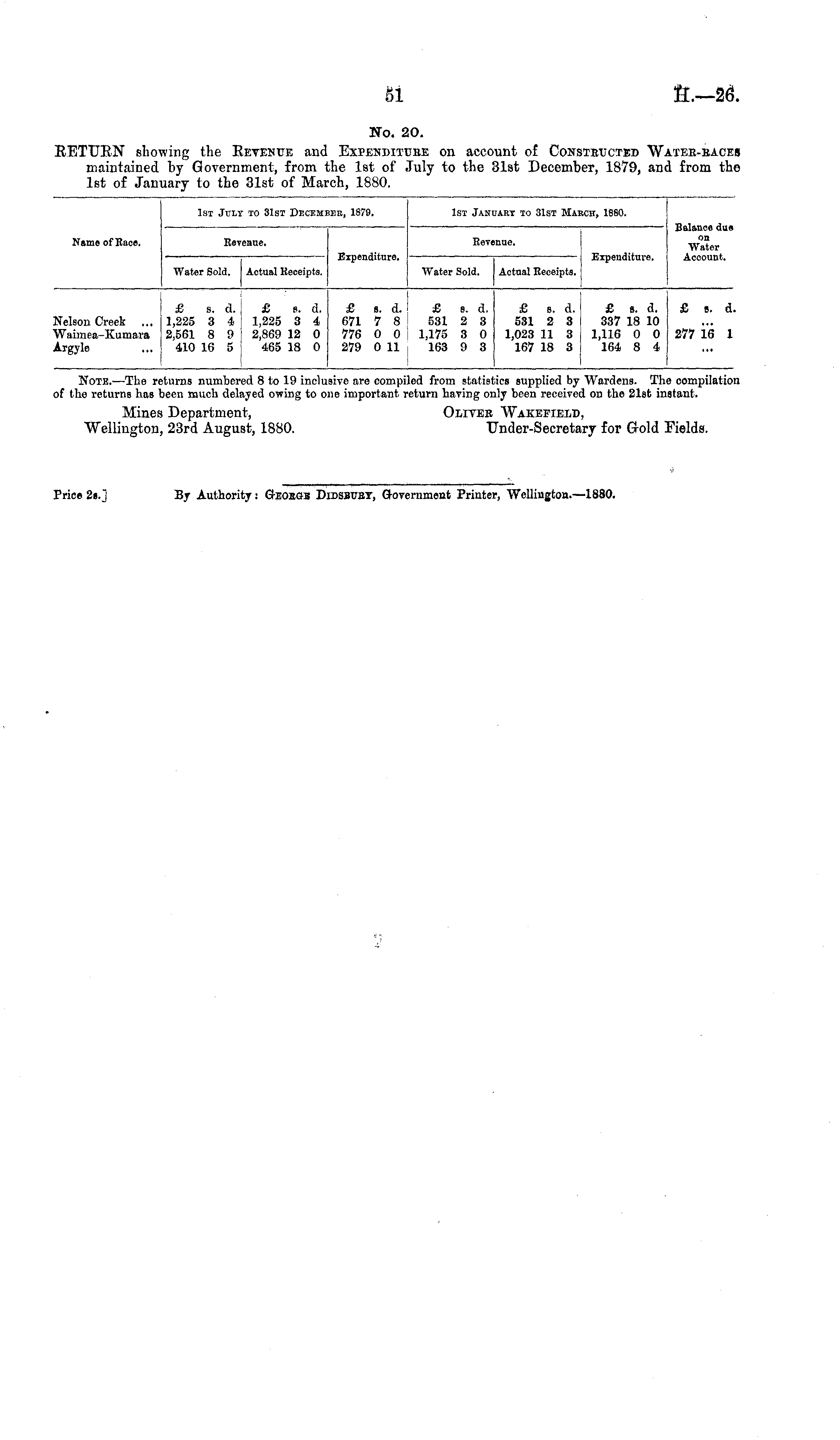 No. 20. RETURN showing the Revenue and Expenditure on account of Constructed Water-races maintained by Government, from the 1st of July to the 31st December, 1879, and from the 1st of January to the 31st of March, 1880.