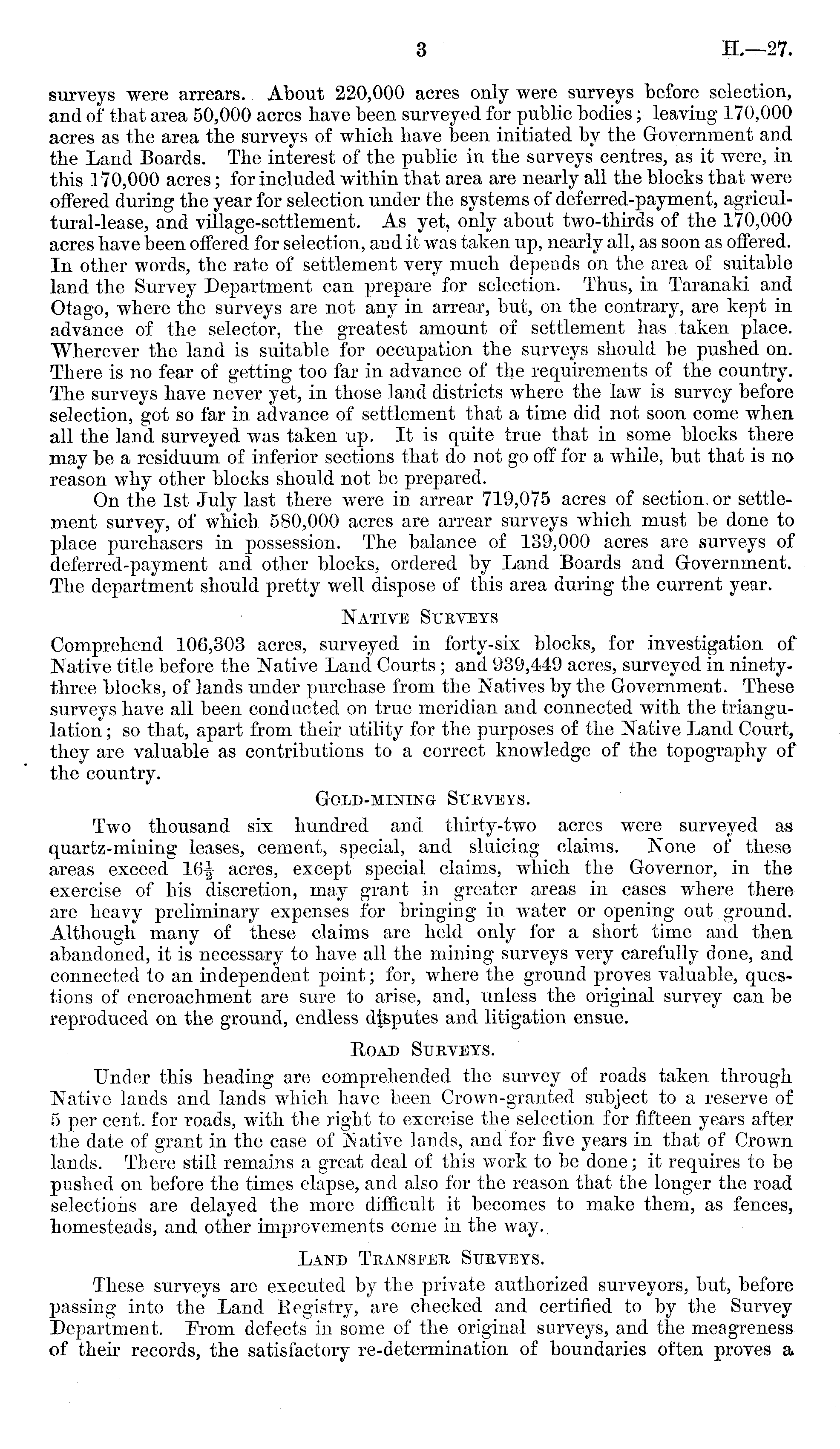 surveys were arrears. About 220,000 acres only were surveys before selection, and of that area 50,000 acres have been surveyed for public bodies; leaving 170.000 acres as the area the surveys of which have been initiated by the Government and the Land Boards. The interest of the public in the surveys centres, as it were, in this 170,000 acres; for included within that area are nearly all the blocks that were offered during the year for selection under the systems of deferred-payment, agricul-tural-lease, and village-settlement. As yet, only about two-thirds of the 170,000 acres have been offered for selection, and it was taken up, nearly all, as soon as offered. In other words, the rate of settlement very much depends on the area of suitable land the Survey Department can prepare for selection. Thus, in Taranaki and Otago, where the surveys are not any in arrear, but, on the contrary, are kept in advance of the selector, the greatest amount of settlement has taken place. Wherever the land is suitable for occupation the surveys should be pushed on. There is no fear of getting too far in advance of the requirements of the country. The surveys have never yet, in those land districts where the law is survey before selection, got so far in advance of settlement that a time did not soon come when all the land surveyed was taken up. It is quite true that in some blocks there may be a residuum of inferior sections that do not go off for a while, but that is no reason why other blocks should not be prepared. On the Ist July last there were in arrear 719,075 acres of section, or settlement survey, of which 580,000 acres are arrear surveys which must be done to place purchasers in possession. The balance of 139,000 acres are surveys of deferred-payment and other blocks, ordered by Land Boards and Government. The department should pretty well dispose of this area during the current year. Native Surveys Comprehend 106,303 acres, surveyed in forty-six blocks, for investigation of Native title before the Native Land Courts ; and 939,449 acres, surveyed in ninetythree blocks, of lands under purchase from the Natives by the Government. These surveys have all been conducted on true meridian and connected with the triangulation; so that, apart from their utility for the purposes of the Native Land Court, they are valuable as contributions to a correct knowledge of the topography of the country. Gold-mining Surveys. Two thousand six hundred and thirty-two acres were surveyed as quartz-mining leases, cement, special, and sluicing claims. None of these areas exceed 16^ acres, except special claims, which the Governor, in the exercise of his discretion, may grant in greater areas in cases where there are heavy preliminary expenses for bringing in water or opening out ground. Although many of these claims are held only for a short time and then abandoned, it is necessary to have all the mining surveys very carefully done, and connected to an independent point; for, where the ground proves valuable, questions of encroachment are sure to arise, and, unless the original survey can be reproduced on the ground, endless disputes and litigation ensue. Road Surveys. Under this heading are comprehended the survey of roads taken through Native lands and lands which have been Crown-granted subject to a reserve of 5 per cent, for roads, with the right to exercise the selection for fifteen years after the date of grant in the case of Isativc lands, and for five years in that of Crown lands. There still remains a great deal of this work to be done; it requires to be pushed on before the times elapse, and also for the reason that the longer the road selections are delayed the more difficult it becomes to make them, as fences, homesteads, and other improvements come in the way.. Land Transfer Surveys. These surveys are executed by the private authorized surveyors, but, before passing into the Land Eegistry, are checked and certified to by the Survey Department. From defects in some of the original surveys, and the meagreness of their records, the satisfactory re-determination of boundaries often proves a