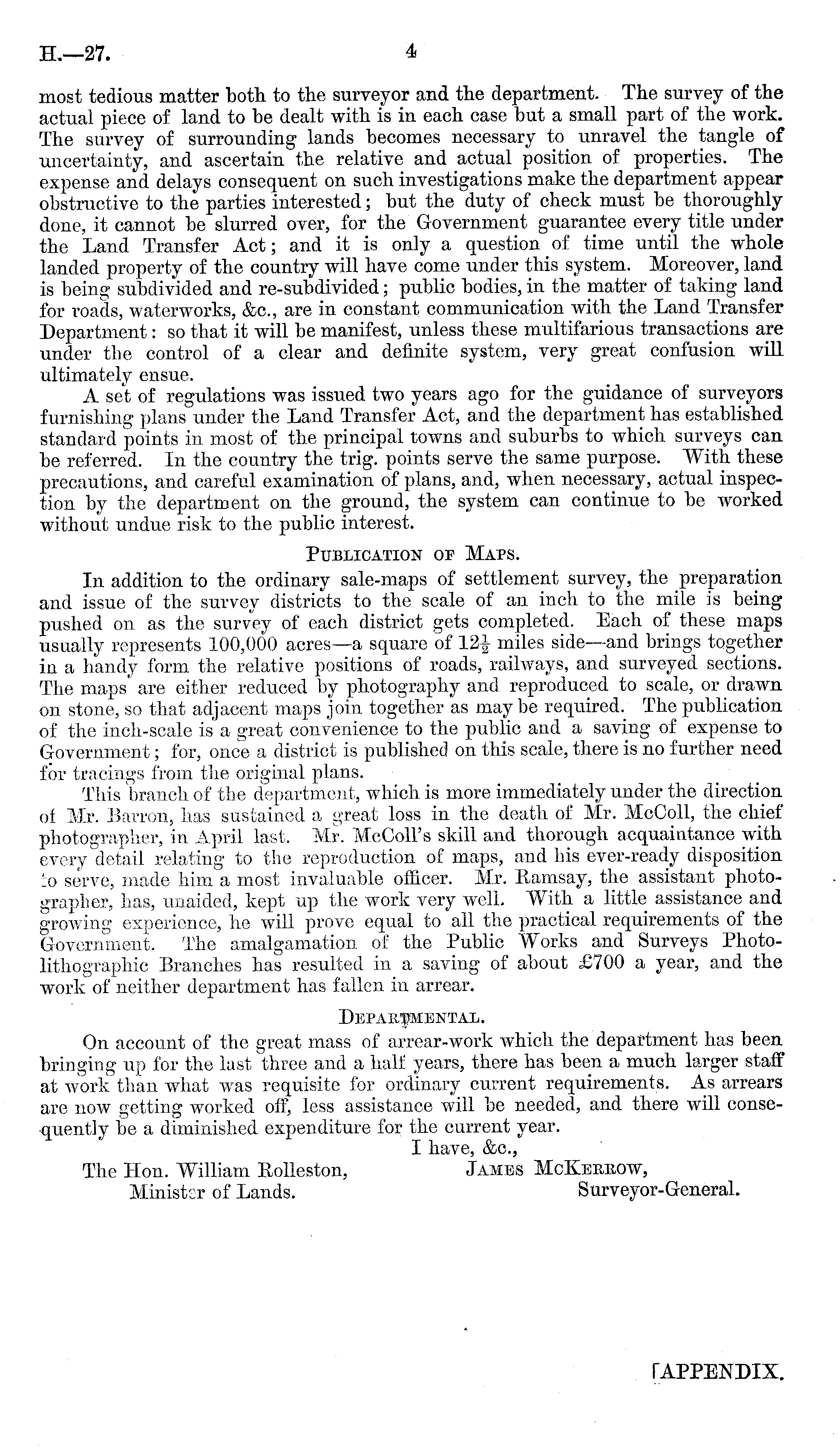 most tedious matter both to the surveyor and the department. The survey of the actual piece of land to be dealt with is in each case but a small part of the work. The survey of surrounding lands becomes necessary to unravel the tangle of uncertainty, and ascertain the relative and actual position of properties. The expense and delays consequent on such investigations make the department appear obstructive to the parties interested; but the duty of check must be thoroughly done, it cannot be slurred over, for the Government guarantee every title under the Land Transfer Act; and it is only a question of time until the whole landed property of the country will have come under this system. Moreover, land is being subdivided and re-subdivided; public bodies, in the matter of taking land for roads, waterworks, &c, are in constant communication with the Land Transfer Department: so that it will be manifest, unless these multifarious transactions are under the control of a clear and definite system, very great confusion will ultimately ensue. A set of regulations was issued two years ago for the guidance of surveyors furnishing plans under the Land Transfer Act, and the department has established standard points in most of the principal towns and suburbs to which surveys can be referred. In the country the trig, points serve the same purpose. With these precautions, and careful examination of plans, and, when necessary, actual inspection by the department on the ground, the system can continue to be worked without undue risk to the public interest. Publication of Maps. In addition to the ordinary sale-maps of settlement survey, the preparation and issue of the survey districts to the scale of an inch to the mile is being pushed on as the survey of each district gets completed. Each of these maps usually represents 100,000 acres—a square of 12|- miles side—and brings together in a handy form the relative positions of roads, railways, and surveyed sections. The maps' are either reduced by photography and reproduced to scale, or drawn on stone, so that adjacent maps join together as maybe required. The publication of the inch-scale is a great convenience to the public and a saving of expense to Government; for, once a district is published on this scale, there is no further need for tracings from the original plans. This branch of the department, which is more immediately under the direction of Mr. Barron, has sustained a great loss in the death of Mr. McColl, the chief photographer, in April last. Mr. McColl's skill and thorough acquaintance with every detail relating to the reproduction of maps, and his ever-ready disposition :o serve, made him a most invaluable officer. Mr. Ramsay, the assistant photographer, has, unaided, kept up the work very welL "With a little assistance and growing experience, he will prove equal to all the practical requirements of the Government. The amalgamation of the Public Works and Surveys Photolithographic Branches has resulted in a saving of about £700 a year, and the work of neither department has fallen in arrear. DEPARTMENTAL. On account of the great mass of arrear-work which the department has been bringing up for the last three and a half years, there has been a much larger staff at work than what was requisite for ordinary current requirements. As arrears are now getting worked off, less assistance will be needed, and there will consequently be a diminished expenditure for the current year. I have, &c, The Hon. William Rolleston, James McKerrow, Minister of Lands. Surveyor-General. TAPPENDIX.