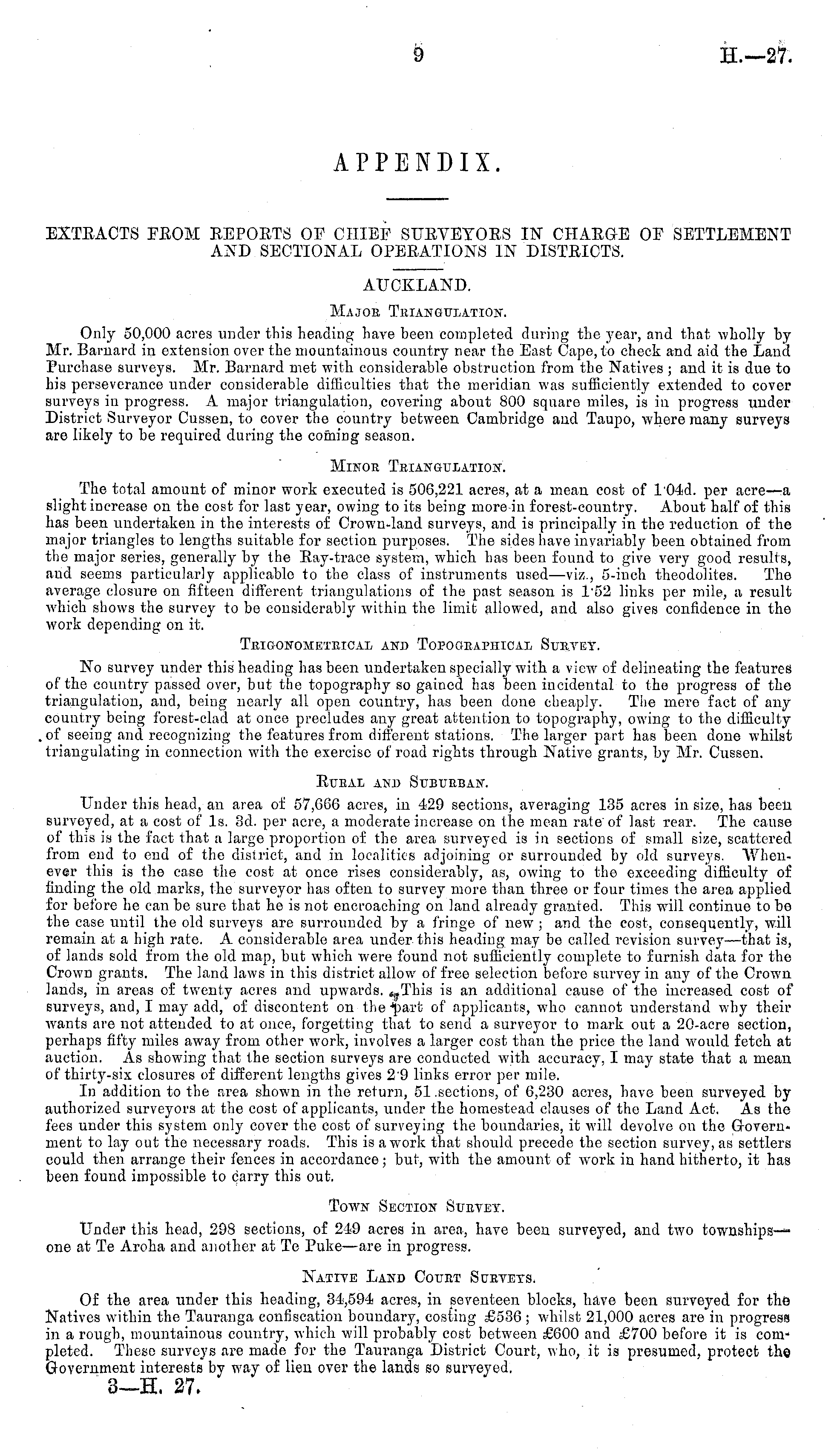 EXTRACTS FEOM KEPOBTS OF CHIEF SUEVETOES IN CHARGE OP SETTLEMENT AND SECTIONAL OPERATIONS IN DISTRICTS. AUCKLAND. Major Tbiangtji/Ation. Only 50,000 acres under this heading have been completed during the year, and that wholly by Mr. Barnard in extension over the mountainous country near the East Cape, to check and aid the Land Purchase surveys. Mr. Barnard met with considerable obstruction from the Natives ; and it is due to hia perseverance under considerable difficulties that the meridian was sufficiently extended to cover surveys in progress. A major triangulation, covering about 800 square miles, is in progress under District Surveyor Cusson, to cover the country between Cambridge and Taupo, where many surveys are likely to be required during the coming season. MINOE TkIANQULATION. The total amount of minor work executed is 506,221 acres, at a mean cost of 104 d. per acre—a slight increase on the cost for last year, owing to its being more in forest-country. About half of this has been undertaken in the interests of Crown-land surveys, and is principally in the reduction of the major triangles to lengths suitable for section purposes. The sides have invariably been obtained from the major series, generally by the Eay-trace system, which, has been found to give very good results, aud seems particularly applicable to the class of instruments used—viz., 5-inch theodolites. The average closure on fifteen different triangulations of the past season is 152 links per mile, a result which shows the survey to be considerably within the limit allowed, and also gives confidence in the work depending on it. Tkigonometeical and Toro graphical Sukyey. No survey under this heading has been undertaken specially with a view of delineating the features of the country passed over, but the topography so gained has been incidental to the progress of the triangulation, and, being nearly all open country, has been done cheaply. The mere fact of any country being forest-clad at once precludes any great attention to topography, owing to the difficulty of seeing and. recognizing the features from different stations. The larger part has been done whilst triangulating in connection with the exercise of road rights through Native grants, by Mr. Cussen. RtTEAL AND SuBUBBAN. Under this head, an area of 57,066 acres, in 429 sections, averaging 135 acres in size, has been surveyed, at a cost of Is. 3d. per acre, a moderate increase on the mean rate'of last rear. The cause of this is the fact that a large proportion of the area surveyed is in sections of small size, scattered from end to end of the district, and in localities adjoining or surrounded by old surveys. "Whenever this is the case the cost at once rises considerably, as, owing to the exceeding difficulty of finding the old marks, the surveyor has often to survey more than three or four times the area applied for before he can be sure that he is not encroaching on land already granted. This will continue to be the case until the old surveys are surrounded by a fringe of new ; and the cost, consequently, will remain at a high rate. A considerable area under this heading may be called revision survey—that is, of lands sold from the old map, but which were found not sufficiently complete to furnish data for the Crown grants. The land laws in this district allow of free selection before survey in any of the Crown lands, in areas of twenty acres and upwards. , ; ,This is an additional cause of the increased cost of surveys, and, I may add, of discontent on the ■■part of applicants, who cannot understand why their wants are not attended to at once, forgetting that to send a surveyor to mark out a 20-acre section, perhaps fifty miles away from other work, involves a larger cost than the price the land would fetch, at auction. As showing that the section surveys are conducted with accuracy, I may state that a mean of thirty-six closures of different lengths gives 29 links error per mile. In addition to the area shown in the return, 51 .sections, of G,230 acres, have been surveyed by authorized surveyors at the cost of applicants, under the homestead clauses of the Land Act. As the fees under this system only cover the cost of surveying the boundaries, it will devolve on the Government to lay out the necessary roads. This is awrork that should precede the section survey, as settlers could then arrange their fences in accordance; but, with the amount of work in hand hitherto, it has been found impossible to carry this out. Town Section Sueyey. Under this head, 298 sections, of 249 acres in area, have been surveyed, and two townshipsone at Te Aroha and another at Te Puke —are in progress. Native Land Cottut Suevets. Of the area under this heading, 34,594 acres, in seventeen blocks, have been surveyed for the Natives within the Tauranga confiscation boundary, costing £536 ; whilst 21,000 acres are in progress in a rough, mountainous country, which will probably cost between £600 and £700 before it is completed. These surveys are made for the Tauranga District Court, who, it is presumed, protect the Government interests by way of lien over the lands so surveyed. 3—H. 27.