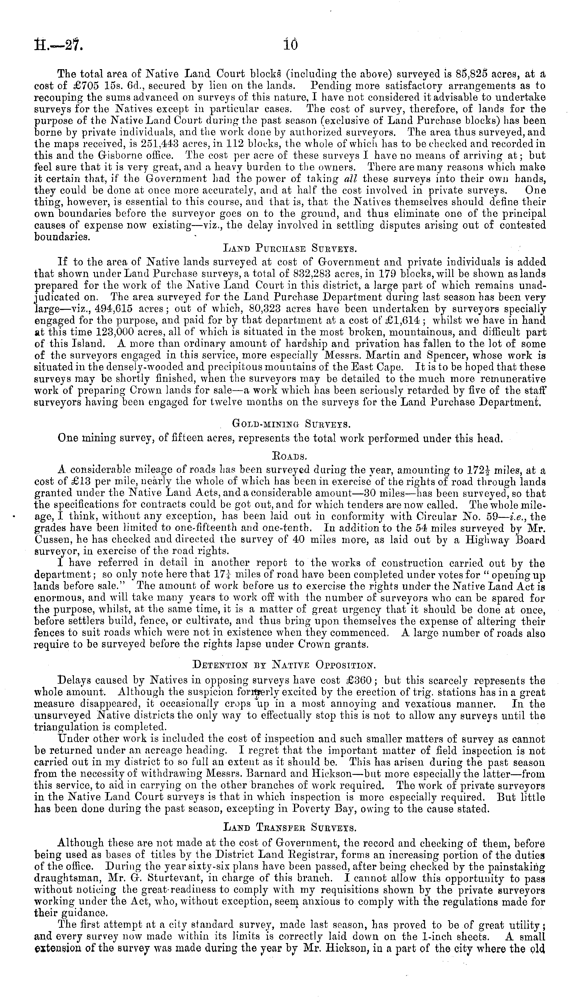 The total area of Native Land Court blocks (including the above) surveyed is 85,825 acres, at a cost of £705 15s. Gd., secured by lien on the lands. Pending more satisfactory arrangements as to recouping the sums advanced on surveys of this nature, I have not considered it advisable to undertake surveys for the Natives except in particular cases. The cost of survey, therefore, of lands for the purpose of the Native Land Court during the past season (exclusive of Land Purchase blocks) has been borne by private individuals, and the work done by authorized surveyors. The area thus surveyed, and the maps received, is 251,443 acres, in 112 blocks, the whole of which has to be checked and recorded in this and the G-isborne office. The cost per acre of these surveys I have no means of arriving at; but feel sure that it is very great, and a heavy burden to the owners. There are many reasons which make it certain that, if the Government had the power of taking all these surveys into their own hands, they could be done at once more accurately, and at half the cost involved in private surveys. One thing, however, is essential to this course, and that is, that the Natives themselves should define their own boundaries before the surveyor goes on to the ground, and thus eliminate one of the principal causes of expense now existing —viz., the delay involved in settling disputes arising out of contested boundaries. Lard Puechase Siteveys. If to the area of Native lands surveyed at cost of Government and private individuals is added that shown under Land Purchase surveys, a toial of 832,283 acres, in 179 blocks, will be shown as lands prepared for the work of the Native Land Court in this district, a large part of which remains unadjudicated on. The area surveyed for the Land Purchase Department during last season has been very large—viz., 494,615 acres; out of which, 50,323 acres have been undertaken by surveyors specially engaged for the purpose, and paid for by that department at a cost of £1,614 ; whilst we have in hand, at this time 123,000 acres, all of which is situated in the most broken, mountainous, and difficult part of this Island. A more than ordinary amount of hardship and privation has fallen to the lot of some of the surveyors engaged in this service, more especially Messrs. Martin and Spencer, whose work is situated in the densely-wooded and precipitous mountains of the East Cape. It is to be hoped that these surveys may be shortly finished, when the surveyors may be detailed to the much more remunerative work of preparing Crown lands for sale —a work which has been seriously retarded by five of the staff surveyors having been engaged for twelve months on the surveys for the Land Purchase Department. Gold-mining Sueveys. One mining survey, of fifteen acres, represents the total work performed under this head. Roads. A considerable mileage of roads lias been surveyed during the year, amounting to 172-J- miles, at a cost of £13 per mile, nearly the whole of which has been in exercise of the rights of road through lands granted under the Native Land Acts, and a considerable amount—3o miles —has been surveyed, so that the specifications for contracts could be got out, and for which tenders are now called. The whole mileage, I think, without any exception, has been laid out in conformity with Circular No. 59 — i.e., the grades have been limited to one-fifteenth and one-tenth. In addition to the 54 miles surveyed by Mr. Cussen, he has checked and directed the survey of 40 miles more, as laid out by a Highway Board surveyor, in exercise of the road rights. 1 have referred in detail in another report to the works of construction carried out by the department; so only note here that 17J miles of road have been completed under votes for " opening up lands before sale." The amount of work before us to exercise the rights under the Native Land Act is enormous, and will take many years to work off with the number of surveyors who can be spared for the purpose, whilst, at the same time, it is a matter of great urgency that it should be done at once, before settlers build, fence, or cultivate, and thus bring upon themselves the expense of altering their fences to suit roads which were not in existence when they commenced. A largo number of roads also require to be surveyed before the rights lapse under Crown grants. Detention bt Natite Opposition. Delays caused by Natives in opposing surveys have cost £300; but this scarcely represents the whole amount. Although the suspicion formerly excited by the erection of trig, stations has in a great measure disappeared, it occasionally crops up in a most annoying and vexatious manner. In the unsurveyed Native districts the only way to effectually stop this is not to allow any surveys until the triangulation is completed. ITnder other work is included the cost of inspection and such smaller matters of survey as cannot be returned under an acreage heading. I regret that the important matter of field inspection is not carried out in my district to so full an extent as it should be. This has arisen during the past season from the necessity of withdrawing Messrs. Barnard and Hickson—but more especially the latter —from this service, to aid in carrying on the other branches of work required. The work of private surveyors in the Native Land Court surveys is that in which inspection is more especially required. But little has been done during the past season, excepting in Poverty Bay, owing to the cause stated. Land Teansfee Stjeveys. Although these are not made at the cost of Government, the record and checking of them, before being used as bases of titles by the District Land Eegistrar, forms an increasing portion of the duties of the office. During the year sixty-six plans have been passed, after being checked by the painstaking draughtsman, Mr. Gr. Sturtevant, in charge of this branch. I cannot allow this opportunity to pass without noticing the