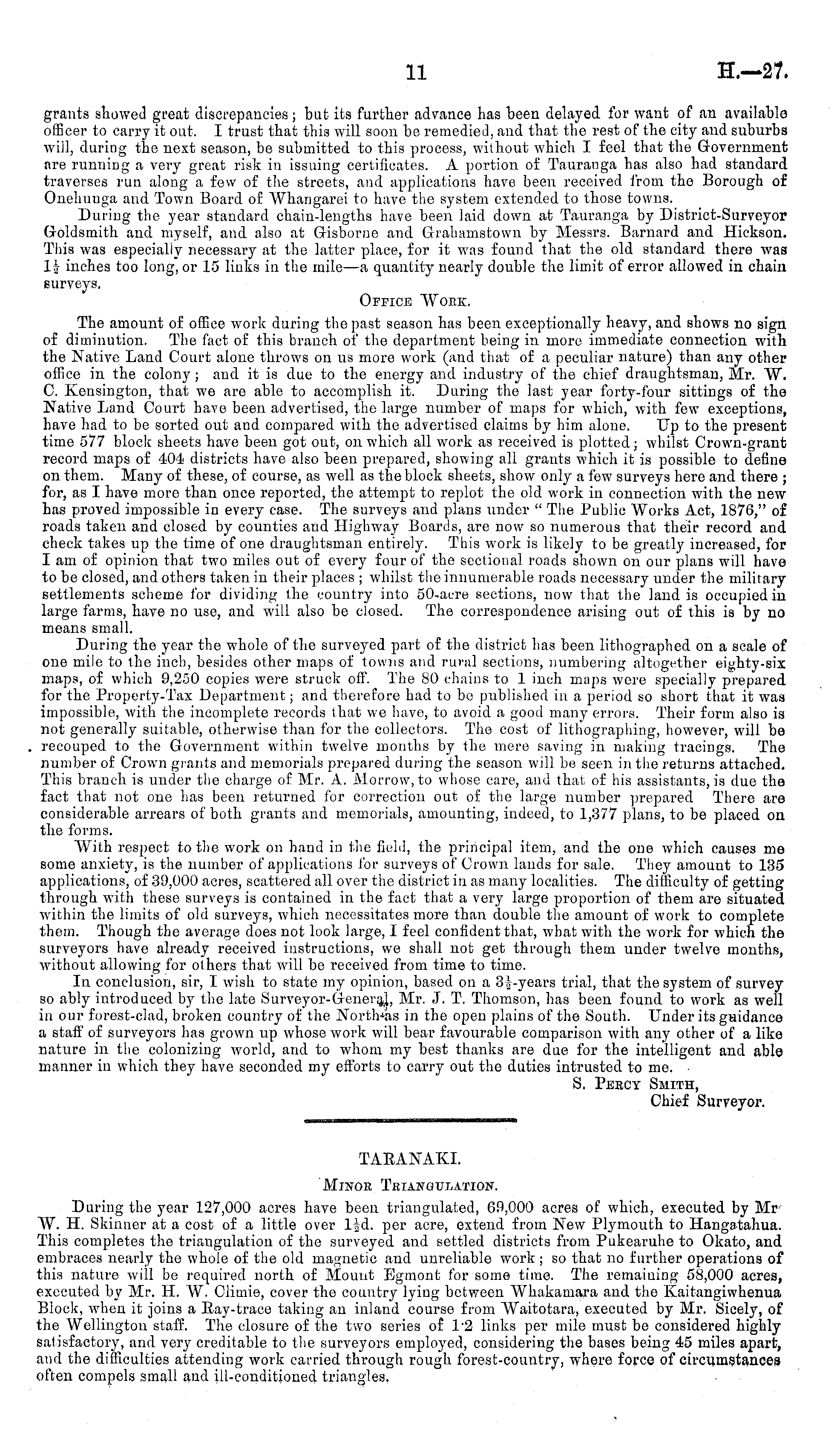 grants showed great discrepancies; but its further advance has been delayed for want of an available officer to carry it out. I trust that this will soon be remedied, and that the rest of the city and suburbs will, during the next season, be submitted to this process, without which I feel that the Government are running a very great risk in issuing certificates. A portion of Tauranga has also had standard traverses run along a few of the streets, and applications have been received from the Borough of OneUuuga and Town Board of Whangarei to have the system extended to those towns. During the year standard chain-lengths have been laid down at Tauranga by District-Surveyor Goldsmith and myself, and also at Gisborue and Grahamstown by Messrs. Barnard and Hiekson. This was especially necessary at the latter place, for it was found that the old standard there was li inches too long, or 15 links in the mile —a quantity nearly double the limit of error allowed in chain surveys. Office "Work. The amount of office work during the past season has been exceptionally heavy, and shows no sign of diminution. The fact of this branch of the department being in more immediate connection with the Native Land Court alone throws on us more work (and that of a peculiar nature) than any other office in the colony ; and it is due to the energy and industry of the chief draughtsman, Mr. W. C. Kensington, that we are able to accomplish it. During the last year forty-four sittings of the Native Land Court have been advertised, the large number of maps for which, with few exceptions, have had to be sorted out and compared with the advertised claims by him alone. Up to the present time 577 block sheets have been got out, on which all work as received is plotted; whilst Crown-grant record maps of 404 districts have also been prepared, showing all grants which it is possible to define on them. Many of these, of course, as well as the block sheets, show only a few surveys here and there ; for, as I have more than once reported, the attempt to replot the old work in connection with the new has proved impossible in every case. The surveys and plans under " The Public Works Act, 1876," o£ roads taken and closed by counties and Highway Boards, are now so numerous that their record and check takes up the time of one draughtsman entirely. This work is likely to be greatly increased, for I am of opinion that two miles out of every four of the sectional roads shown on our plans will have to be closed, and others taken in their places ; whilst the innumerable roads necessary under the military settlements scheme for dividing the country into 50-aere sections, now that the land is occupied in large farms, have no use, and will also be closed. The correspondence arising out of this is by no means small. During the year the whole of the surveyed part of the district has been lithographed on a scale of one mile to the inch, besides other maps of towns and rural sections, numbering altogether eighty-six maps, of which 9,250 copies were struck off. The 80 chains to 1 inch maps were specially prepared for the Property-Tax Department; and therefore had to bo published in a period so short that it was impossible, with the incomplete records that we have, to avoid a good many errors. Their form also is not generally suitable, otherwise than for the collectors. The cost of lithographing, however, will be recouped to the Government within twelve months by the mere saving in making tracings. The number of Crown grants and memorials prepared during the season will be seen in the returns attached. This branch is under the charge of Mr. A. Morrow, to whose care, and that of his assistants, is due the fact that not one has been returned for correction out of the large number prepared There are considerable arrears of both grants and memorials, amounting, indeed, to 1,377 plans, to be placed on the forms. With respect to the work on hand in the field, the principal item, and the one which causes me some anxiety, is the number of applications for surveys of Crown lands for sale. They amount to 135 applications, of 39,000 acres, scattered all over the district in as many localities. The difficulty of getting through with these surveys is contained in the fact that a very large proportion of them are situated within the limits of old surveys, which necessitates more than double the amount of work to complete them. Though the average does not look large, I feel confident that, what with the work for which the surveyors have already received instructions, we shall not get through them under twelve months, without allowing for others that will be received from time to time. In conclusion, sir, I wish to state my opinion, based on a 3|-years trial, that the system of survey so ably introduced by the late Surveyor-General, Mr. J. T. Thomson, has been found to work as well in our forest-clad, broken country of the North-as in the open plains of the South. Under its guidance a staff of surveyors has grown up whose work will bear favourable comparison with any other of a like nature in the colonizing world, and to whom my best thanks are due for the intelligent and able manner in which they have seconded my efforts to carry out the duties intrusted to me. 8. Pekcy Smith, Chief Surveyor.