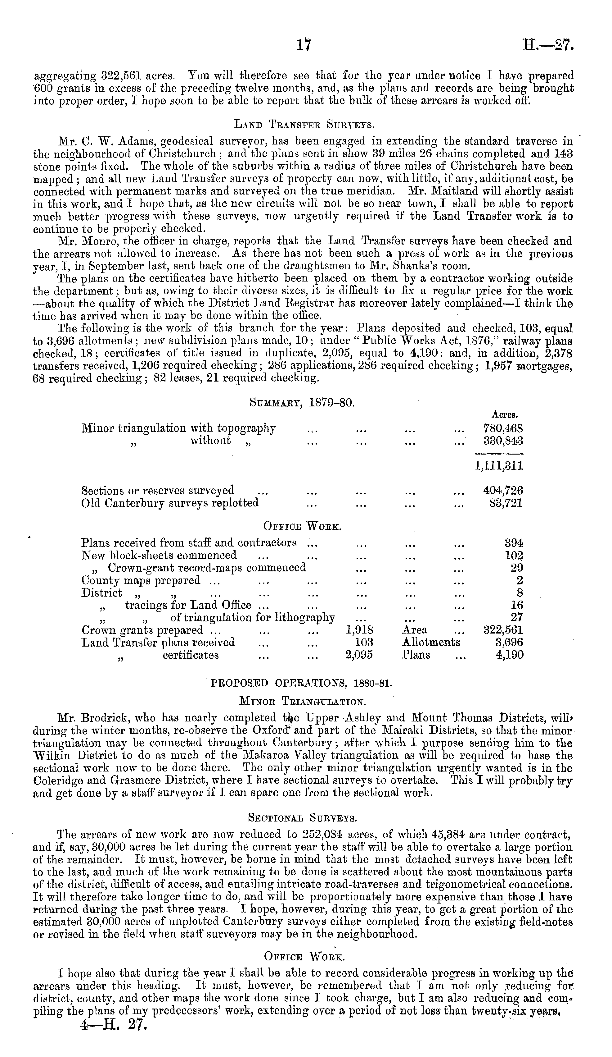 aggregating 322,561 acres. You will therefore see that for the year under notice I have prepared 600 grants in excess of the preceding twelve months, and, as the plans and records are being brought into proper order, I hope soon to be able to report that the bulk of these arrears is worked oft". Land Teansfeb, Sueveys. Mr. C. W. Adams, geodesical surveyor, has been engaged in extending the standard traverse in the neighbourhood of Christchurch ; and the plans sent in show 39 miles 26 chains completed and 143 stone points fixed. The whole of the suburbs within a radius of three miles of Christchurch have been mapped ; and all new Land Transfer surveys of property can now, with little, if any, additional cost, be connected with permanent marks and surveyed on the true meridian. Mr. Maitland will shortly assist in this work, and I hope that, as the new circuits will not be so near town, I shall be able to report much better progress with these surveys, now urgently required if the Land Transfer work is to continue to be properly checked. Mr. Mouro, the officer in charge, reports that the Land Transfer surveys have been checked and the arrears not allowed to increase. As there has not been such a press of work as in the previous year, I, in September last, sent back one of the draughtsmen to Mr. (Shanks's room. The plans on the certificates have hitherto been placed on them by a contractor working outside the department; but as, owing to their diverse sizes, it is difficult to fix a regular price for the work ■ —about the quality of which the District Land Registrar has moreover lately complained—l think the time has arrived when it may be done within the office. The following is the work of this branch for the year: Plans deposited and checked, 103, equal to 3,696 allotments ; new subdivision plans made, 10 ; under " Public Works Act, 1876," railway plans checked, 18; certificates of title issued in duplicate, 2,095, equal to 4,190: and, in addition, 2,378 transfers received, 1,206 required checking; 286 applications, 286 required checking; 1,957 mortgages, 68 required checking; 82 leases, 21 required checking. Summary, 1879-80. Acres. Minor triangulation with topography ... ... ... ... 780,468 „ without „ ... ... ... ... 330,843 1,111,311 Sections or reserves surveyed ... ... ... ... ... 404,726 Old Canterbury surveys replotted ... ... ... ... 83,721 Office Woek. Plans received from staff and contractors ... ... ... ... 394 New block-sheets commenced ... ... ... ... ... 102 „ Crown-grant record-maps commenced ... ... ... 29 County maps prepared ... ... ... ... ... ... 2 District „ „ ... ... ... ... ... ... 8 „ tracings for Land Office ... ... ... ... ... 16 „ „ of triangulation for lithography ... ... ... 27 Crown grants prepared ... ... ... 1,918 Area ... 322,561 Land Transfer plans received ... ... 103 Allotments 3,696 „ certificates ... ... 2,095 Plans ... 4,190 PROPOSED OPERATIONS, 1880-81. Minor Teiangulation. Mr. Brodrick, who has nearly completed the Upper Ashley and Mount Thomas Districts, will' during the winter months, re-observe the Oxford' and part of the Mairaki Districts, so that the minor triaugulation may be connected throughout Canterbury; after which I purpose sending him to the Wilkin District to do as much of the Makaroa Valley triangulation as will be required to base the sectional work now to be done there. The only other minor triangulation urgently wanted is in the Coleridge and G-rasmere District, where I have sectional surveys to overtake. This I will probably try and get done by a staff surveyor if I can spare one from the sectional work. Sectional Stteyeys. The arrears of new work are now reduced to 252,034 acres, of which 45,384 are under contract, and if, say, 30,000 acres be let during the current year the staff will be able to overtake a large portion of the remainder. It must, however, be borne in mind that the most detached surveys have been left to the last, and much of the work remaining to be done is scattered about the most mountainous parts of the district, difficult of access, and entailing intricate road-traverses and trigonometrical connections. It will therefore take longer time to do, and will be proportionately more expensive than those I have returned during the past three years. I hope, however, during this year, to get a great portion of the estimated 30,000 acres of unplotted Canterbury surveys either completed from the existing field-notea or revised in the field when staff surveyors may be in the neighbourhood. Office Woek. 1 hope also that during the year I shall be able to record considerable progress in working up the arrears under this heading. It must, however, be remembered that lam not only reducing for. district, county, and other maps the work done since I took charge, but I am also reducing and compiling the plans of my predecessors' work, extending over a period of not less than twenty-six years, 4—H. 27.