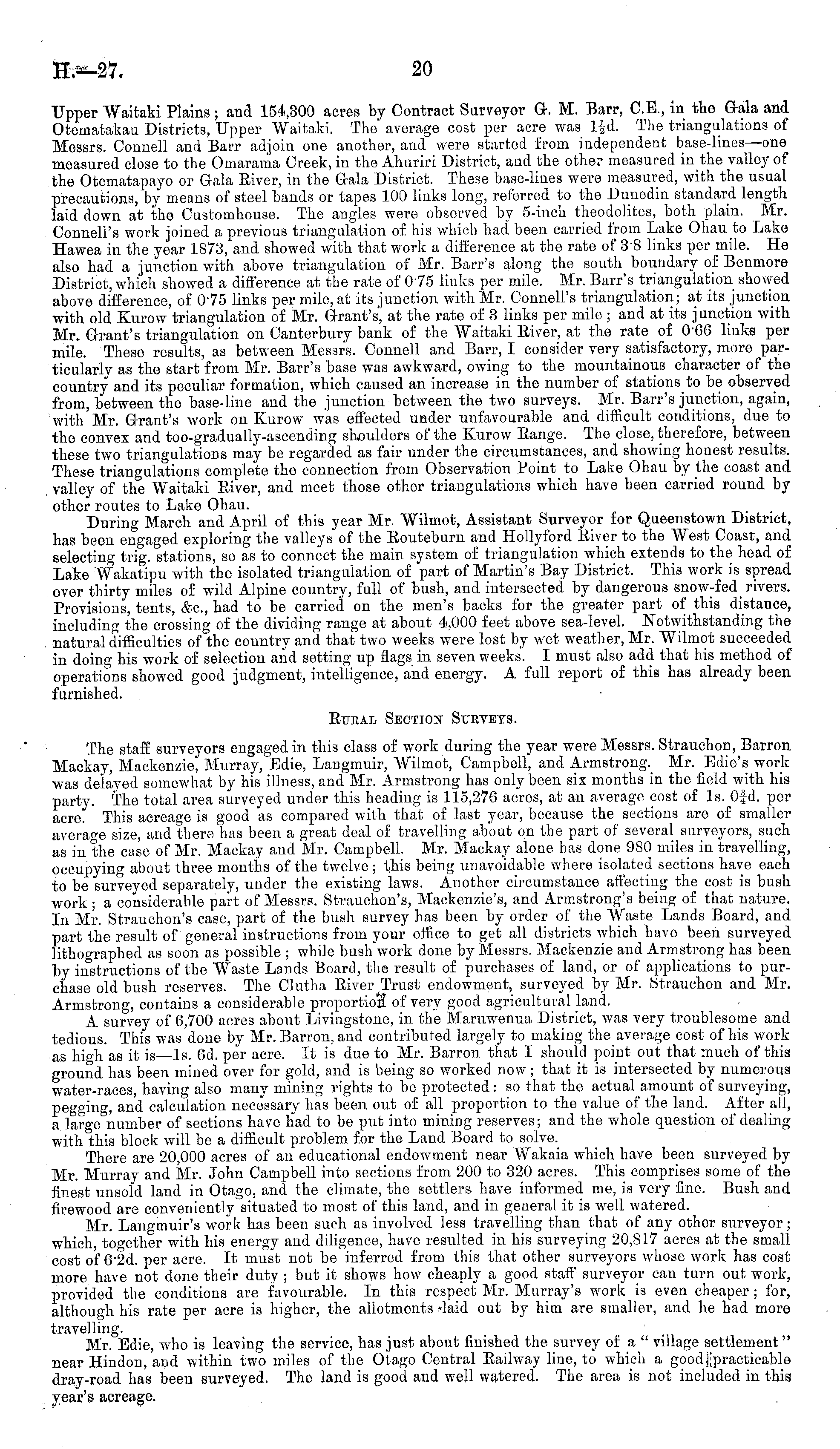 Upper Waitaki Plains; and 154,300 acres by Contract Surveyor G-. M. Barr, C.E., in the Gala and Otematakau Districts, Upper Waitaki. The average cost per acre was l£d. The triangulations of Messrs. Connell and Barr adjoin one another, and were started from independent base-lines—one measured close to the Omarama Creek, in the Ahuriri District, and the other measured in the valley of the Otematapayo or Gala Eiver, in the Gala District. These base-lines were measured, with the usual precautions, by means of steel bands or tapes 100 links long, referred to the Dunedin standard length laid down at the Customhouse. The angles were observed by 5-inch theodolites, both plain. Mr. Connell's work joined a previous triangulation of his which had been carried from Lake Ohau to Lake Hawea in the year 1873, and showed with that work a difference at the rate of 3'B links per mile. He also had a junction with above triangulation of Mr. Barr's along the south boundary of Benmore District, which showed a difference at the rate of 075 links per mile. Mr. Barr's triangulation showed above difference, of 075 links per mile, at its junction with Mr. Connell's triangulation; at its junction with old Kurow triangulation of Mr. Grant's, at the rate of 3 links per mile ; and at its junction with Mr. Grant's triangulation on Canterbury bank of the Waitaki Eiver, at the rate of 066 links per mile. These results, as between Messrs. Connell and Barr, I consider very satisfactory, more particularly as the start from Mr. Barr's base was awkward, owing to the mountainous character of the country and its peculiar formation, which caused an increase in the number of stations to be observed from, between the base-line and the junction between the two surveys. Mr. Barr's junction, again, with Mr. Grant's work on Kurow was effected under unfavourable and difficult conditions, due to the convex and too-gradually-ascending shoulders of the Kurow Eange. The close, therefore, between these two triangulations may be regarded as fair under the circumstances, and showing honest results. These triangulations complete the connection from Observation Point to Lake Ohau by the coast and valley of the Waitaki Eiver, and meet those other triangulations which have been carried round by other routes to Lake Ohau. During March and April of this year Mr. Wilmot, Assistant Surveyor for Queenstown District, has been engaged exploring the valleys of the Eouteburn and Hollyford Eiver to the West Coast, and selecting trig, stations, so as to connect the main system of triangulation which extends to the head of Lake "Wakatipu with the isolated triangulation of part of Martin's Bay District. This work is spread over thirty miles of wild Alpine country, full of bush, and intersected by dangerous snow-fed rivers. Provisions, tents, &c, had to be carried on the men's backs for the greater part of this distance, including the crossing of the dividing range at about 4,000 feet above sea-level. Notwithstanding the natural difficulties of the country and that two weeks were lost by wet weather, Mr. Wilmot succeeded in doing his work of selection and setting up flags in seven weeks. I must also add that his method of operations showed good judgment, intelligence, and energy. A full report of this has already been furnished. Etjeal Section Stjevets. The staff surveyors engaged in this class of work during the year were Messrs. Strauchon, Barron Mackay, Mackenzie, Murray, Edie, Langmuir, Wilmot, Campbell, and Armstrong. Mr. Edie's work was delayed somewhat by his illness, and Mr. Armstrong has only been six months in the field with his party. The total area surveyed under this heading is 115,27G acres, at an average cost of Is. OJd. per acre. This acreage is good as compared with that of last year, because the sections are of smaller average size, and there has been a great deal of travelling about on the part of several surveyors, such as in the case of Mr. Maclcay and Mr. Campbell. Mr. Mackay alone has done 9SO miles in travelling, occupying about three months of the twelve; this being unavoidable where isolated sections have each to be surveyed separately, under the existing laws. Another circumstance affecting the cost is bush work ; a considerable part of Messrs. Strauchon's, Mackenzie's, and Armstrong's being of that nature. In Mr. Strauchon's case, part of the bush survey has been by order of the Waste Lands Board, and part the result of general instructions from your office to get all districts which have been surveyed lithographed as soon as possible ; while bush work done by Messrs. Mackenzie and Armstrong has been by instructions of the Waste Lands Board, the result of purchases of land, or of applications to purchase old bush reserves. The Clutha Eiver^Trust endowment, surveyed by Mr. Strauchon and Mr. Armstrong, contains a considerable proportion of very good agricultural land. A survey of 6,700 acres about Livingstone, in the Maruwenua District, was very troublesome and tedious. This was done by Mr. Barron, and contributed largely to making theaverage cost of his work as high as it is—ls. Od. per acre. It is due to Mr. Barron that I should point out that much of this ground has been mined over for gold, and is being so worked now ; that it is intersected by numerous water-races, having also many mining rights to be protected: so that the actual amount of surveying, pegging, and calculation necessary has been out of all proportion to the value of the land. After all, a large number of sections have had to be put into mining reserves; and the whole question of dealing with this block will be a difficult problem for the Land Board to solve. There are 20,000 acres of an educational endowment near Wakaia which have been surveyed by Mr. Murray and Mr. John Campbell into sections from 200 to 320 acres. This comprises some of the finest unsold land in Otago, and the climate, the settlers have informed me, is very fine. Bush and firewood are conve