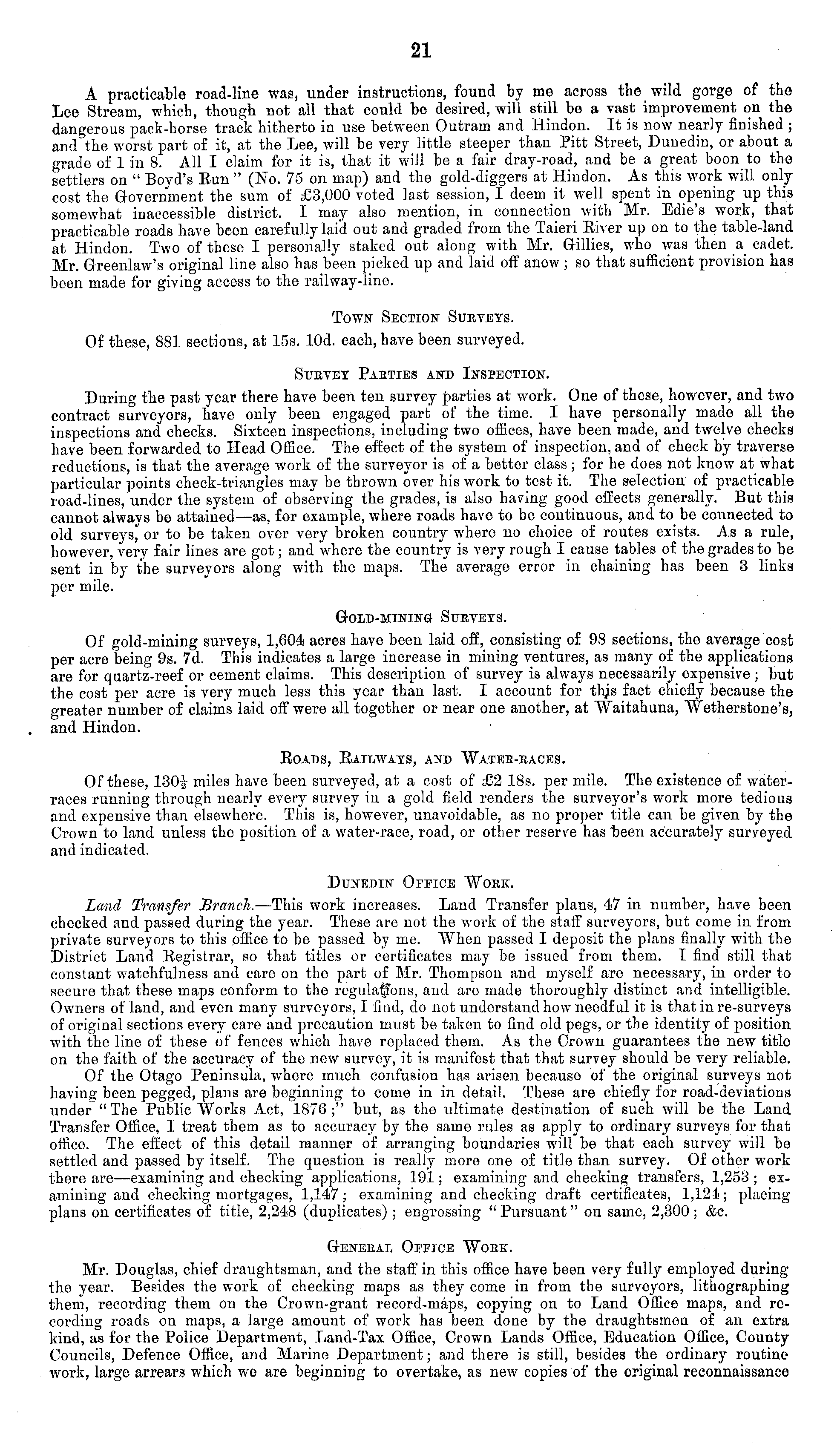 A practicable road-line was, under instructions, found by me across the wild gorge of the Lee Stream, which, though, not all that could be desired, will still be a vast improvement on the dangerous pack-horse track hitherto in use between Outram and Hindon. It is now nearly finished ; and the worst part of it, at the Lee, will be very little steeper than Pitt Street, Dunedin, or about a grade of lin 8. All I claim for it is, that it will be a fair dray-road, and be a great boon to the settlers on " Boyd's Run " (No. 75 on map) and the gold-diggers at Hindon. As this work will only cost the Government the sum of £3,000 voted last session, I deem it well spent in opening up this somewhat inaccessible district. I may also mention, in connection with Mr. Edie's work, that practicable roads have been carefully laid out and graded from the Taieri Eiver up on to the table-land at Hindon. Two of these I personally staked out along with Mr. Gillies, who was then a cadet. Mr. Greenlaw's original line also has been picked up and laid off anew ; so that sufficient provision has been made for giving access to the railway-line. Town Section Sueveys. Of these, 881 sections, at 15s. lOd. each, have been surveyed. Siteyey Paeties and Inspection. During the past year there have been ten survey parties at work. One of these, however, and two contract surveyors, have only been engaged part of the time. I have personally made all the inspections and checks. Sixteen inspections, including two offices, have been made, and twelve checks have been forwarded to Head Office. The effect of the system of inspection, and of check by traverse reductions, is that the average work of the surveyor is of a better class ; for he does not know at what particular points check-triangles may be thrown over his work to test it. The selection of practicable road-lines, under the system of observing the grades, is also having good effects generally. But this cannot always be attained —as, for example, where roads have to be continuous, and to be connected to old surveys, or to be taken over very broken country where no choice of routes exists. As a rule, however, very fair lines are got; and where the country is very rough I cause tables of the grades to be sent in by the surveyors along with the maps. The average error in chaining has been 3 links per mile. Gold-mining Siteyeys. Of gold-mining surveys, 1,604 acres have been laid off, consisting of 98 sections, the average cost per acre being 9s. 7d. This indicates a large increase in mining ventures, as many of the applications are for quartz-reef or cement claims. This description of survey is always necessarily expensive ; but the cost per acre is very much less this year than last. I account for thjs fact chiefly because the greater number of claims laid off were all together or near one another, at Waitahuna, Wetherstone's, and Hindon. Eoads, Railways, and Watee-kaces. Of these, 130-a- miles have been surveyed, at a cost of £2 18s. per mile. The existence of waterraces running through nearly every survey in a gold field renders the surveyor's work more tedious and expensive than elsewhere. This is, however, unavoidable, as no proper title can be given by the Crown to land unless the position of a water-race, road, or other reserve has been accurately surveyed and indicated. Dunedin Office Woek. Land Transfer Branch. —This work increases. Land Transfer plans, 47 in number, have been checked and passed during the year. These are not the work of the staff surveyors, but come in from private surveyors to this office to be passed by me. When passed I deposit the plans finally with the District Land Registrar, so that titles or certificates may be issued from them. I find" still that constant watchfulness and care on the part of Mr. Thompson and myself are necessary, in order to secure that these maps conform to the regulations, and are made thoroughly distinct and intelligible. Owners of land, and even many surveyors, I find, do not understand how needful it is that in re-surveys of original sections every care and precaution must be taken to find old pegs, or the identity of position with the line of these of fences which have replaced them. As the Crown guarantees the new title on the faith of the accuracy of the new survey, it is manifest that that survey should be very reliable. Of the Otago Peninsula, where much confusion has arisen because of the original surveys not having been pegged, plans are beginning to come in in detail. These are chiefly for road-deviations under "The Public Works Act, 1876;" but, as the ultimate destination of such will be the Land Transfer Office, 1 treat them as to accuracy by the same rules as apply to ordinary surveys for that office. The effect of this detail manner of arranging boundaries will be that each survey will be settled and passed by itself. The question is really more one of title than survey. Of other work there are—examining and checking applications, 191; examining and checking transfers, 1,253 ; examining and checking mortgages, 1,147; examining and checking draft certificates, 1,124; placing plans on certificates of title, 2,248 (duplicates) ; engrossing " Pursuant" on same, 2,300 ; &c. Geneeal Office Woek. Mr. Douglas, chief draughtsman, and the staff in this office have been very fully employed during the year. Besides the work of checking maps as they come in from the surveyors, lithographing them, recording them on the Crown-grant record-maps, copying on to Land Office maps, and recording roads on maps, a large amount of work has been done by the draughtsmen of an extra kind, as for the Police Department, Land-Tax Office, Crown Lands Office, Education Office, County Councils, Defence Office, and Marine Department; and there is still, besides the ordinary routine work, large arrears which we are beginning to overtake, as new copies of the original reconnaissance