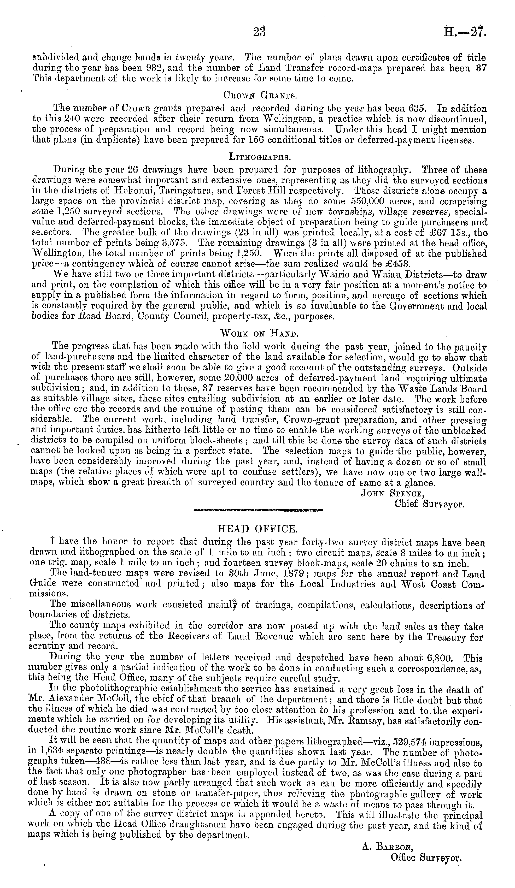 HEAD OFFICE. I have the honor to report that during the past year forty-two survey district maps have been drawn and lithographed on the scale of 1 mile to an inch ; two circuit maps, scale 8 miles to an inch ; one trig, map, scale 1 mile to an inch; and fourteen survey block-maps, scale 20 chains to an inch. The land-tenure maps were revised to 30th June, 1879; maps for the annual report and Land G-uide were constructed and printed; also maps for the Local Industries and "West Coast Commissions. The miscellaneous work consisted mainljF of tracings, compilations, calculations, descriptions of boundaries of districts. The county maps exhibited in the corridor are now posted up with the land sales as they take place, from the returns of the Eeceivers of Laud Revenue which are sent here by the Treasury for scrutiny and record. During the year the number of letters received and despatched have been about 6,800. This number gives only a partial indication of the work to be done in conducting such a correspondence, as, this being the Plead Office, many of the subjects require careful study. In the photolithographic establishment the service has sustained a very great loss in the death of Mr. Alexander McColl, the chief of that branch of the department; and there is little doubt but that the illness of which he died was contracted by too close attention to his profession and to the expert ments which he carried on for developing its utility. His assistant, Mr. Ramsay, has satisfactorily conducted the routine work since Mr. McColPs death. It will be seen that the quantity of maps and other papers lithographed—viz., 529,574 impressions, in 1,634 separate printings —is nearly double the quantities shown last year. The number of photographs taken —438 —is rather less than last year, and is due partly to Mr. McColl's illness and also to the fact that only one photographer has been employed instead of two, as was the case during a part of last season. It is also now partly arranged that such work as can be more efficiently and speedily done by hand is drawn on stone or transfer-paper, thus relieving the photographic gallery of work which is either not suitable for the process or which it would bo a waste of means to pass through it. A copy of one of the survey district maps is appended hereto. This will illustrate the principal work on which the Head Office draughtsmen have been engaged during the past year, and the kind of maps which is being published by the department. A. Baehon, Office Surveyor.