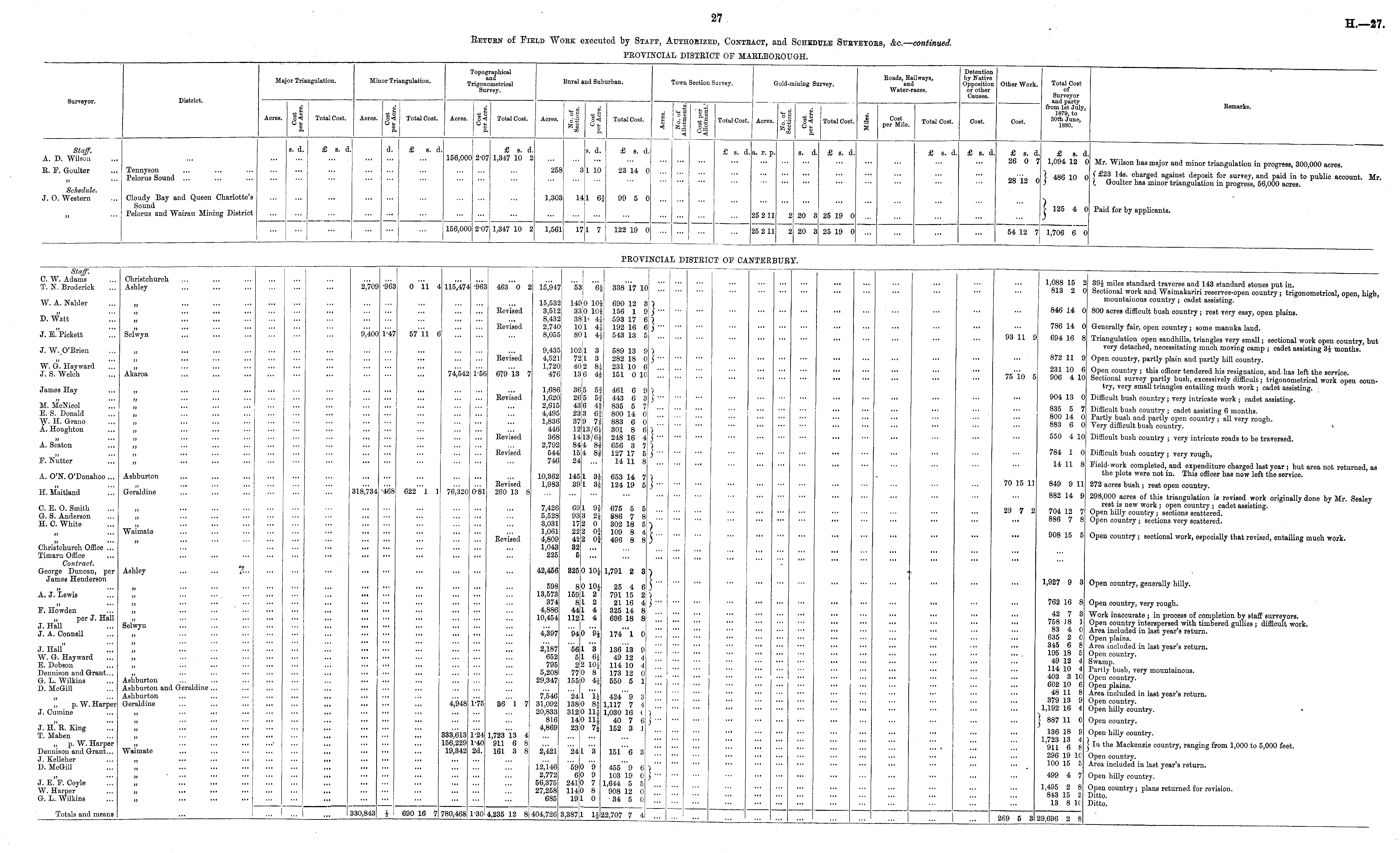 Return of Field Work executed by Staff, Authorized, Contract, and Schedule Surveyors, &c.-continued. PROVINCIAL DISTRICT OF MARLBOROUGH.